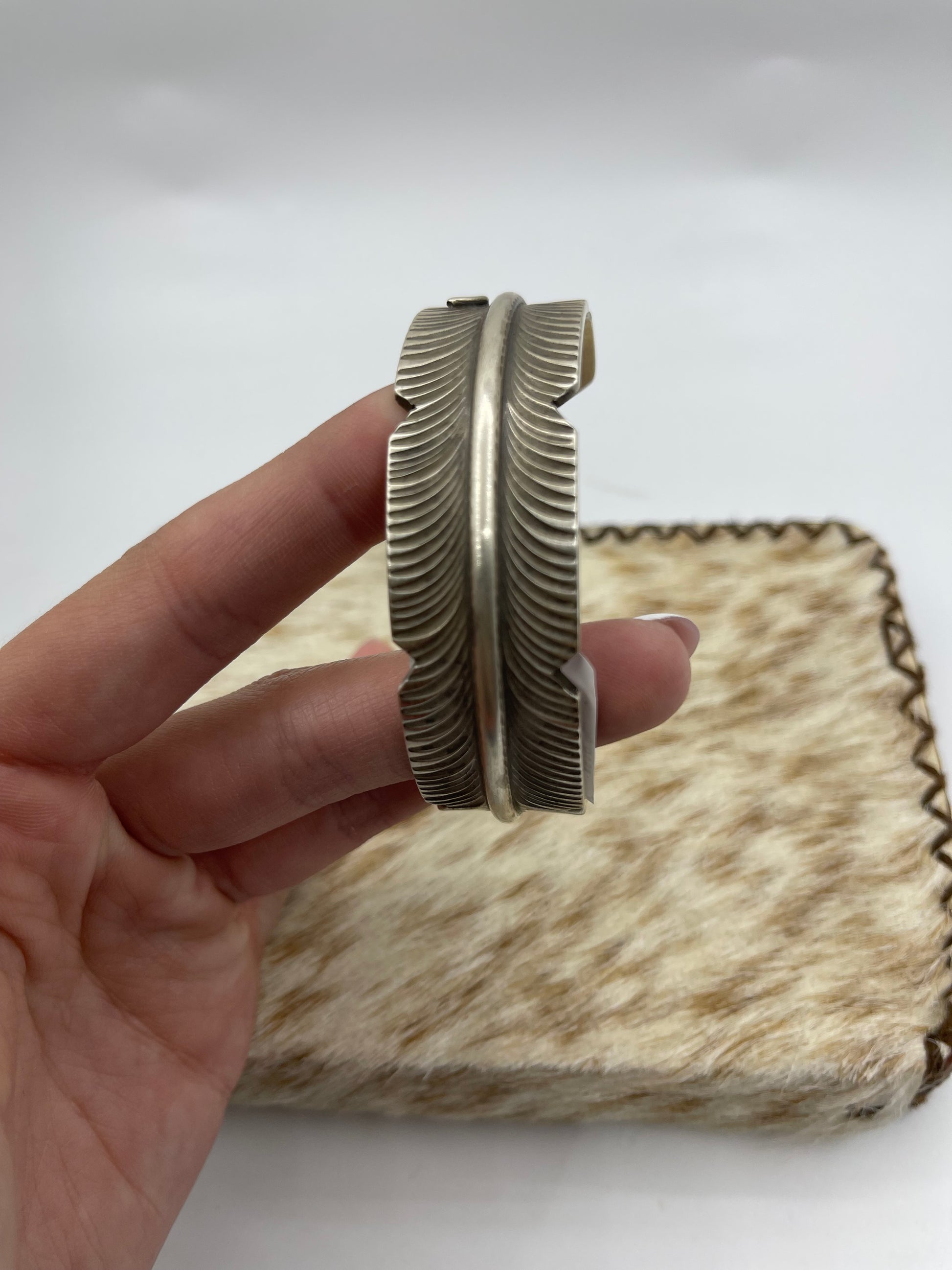 Elevate your style with this stunning 6"-7" Heavy Silver Feather Cuff crafted by C.C, a talented Navajo artisan. This substantial piece showcases exquisite silverwork in a bold feather design that commands attention. The generous size creates a dramatic statement on your wrist while honoring authentic Native American craftsmanship. A timeless investment piece that pairs beautifully with both casual and formal attire.
