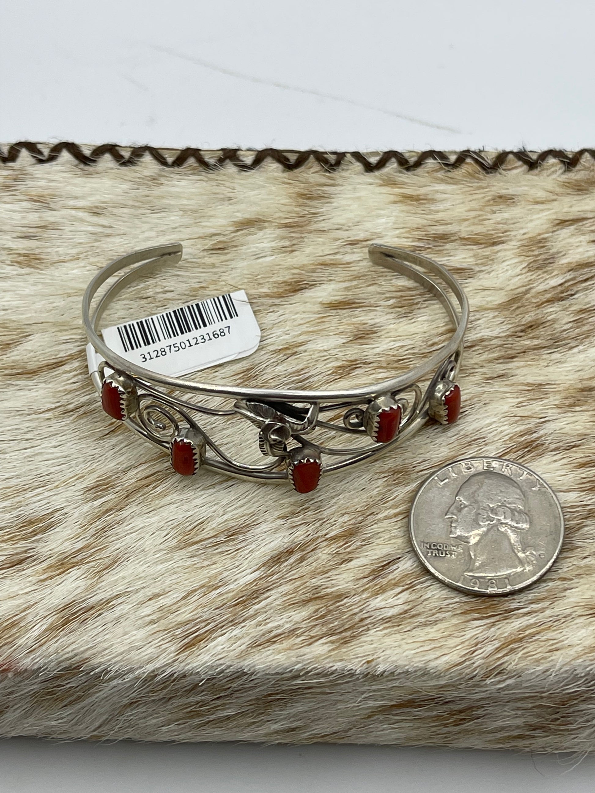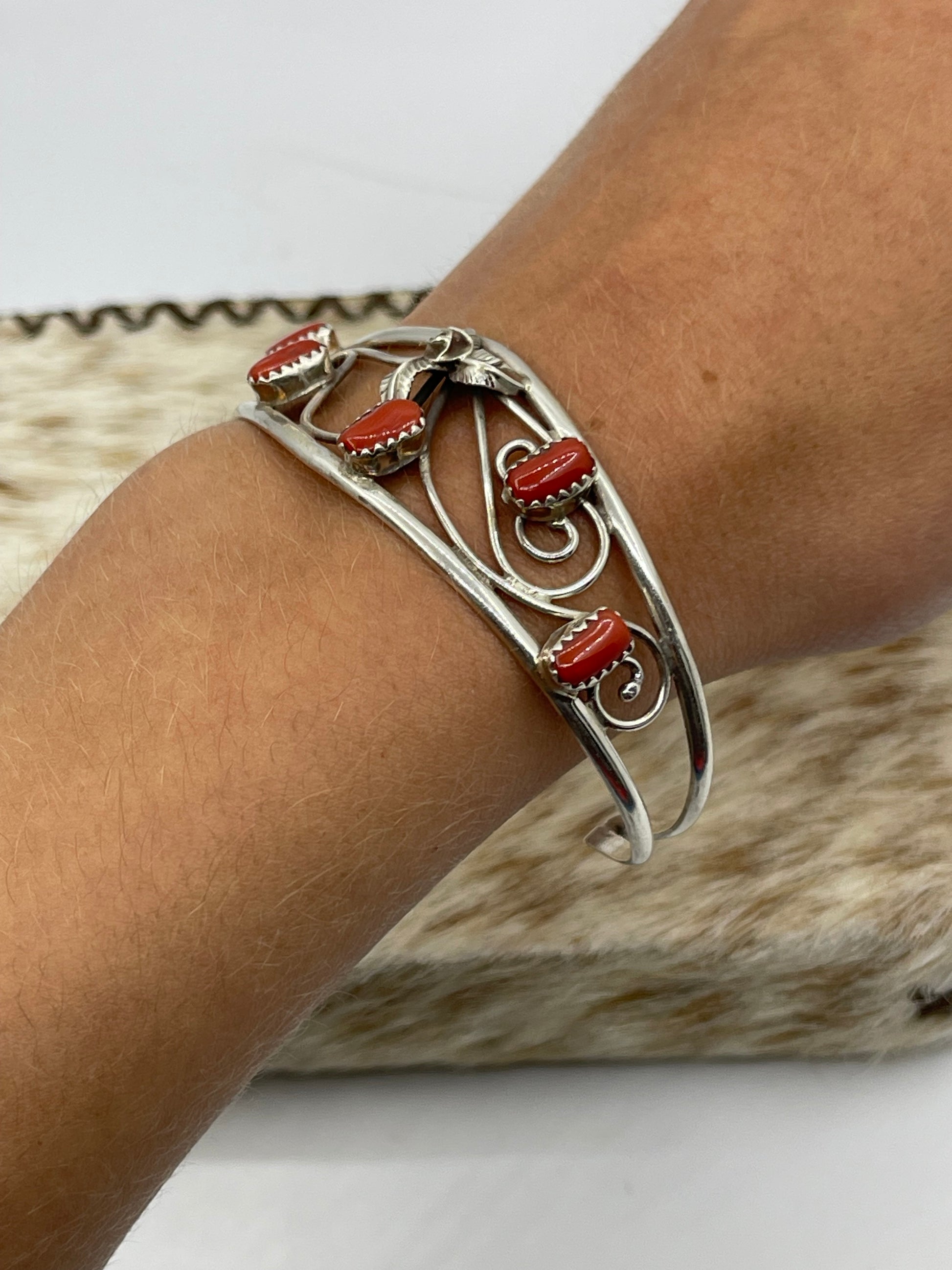 5 1/4" Red Coral 5 Stone Cuff by Carolynn Nez, Navajo