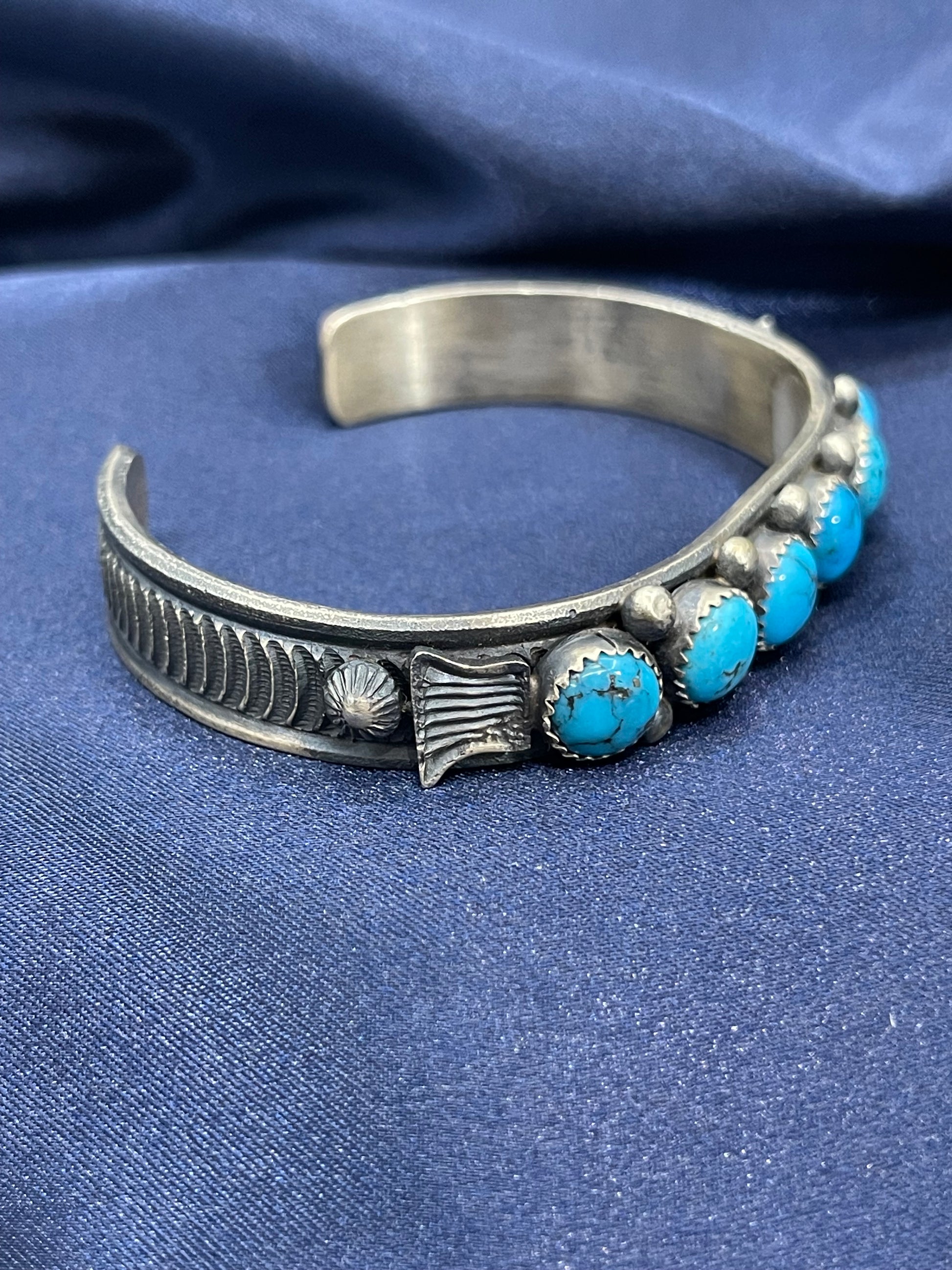 Handcrafted by renowned artisan Eva Linbert Billah, this striking cuff showcases six vibrant bright blue turquoise stones set in sterling silver. Each stone is carefully selected for its rich color and natural character, creating a bold statement piece that captures the essence of authentic Navajo craftsmanship. The comfortable 6.75" to 7.25" adjustable fit ensures it works for most wrists. Perfect for collectors who appreciate genuine artisan work and timeless southwestern style.