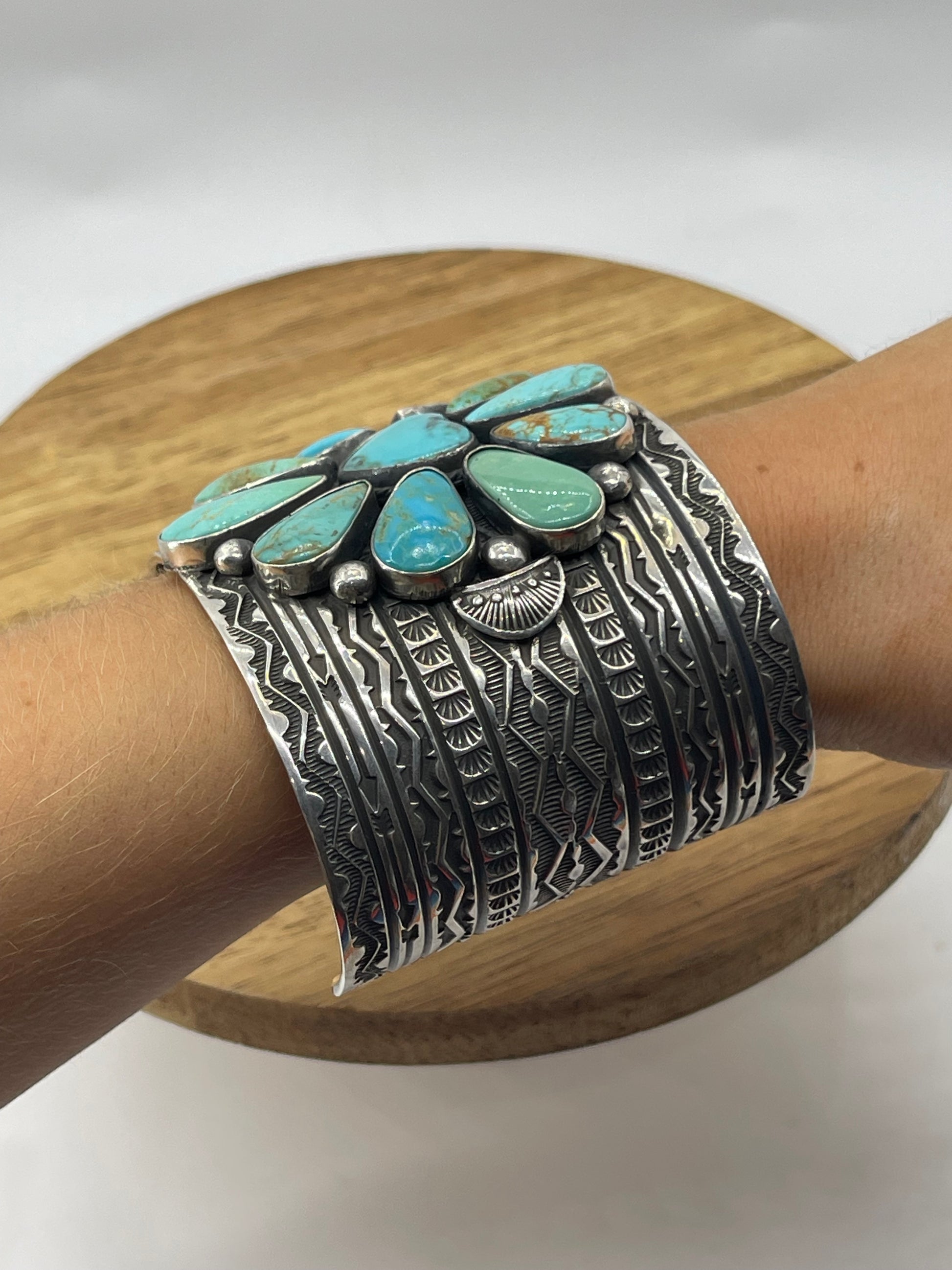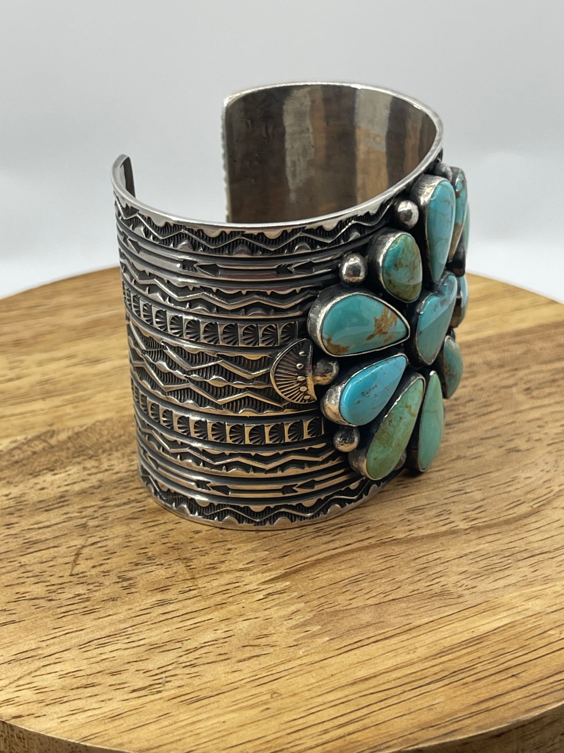 Elevate your style with the Kingman Turquoise Heart Cluster Cuff by Sunshine Reeves, a stunning piece crafted by Navajo artisans. Featuring vibrant Kingman turquoise stones arranged in a heart cluster, this cuff blends timeless beauty with cultural artistry. Its bold design adds a unique touch to any outfit, while the quality craftsmanship ensures lasting wear. Perfect for those who appreciate authentic, handcrafted jewelry that tells a story.