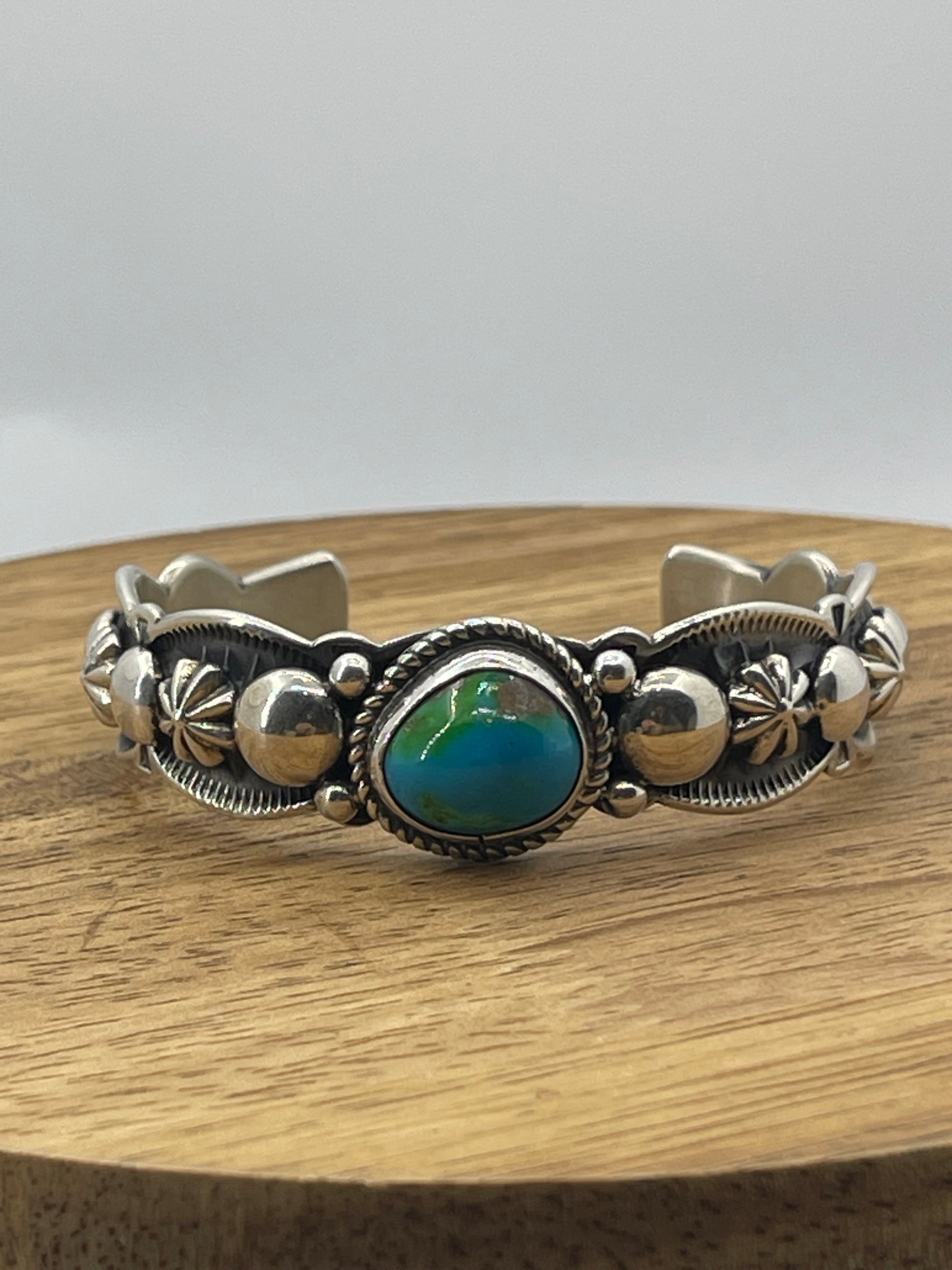Elevate your style with this 6.5" Sonoran Gold Turquoise Cuff, handcrafted by Navajo artist Roland Dixson. Featuring stunning silverwork that beautifully frames the vibrant turquoise, this piece combines traditional artistry with bold elegance. Perfect for those who appreciate unique, authentic jewelry that makes a statement with every wear.
