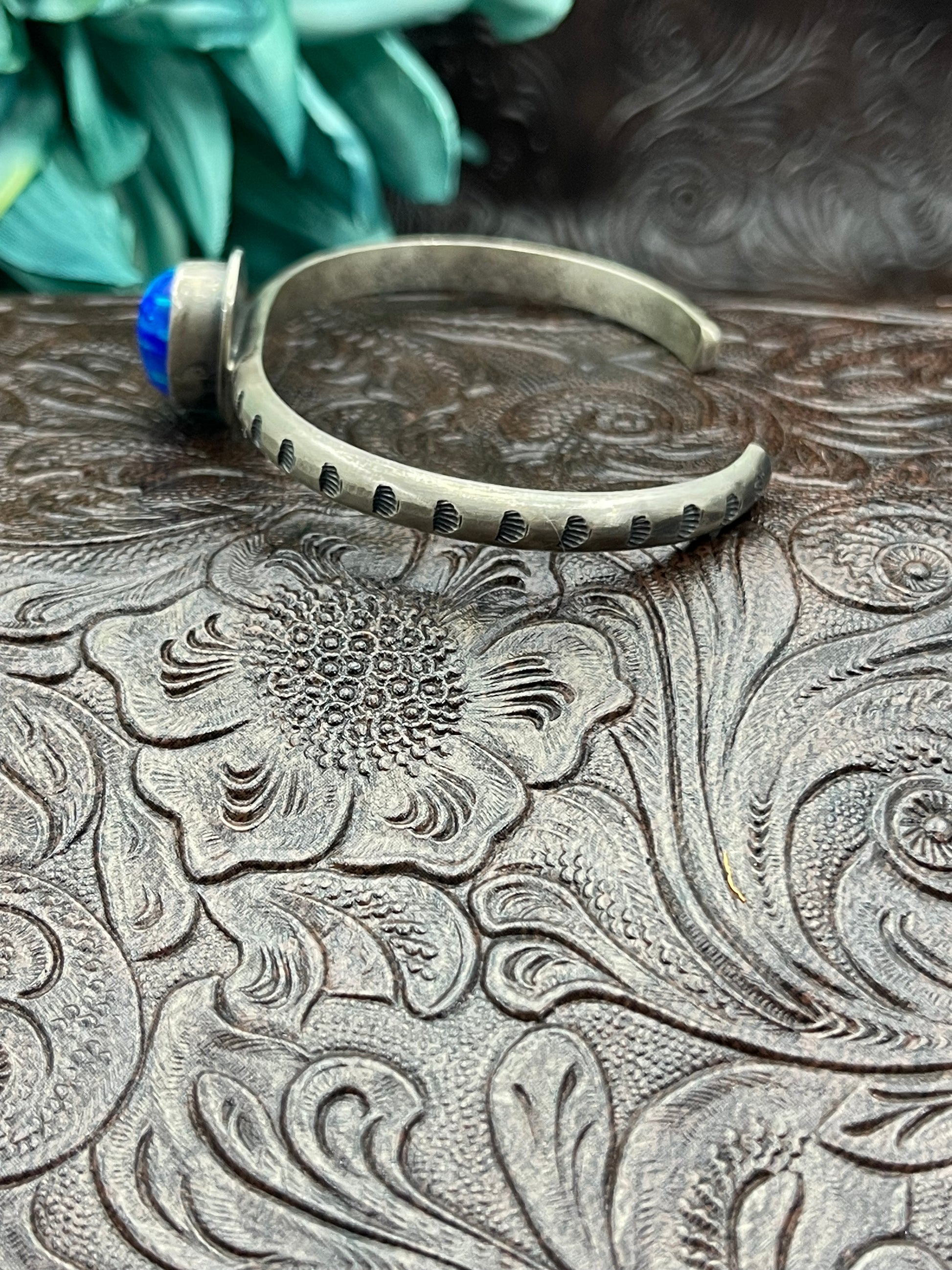 Handcrafted opal cuff bracelet featuring a striking single stone centerpiece set in sterling silver. This adjustable stamped band design showcases authentic opal's natural play of color, with traditional Native American metalwork details that celebrate artisan craftsmanship. The flexible sizing accommodates wrists from 5.75" to 7.25", making it a versatile addition to any collection. Perfect for those who appreciate genuine gemstones and the heritage behind each handmade piece.
