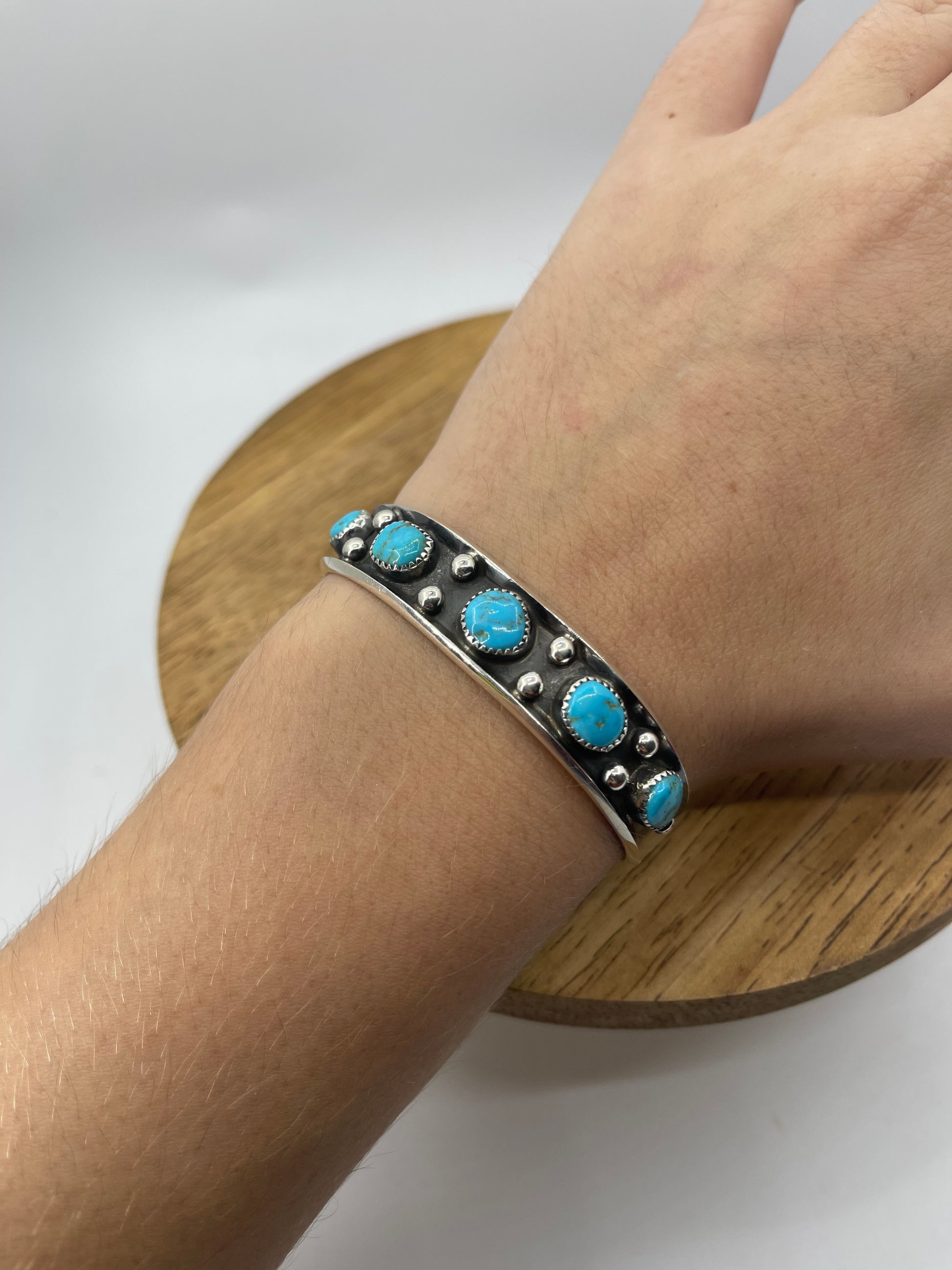 This 6.25" turquoise cuff by Navajo artist Ray King showcases five stunning stones, each uniquely vibrant. Handcrafted with traditional techniques, this piece offers authentic Southwestern elegance that complements any style. Its comfortable fit and striking design make it an essential accessory for those seeking bold, timeless artistry. Elevate your collection with genuine craftsmanship that tells a story with every wear.