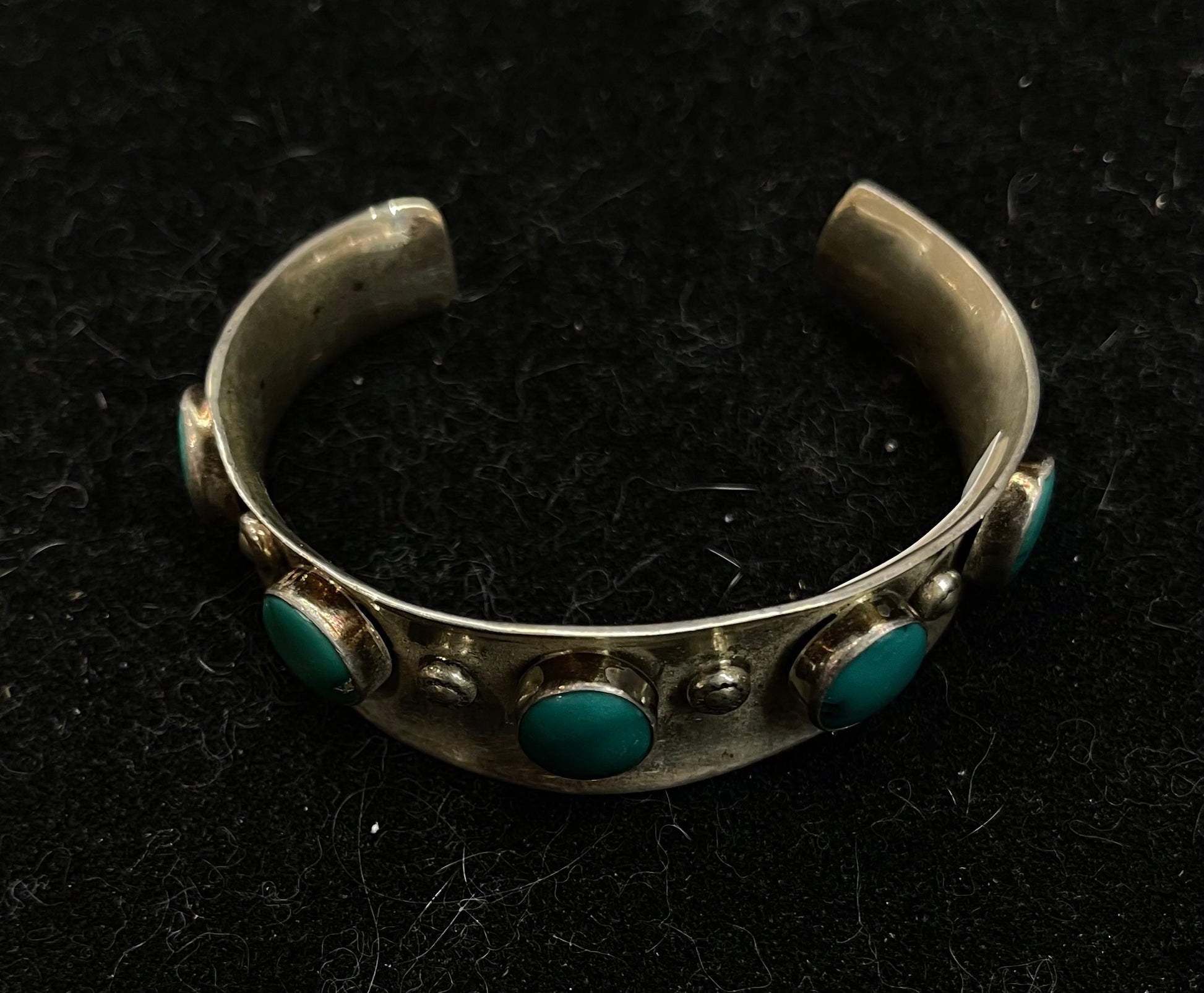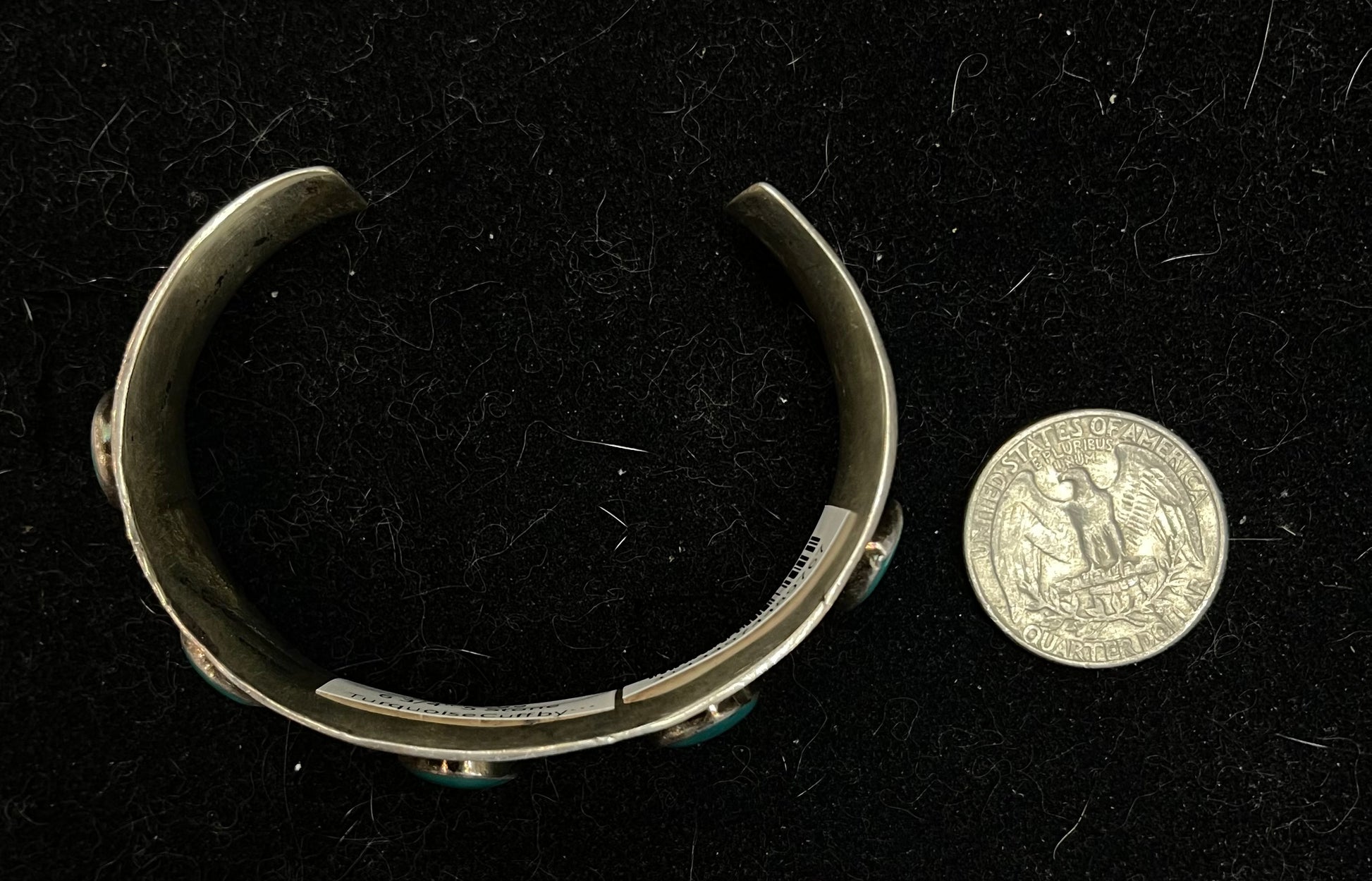 This 6 3/4" cuff is adorned with 5 oval turquoise stones, each separated by sterling silver studs. Expertly crafted by Emer Thompson, a Navajo artisan. Not adjustable.
