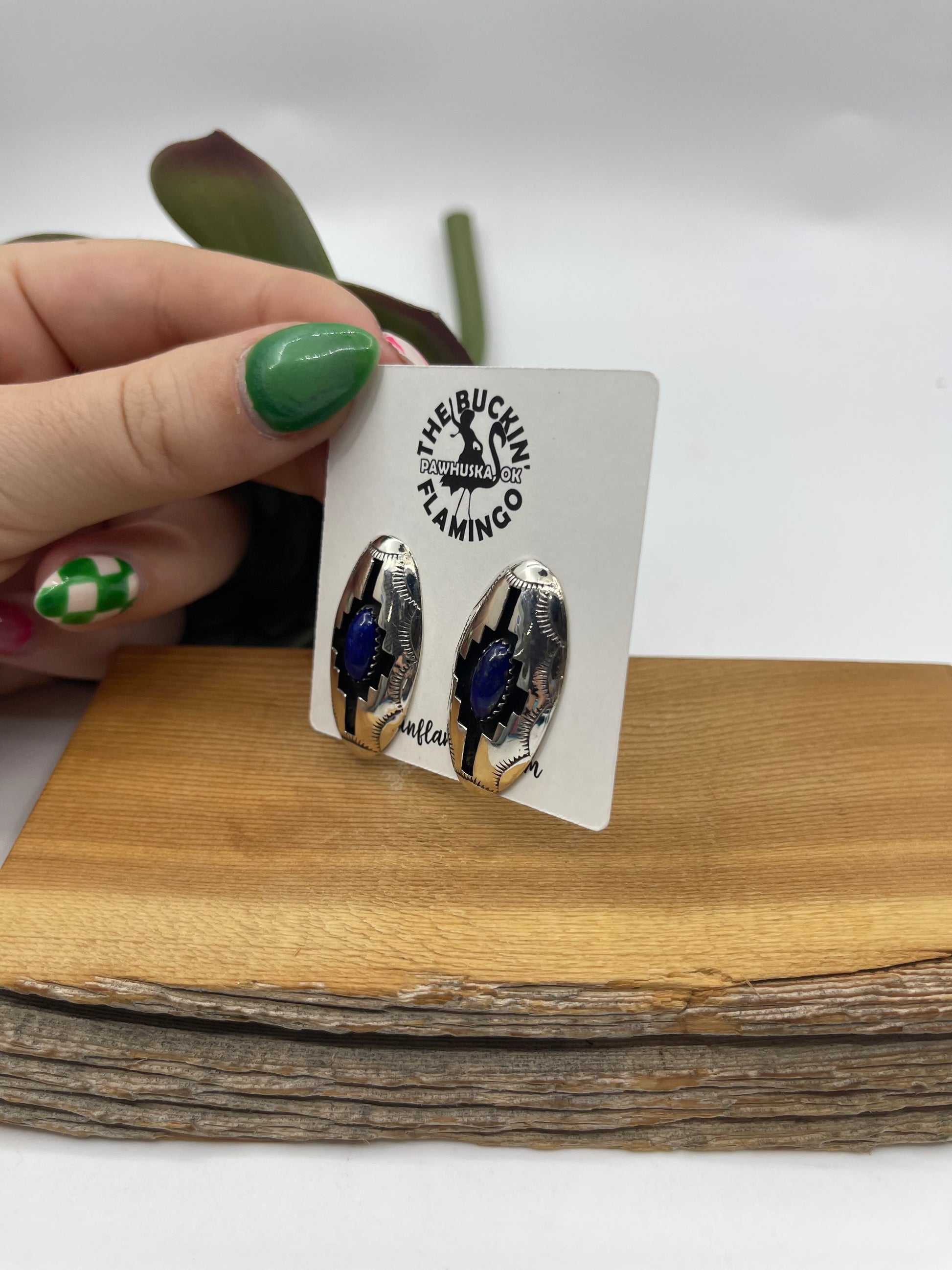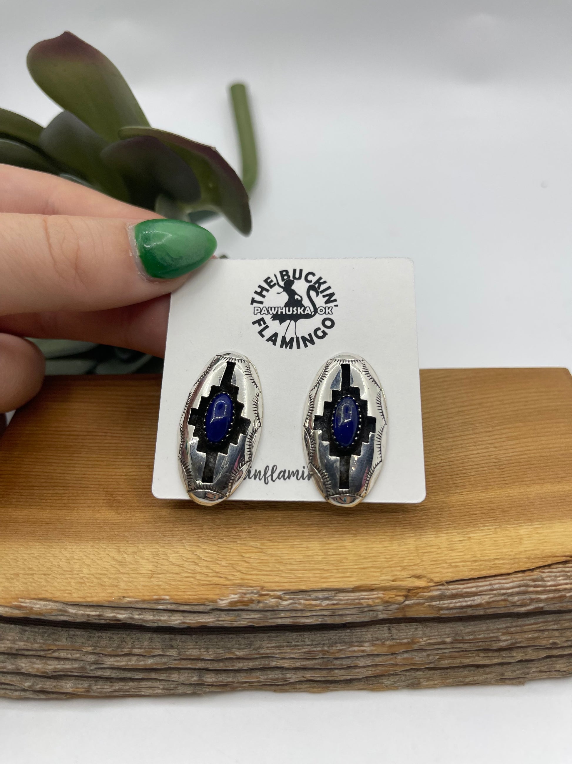 Oval Lapis Shadowbox Post Earrings by Felix Perry, Navajo