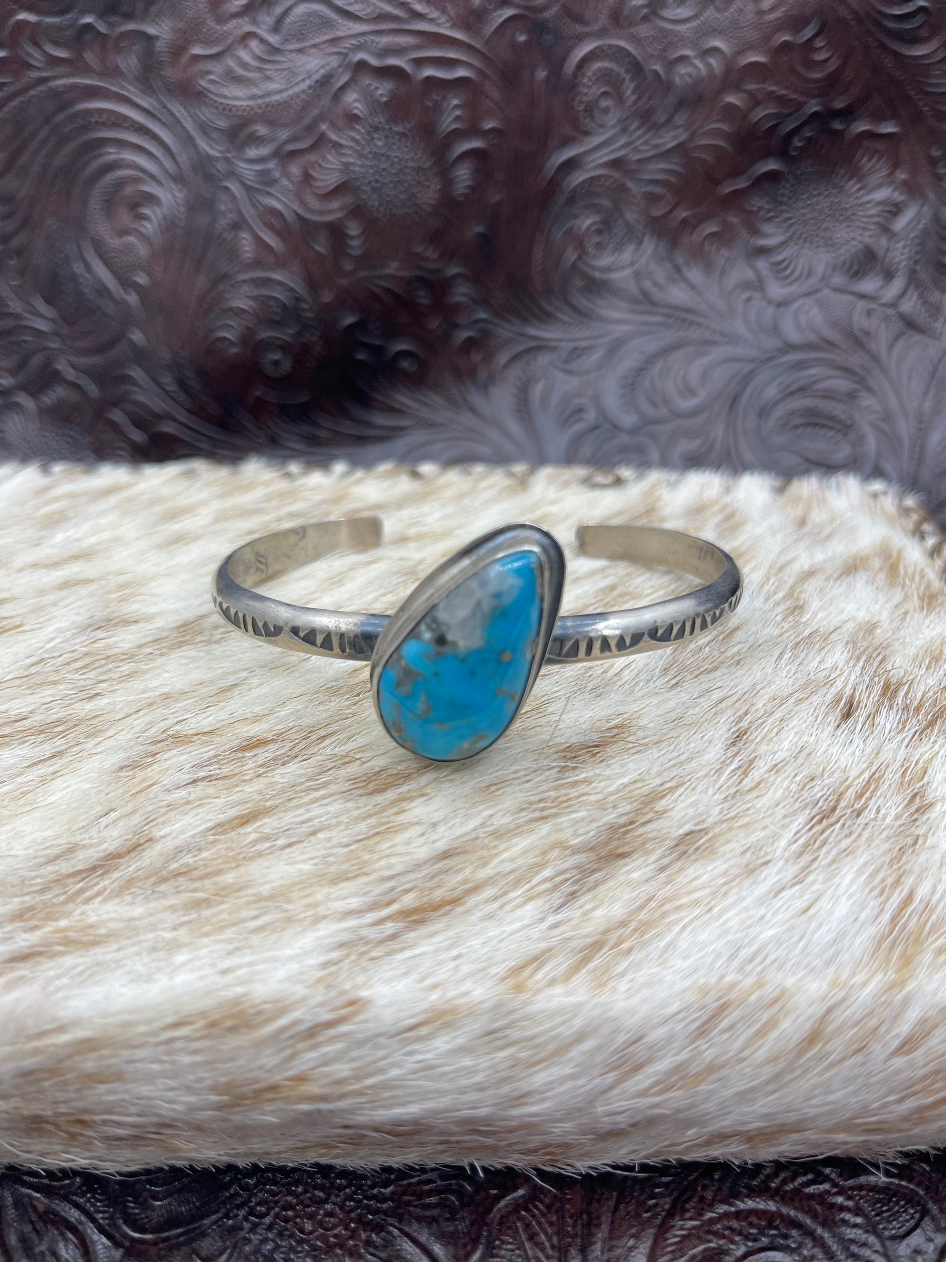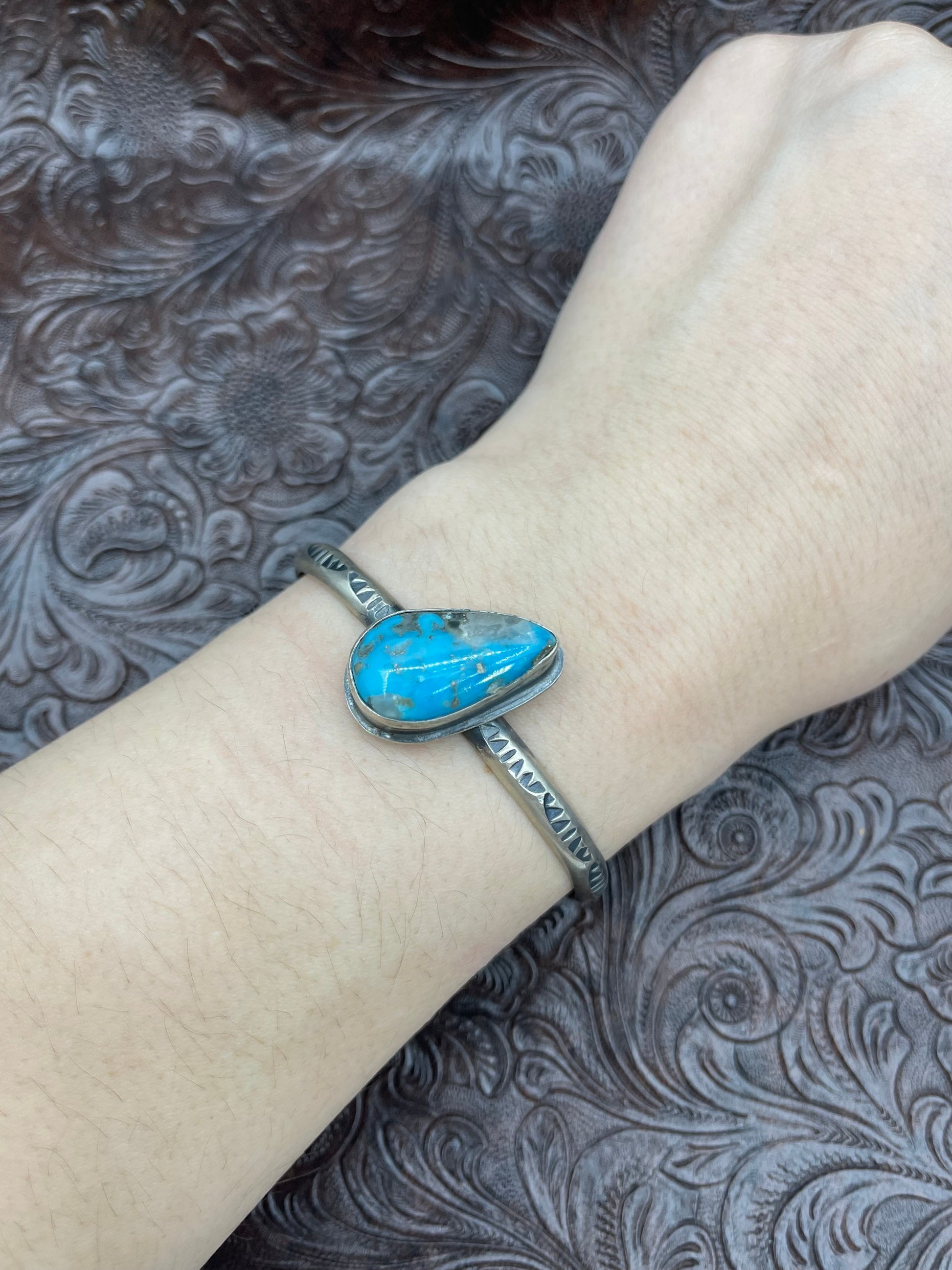 Handcrafted from sterling silver and featuring a stunning Kingman turquoise stone, this adjustable cuff bracelet showcases authentic Navajo artistry. The warm, sky-blue hues of genuine Kingman turquoise are set against polished silver, creating a timeless piece that transitions effortlessly from everyday wear to special occasions. Sized to fit most wrists comfortably between 5.5" and 7.25", this bracelet celebrates traditional Native American craftsmanship while offering versatile style. A meaningful investment in heritage-inspired jewelry that tells a story.