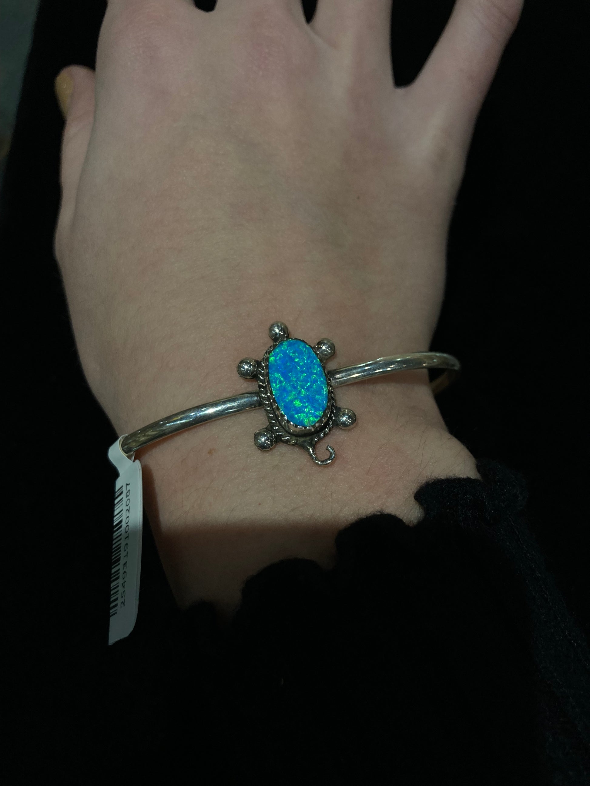 This playful Blue Opal Turtle Cuff by Kalana Hustito, Zuni will add a touch of whimsy to any outfit. Crafted with a stunning blue opal stone in the shape of a turtle, this cuff is both unique and stylish. Perfect for those who appreciate unconventional accessories.