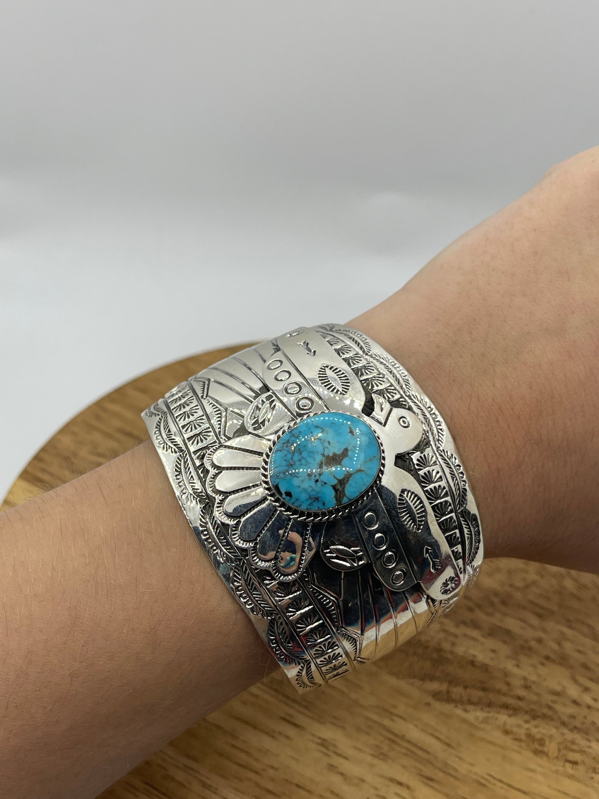 Thunderbird Cuff w/Turquoise by Evelyn BaHe, Navajo