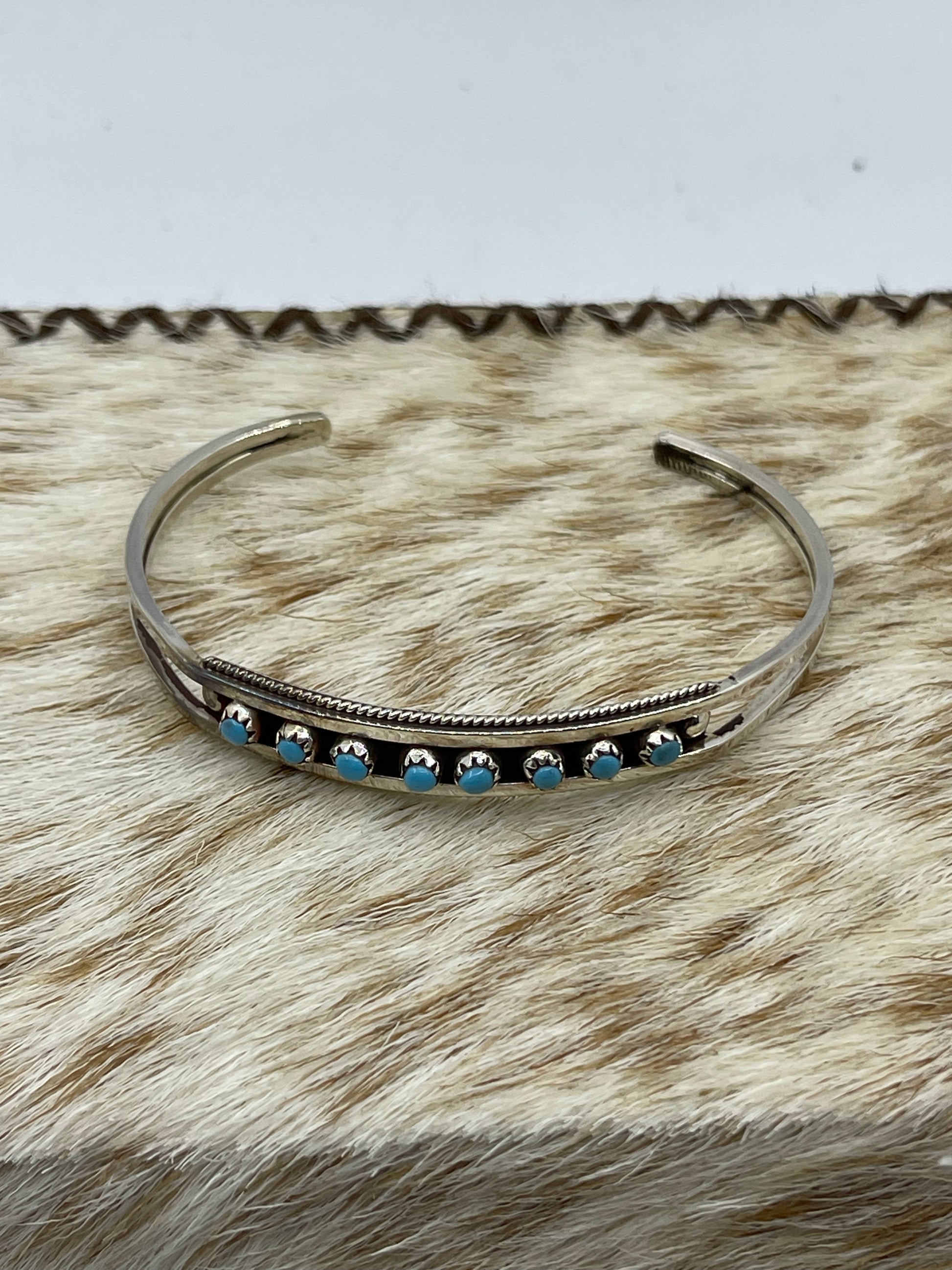 This exquisite turquoise snake eye cuff by Susie Livingston showcases eight beautifully polished stones, each set to highlight its vibrant blue-green hues. Crafted in the traditional Zuni style, this adjustable cuff fits wrist sizes from 5 3/4" to 7 1/4", combining comfort with artisanal quality. Elevate your look with a piece that blends Native American heritage and timeless elegance, perfect for those who appreciate unique, handcrafted jewelry.
