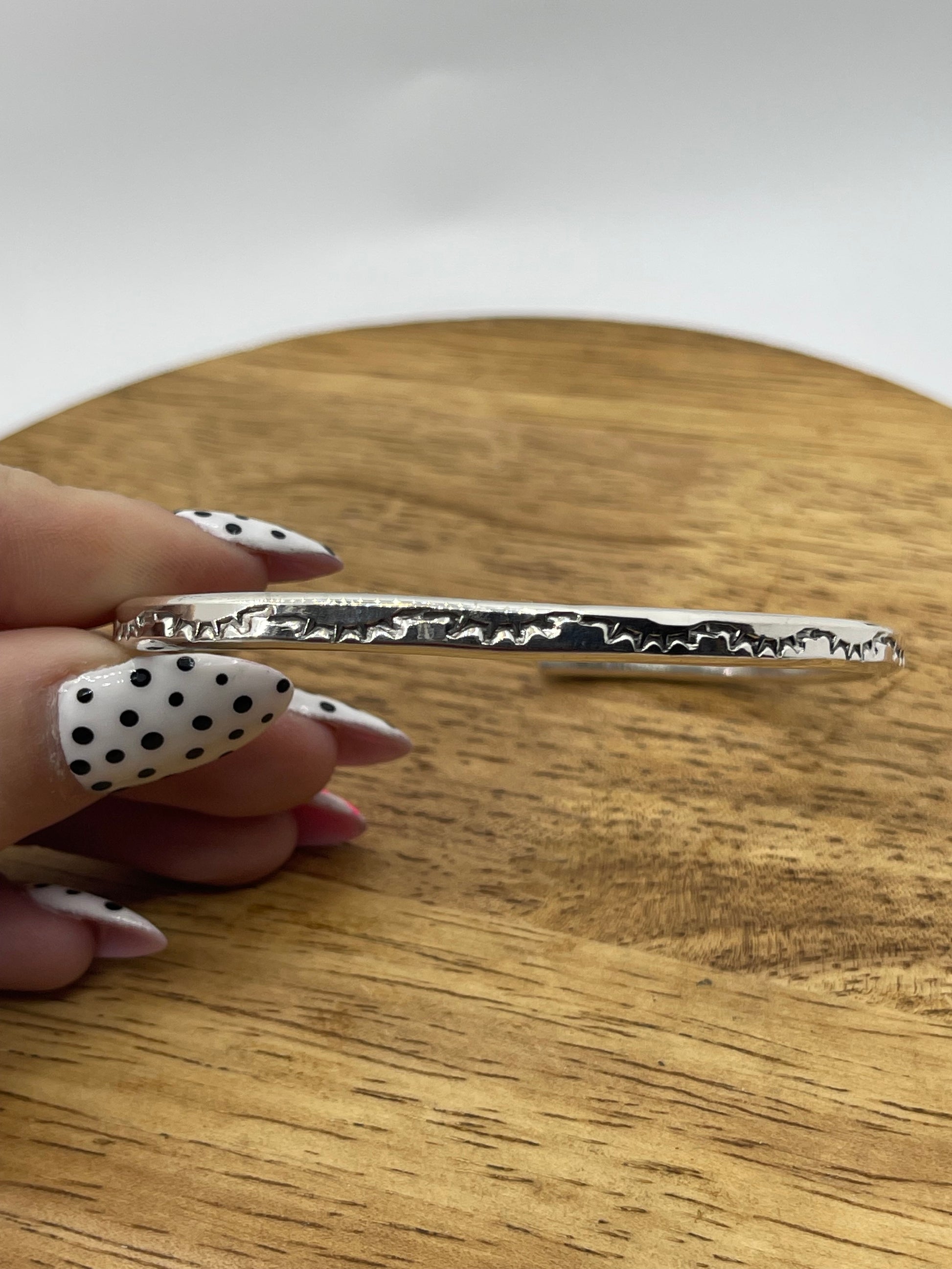 This elegant Stamped Round Wire Stacker Cuff by Elaine Tahe, a Navajo artist, features unique hand-stamped designs that vary with each piece. Measuring approximately 7.25" to 7.75", its versatile size ensures a comfortable fit while adding authentic Southwestern charm to any outfit. Perfect for stacking or wearing alone, this cuff complements both casual and formal styles with its timeless craftsmanship.