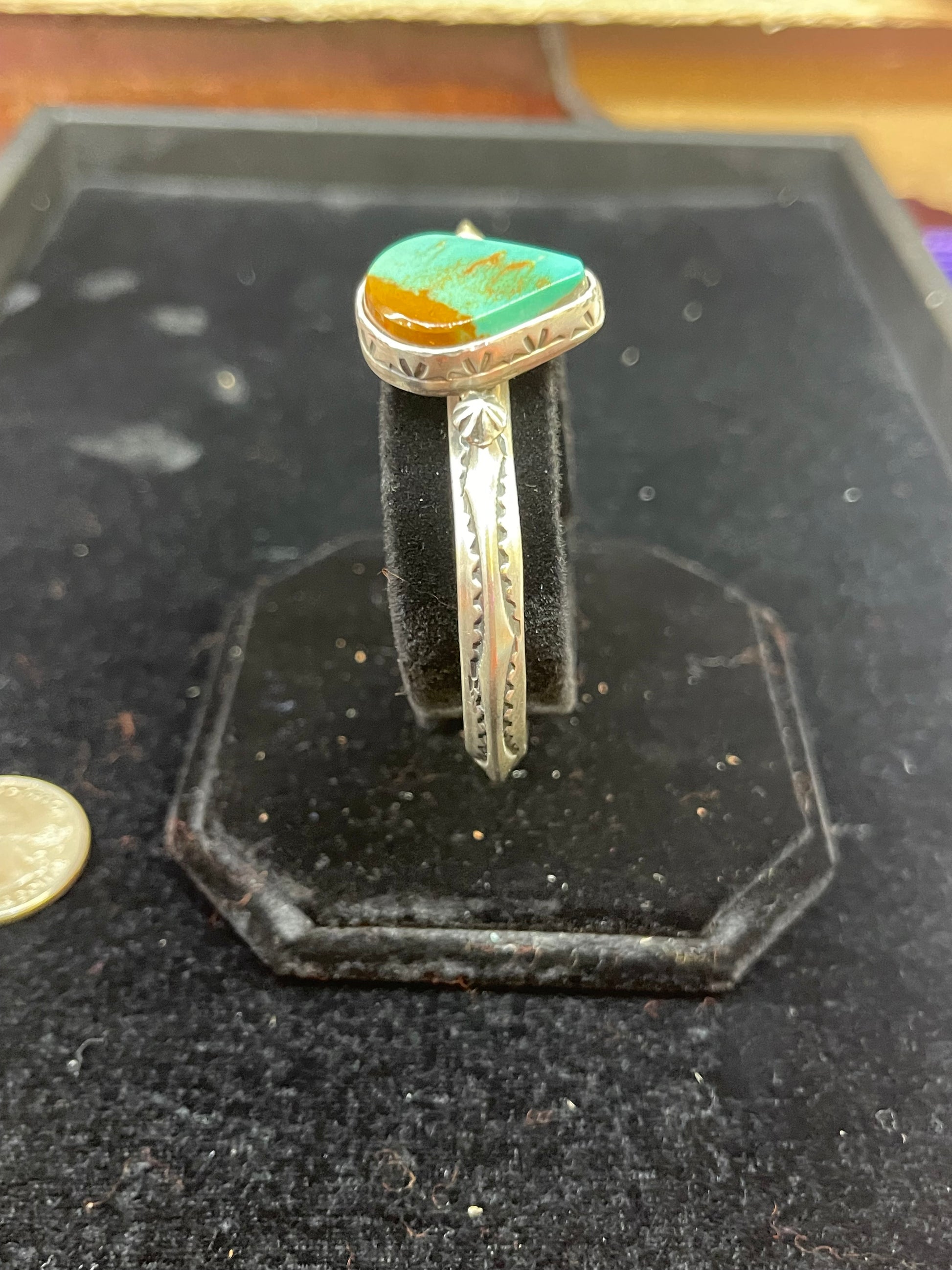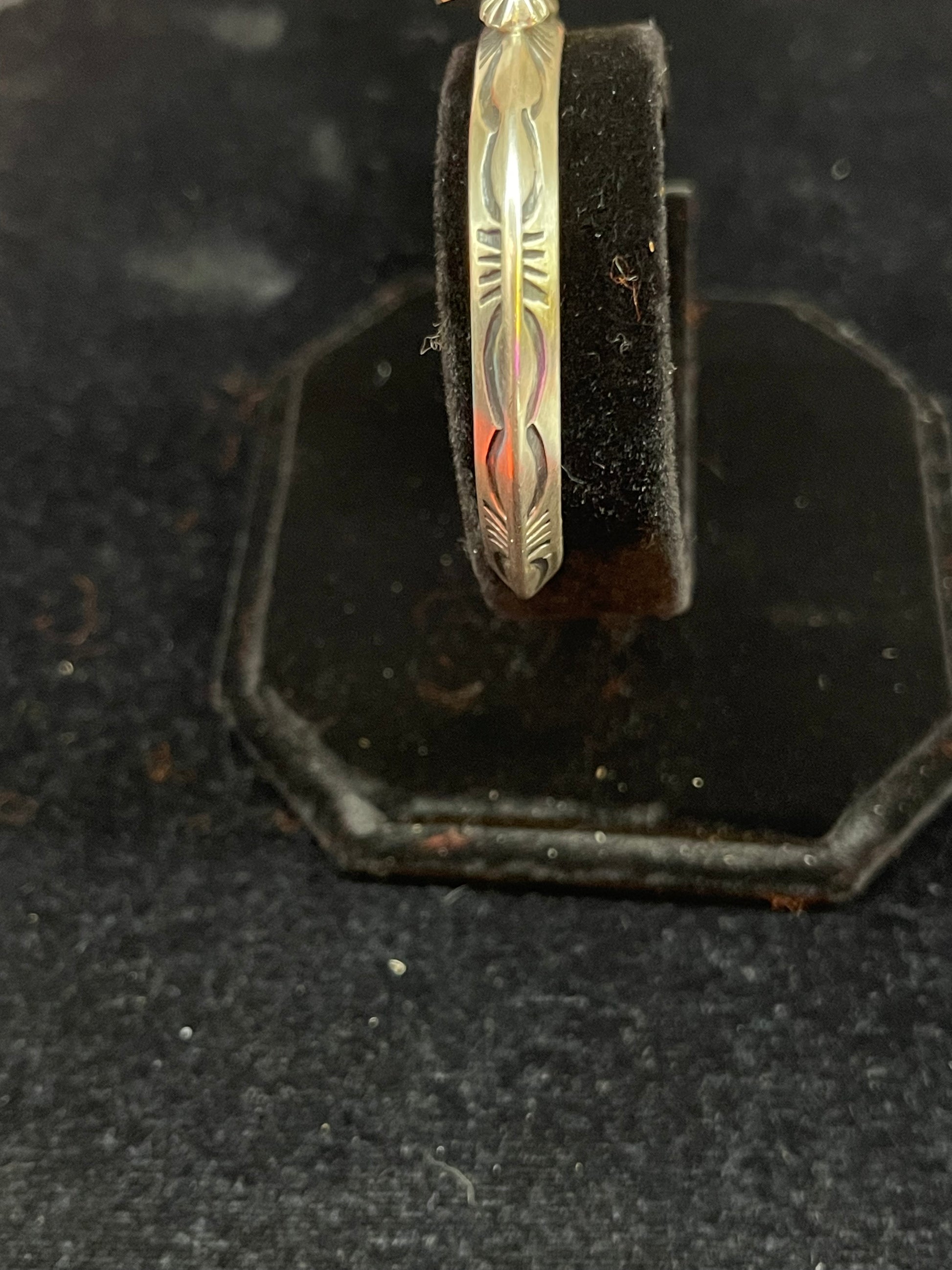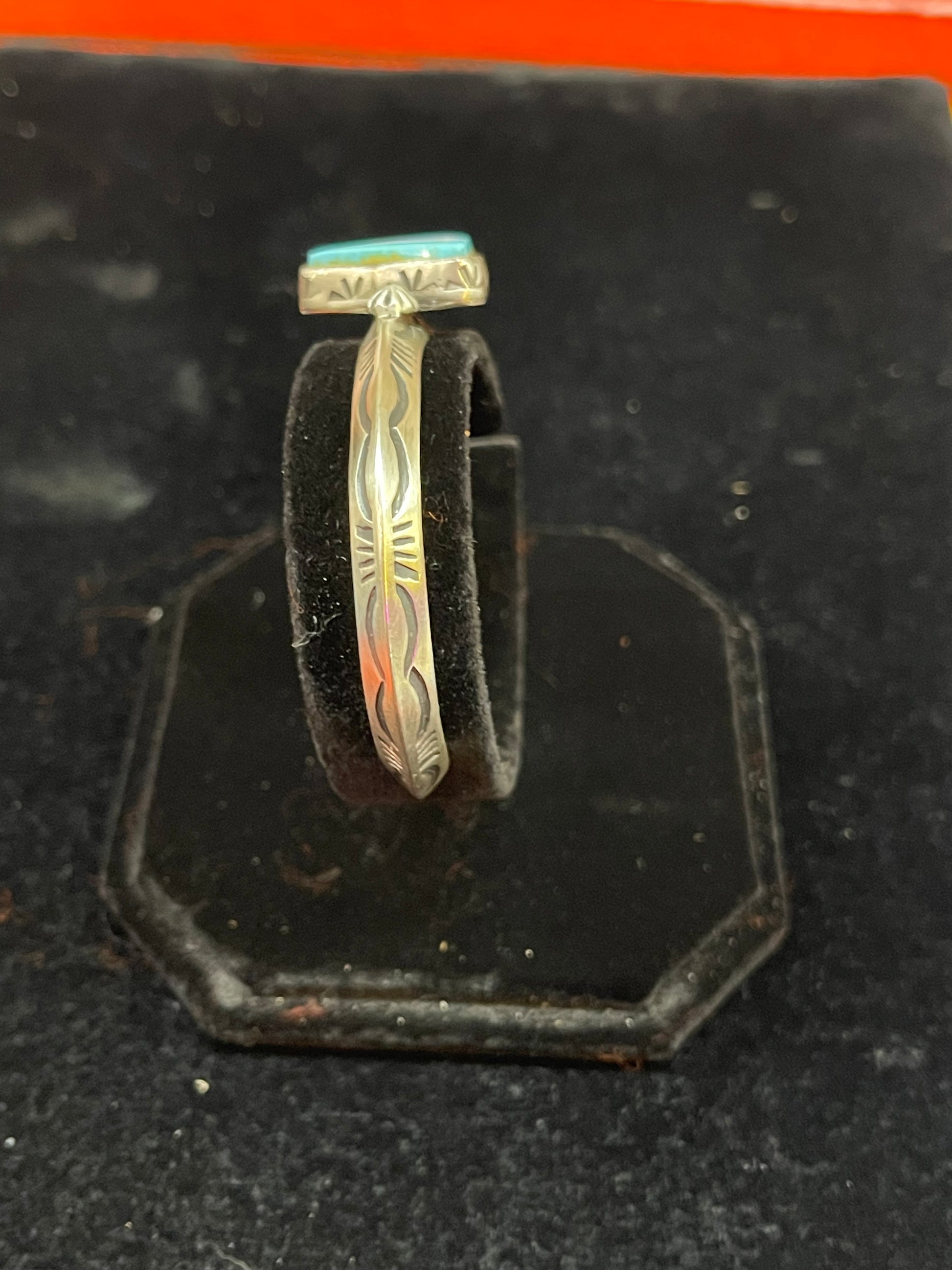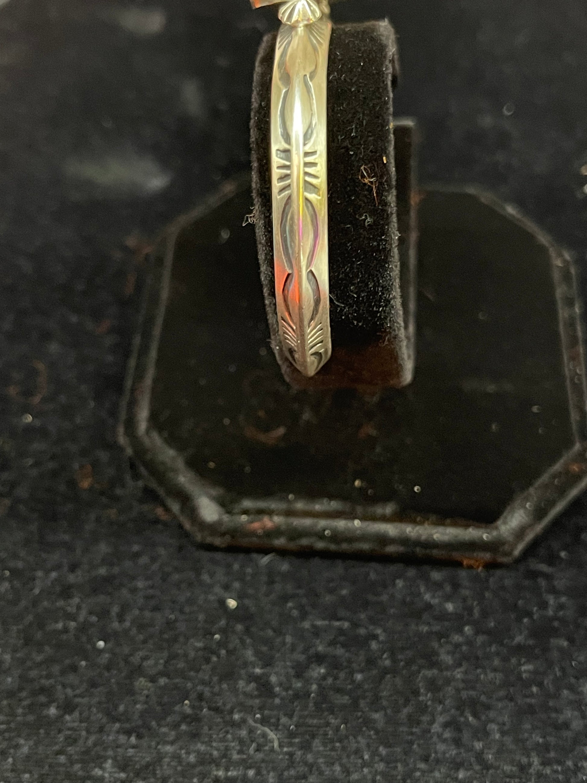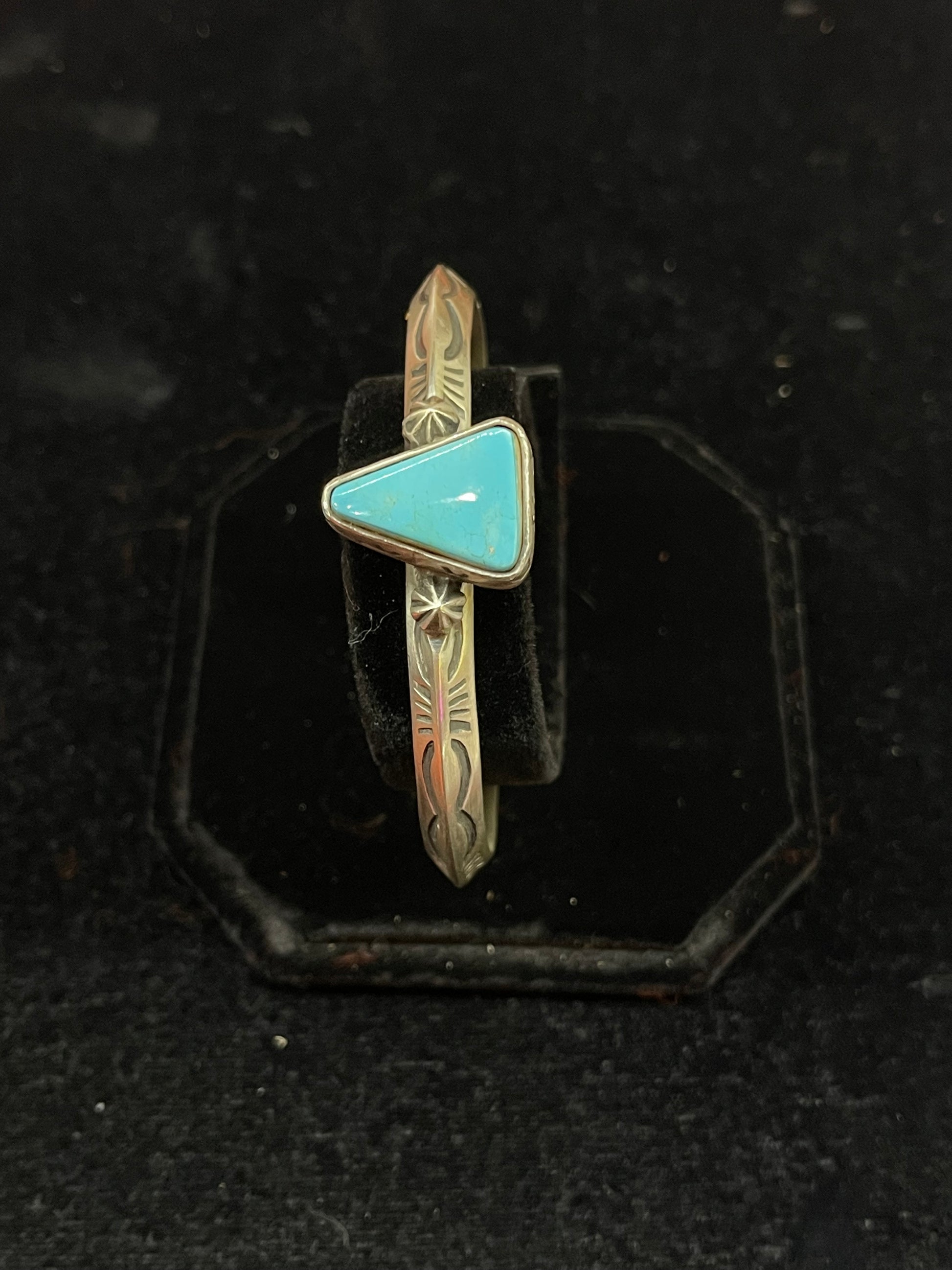 This beautiful handmade bracelet is crafted by Navajo Artist Tahe using heavy wire. It is a must-have for any jewelry aficionado, and measures between 5 1/2" - 6 1/2". Enjoy the unique piece and add a touch of culture and art to any look.