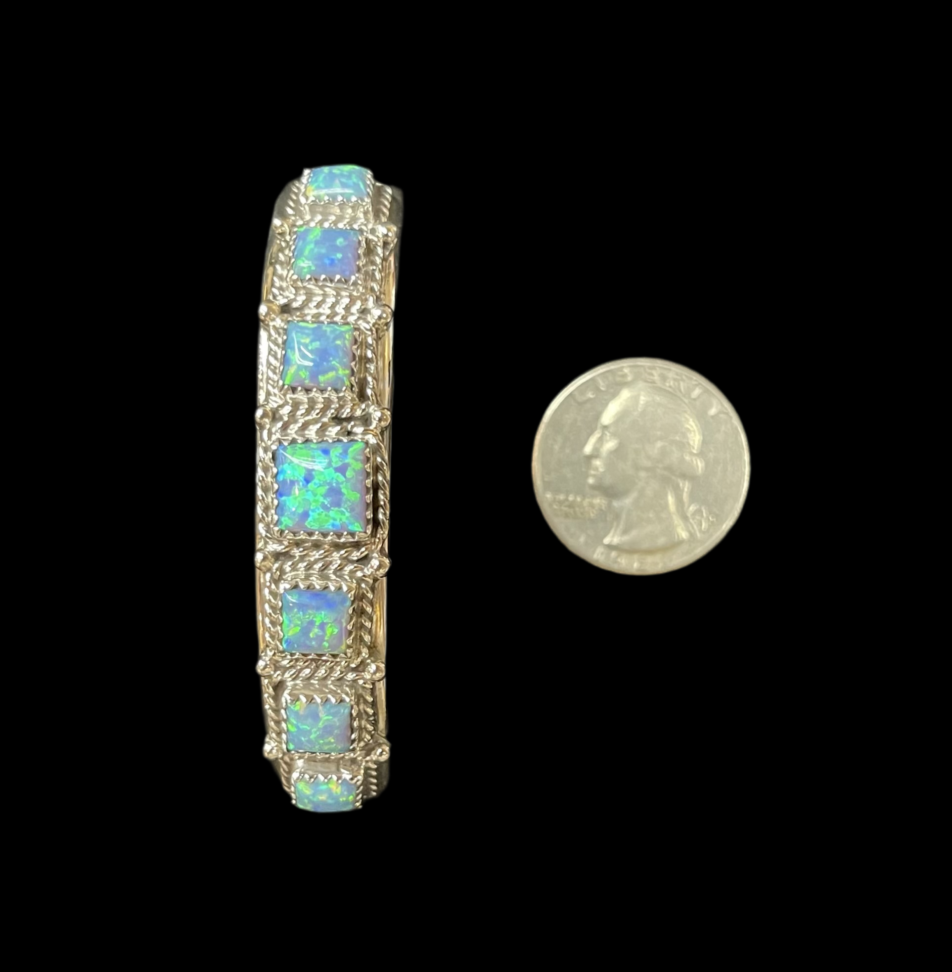 Get ready to add some serious style to your wrist with this 6"-7" adjustable cuff made by the one and only Davey Morgan, Navajo. Adorned with seven stunning square-cut blue opal stones, this cuff is a must-have for any fashion-forward individual. Don't miss out!