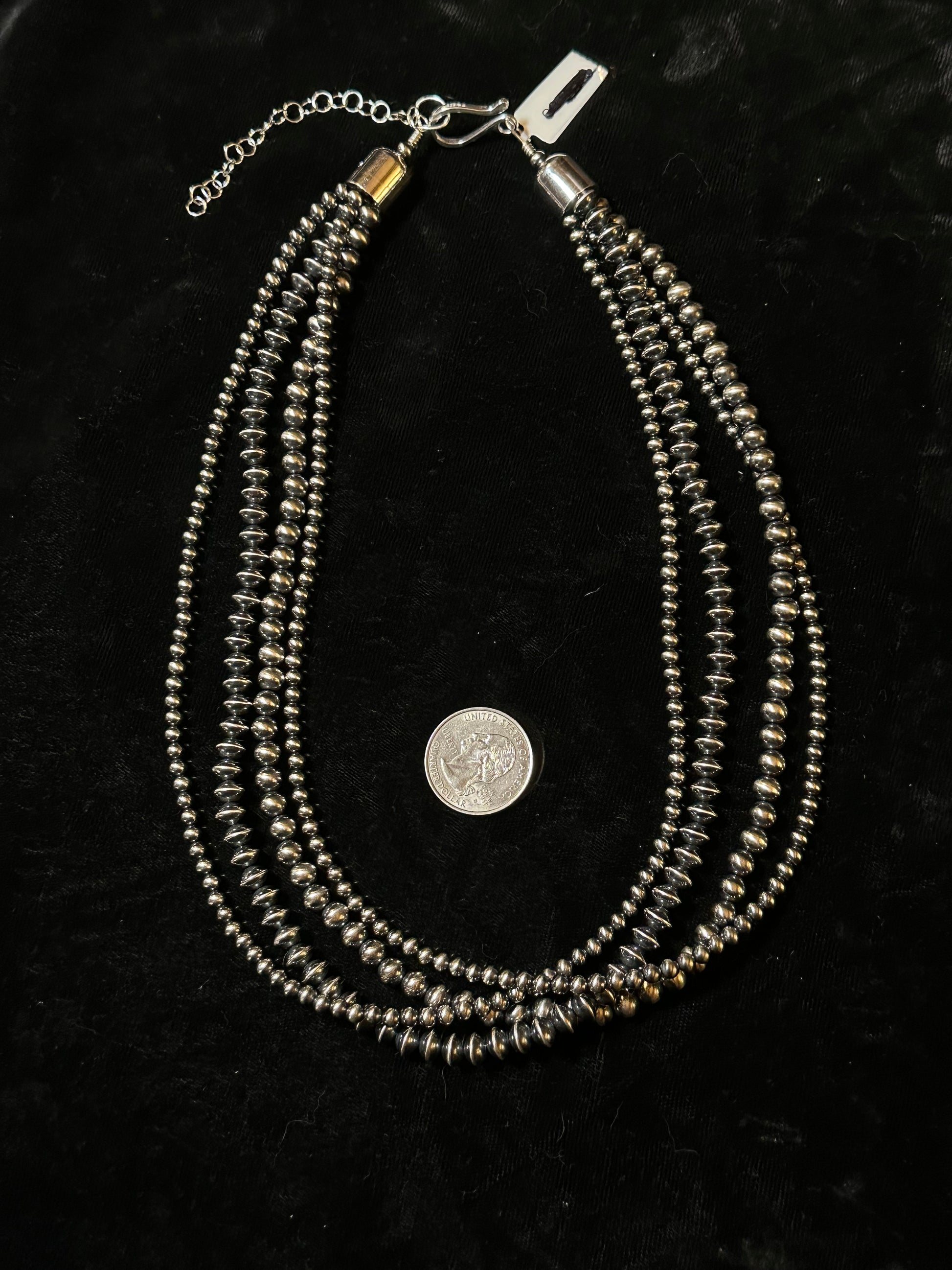 Discover the exquisite beauty of our 4 Strand Navajo Pearl and Saucer Necklace. Handcrafted with unique sterling silver beaded strands, this 20" necklace features 4mm, 6mm, and 7mm Navajo Pearls and 6mm Navajo Saucers. With a 3" extender, this necklace can be styled in various lengths for a versatile and stunning accessory.