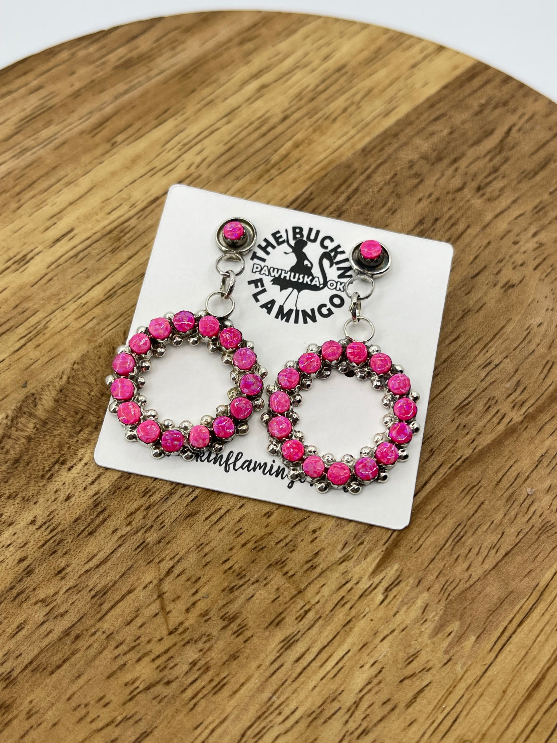 Elevate your style with these Hot Pink Opal Infinity Ring Post Dangle Earrings by Marlon Quam, inspired by Zuni artistry. Featuring vibrant pink opal stones set in elegant infinity-shaped silver rings, these earrings add a bold yet timeless touch to any outfit. Lightweight and beautifully crafted, they balance striking color with effortless wearability, making them perfect for day-to-night looks or special occasions. Embrace a unique blend of cultural heritage and contemporary design with these captivating earrings.