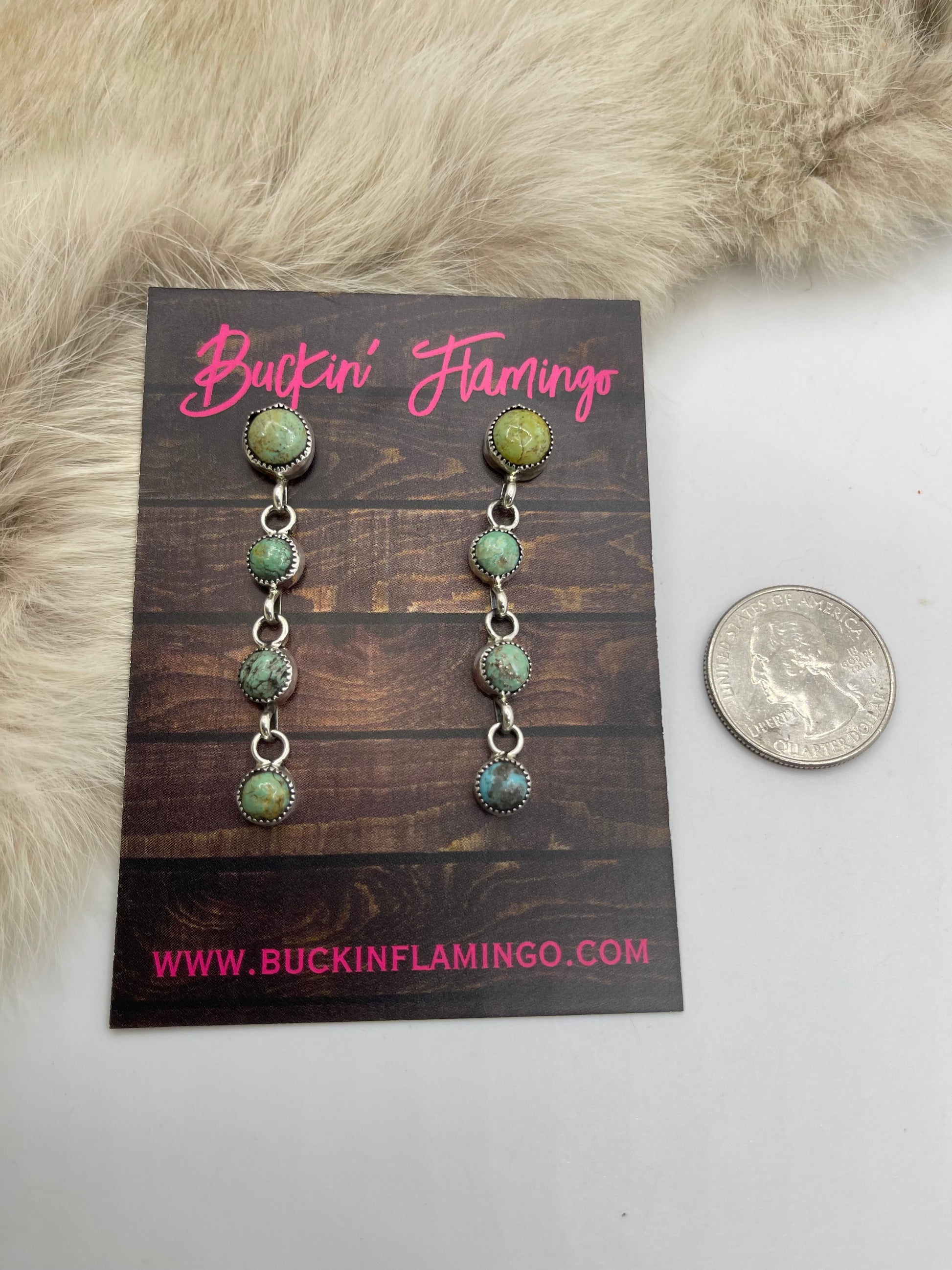 Handcrafted by Navajo artisan Runningbear, these striking drop earrings showcase four luminous green turquoise stones set in sterling silver. Each pair captures the authentic spirit of Native American jewelry-making, with carefully selected stones that display natural color variation and character. The dangle design creates graceful movement, making them ideal for both everyday wear and special occasions. A timeless investment piece that honors traditional craftsmanship while adding sophisticated elegance to any collection.