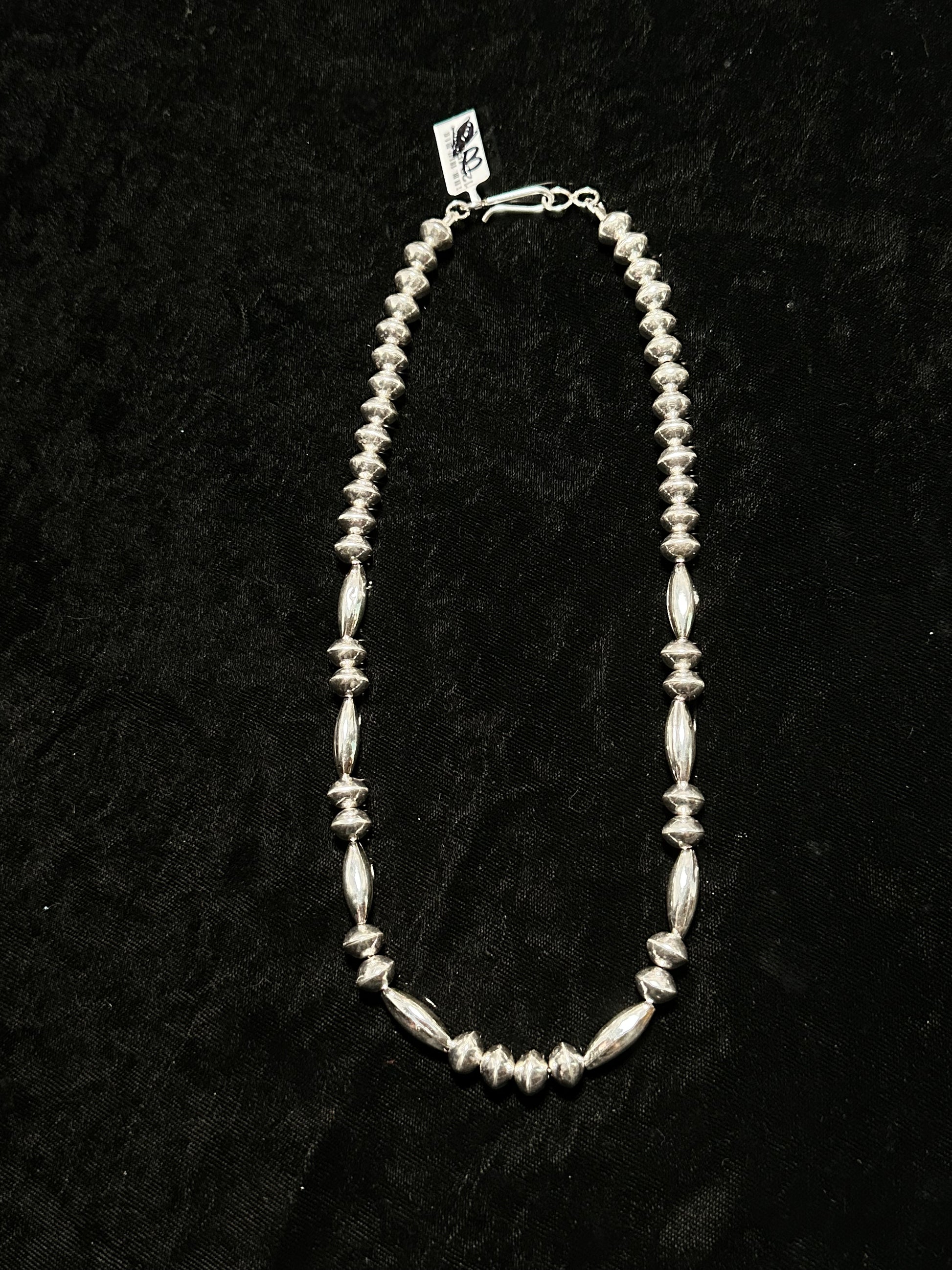 This 20" 9mm Disk Navajo Pearl Necklace By Preston Hailey, Navajo features stunning Navajo pearls and a sterling silver clasp. The perfect combination of traditional and modern, it adds a touch of elegance to any outfit. Expertly crafted by Navajo artisans, this necklace is a timeless piece of jewelry.