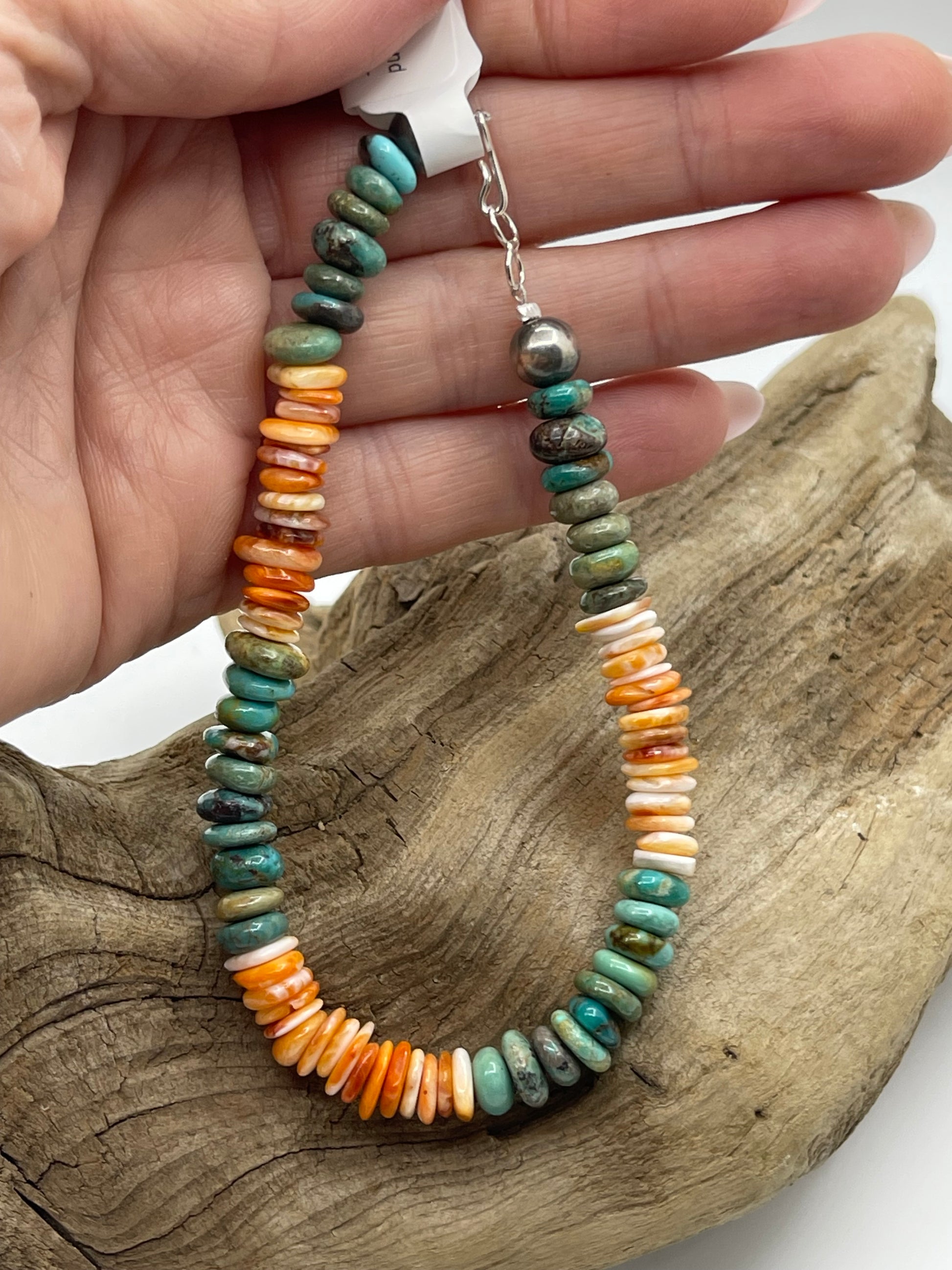 Elevate your style with this 7 1/2" bracelet featuring vibrant turquoise and striking orange spiny oyster shell accents. Its unique combination of colors and natural textures adds a bold, eye-catching touch to any outfit. Perfect for those who appreciate handcrafted jewelry that stands out with authentic Southwestern charm.