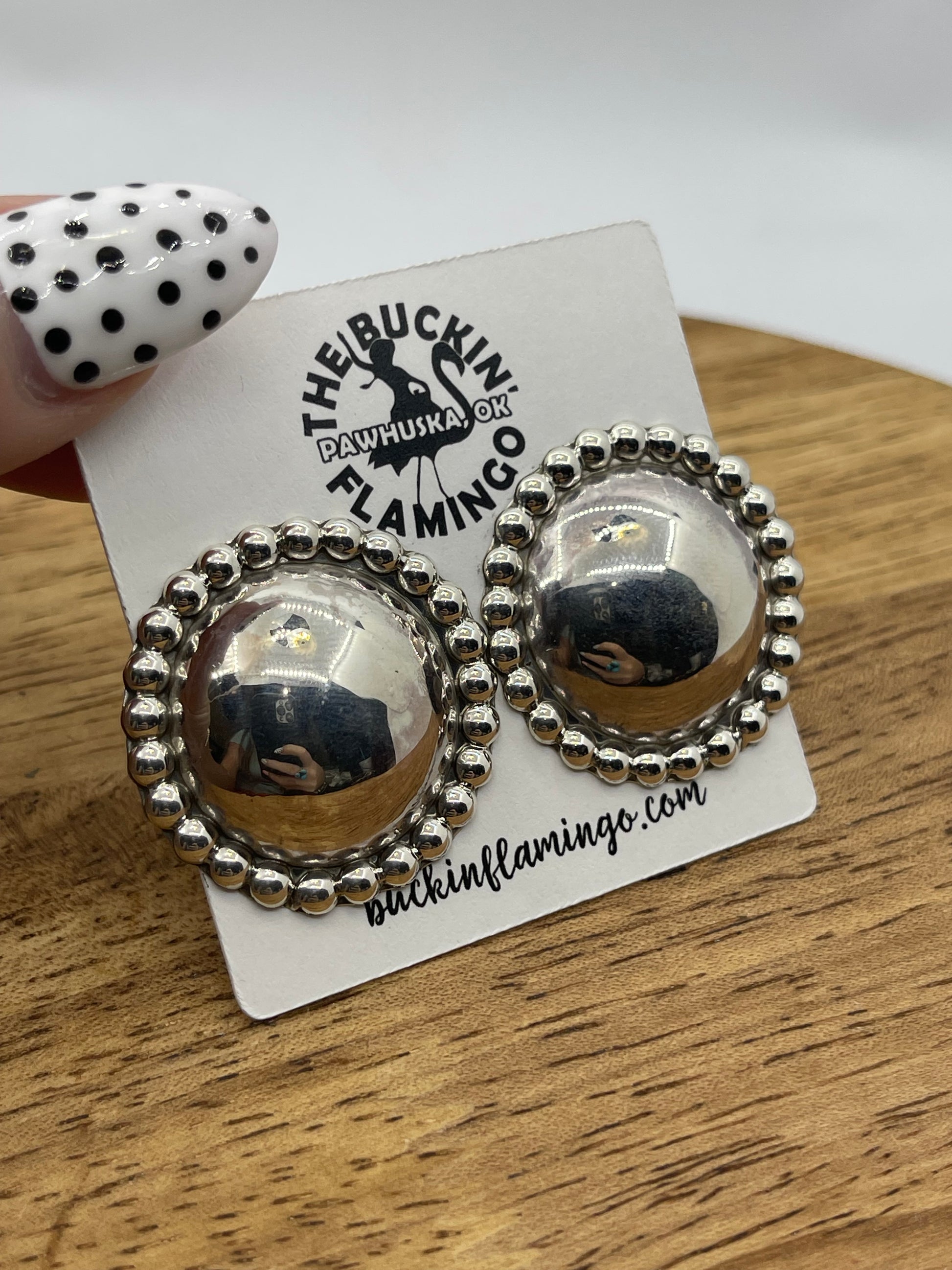 Elevate your style with these Shiny Silver Concho Post Earrings by Lorraine Chee, a talented Navajo artist. Crafted with attention to detail, these earrings feature a polished silver concho design that adds a timeless Southwestern charm to any outfit. Lightweight and comfortable for all-day wear, they make a striking accessory that honors authentic Native craftsmanship while enhancing your look with subtle elegance.
