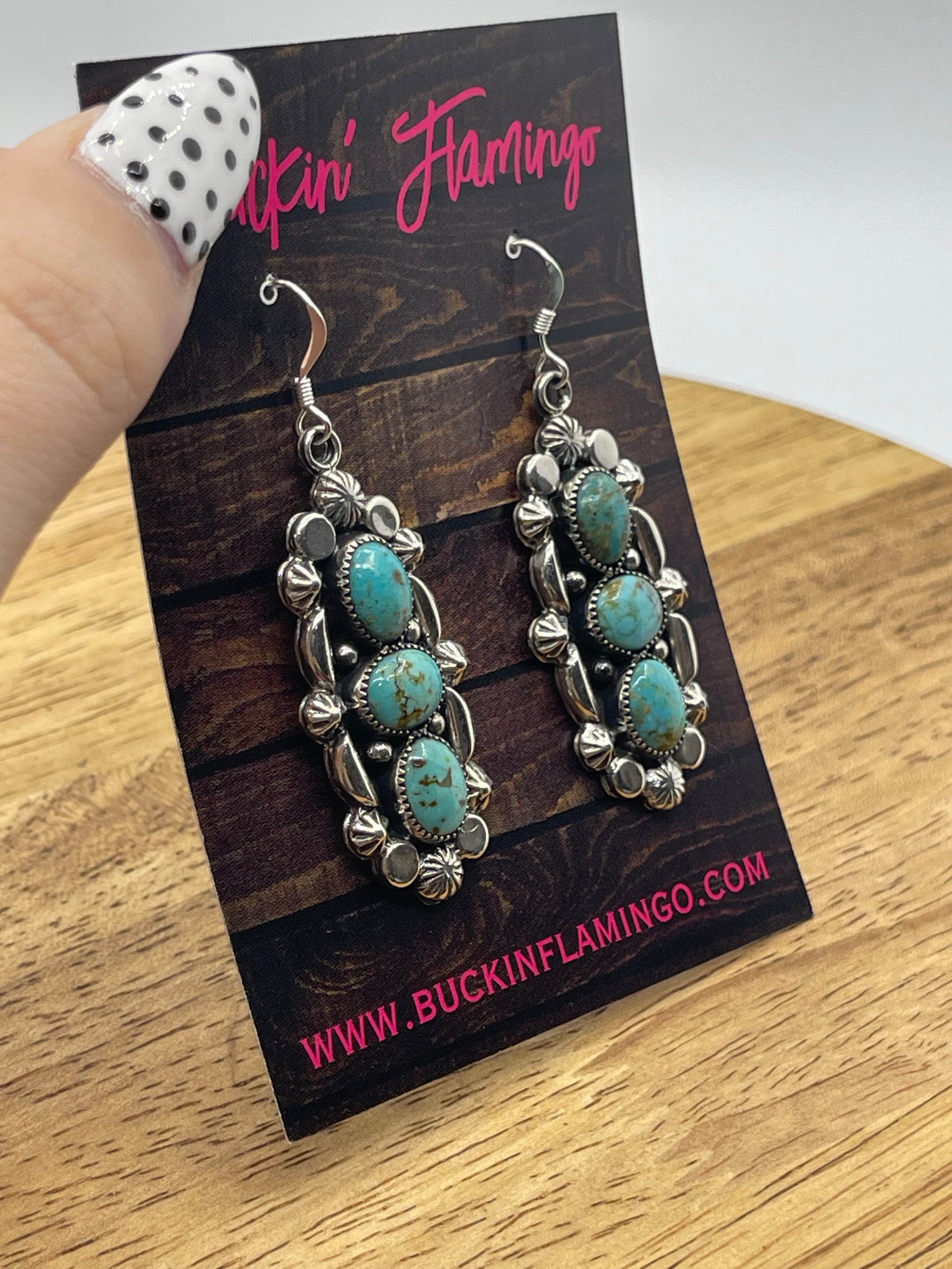 Experience the artistry of Navajo craftsmanship with these 3 Stone Turquoise Dangle Earrings by Emerson Delgarito. Featuring three vibrant turquoise stones delicately set in silver, these earrings offer a striking blend of tradition and elegance. Their lightweight design ensures comfortable wear, while the rich blue hues add a timeless touch to any outfit. Elevate your jewelry collection with a piece that embodies cultural heritage and lasting beauty.