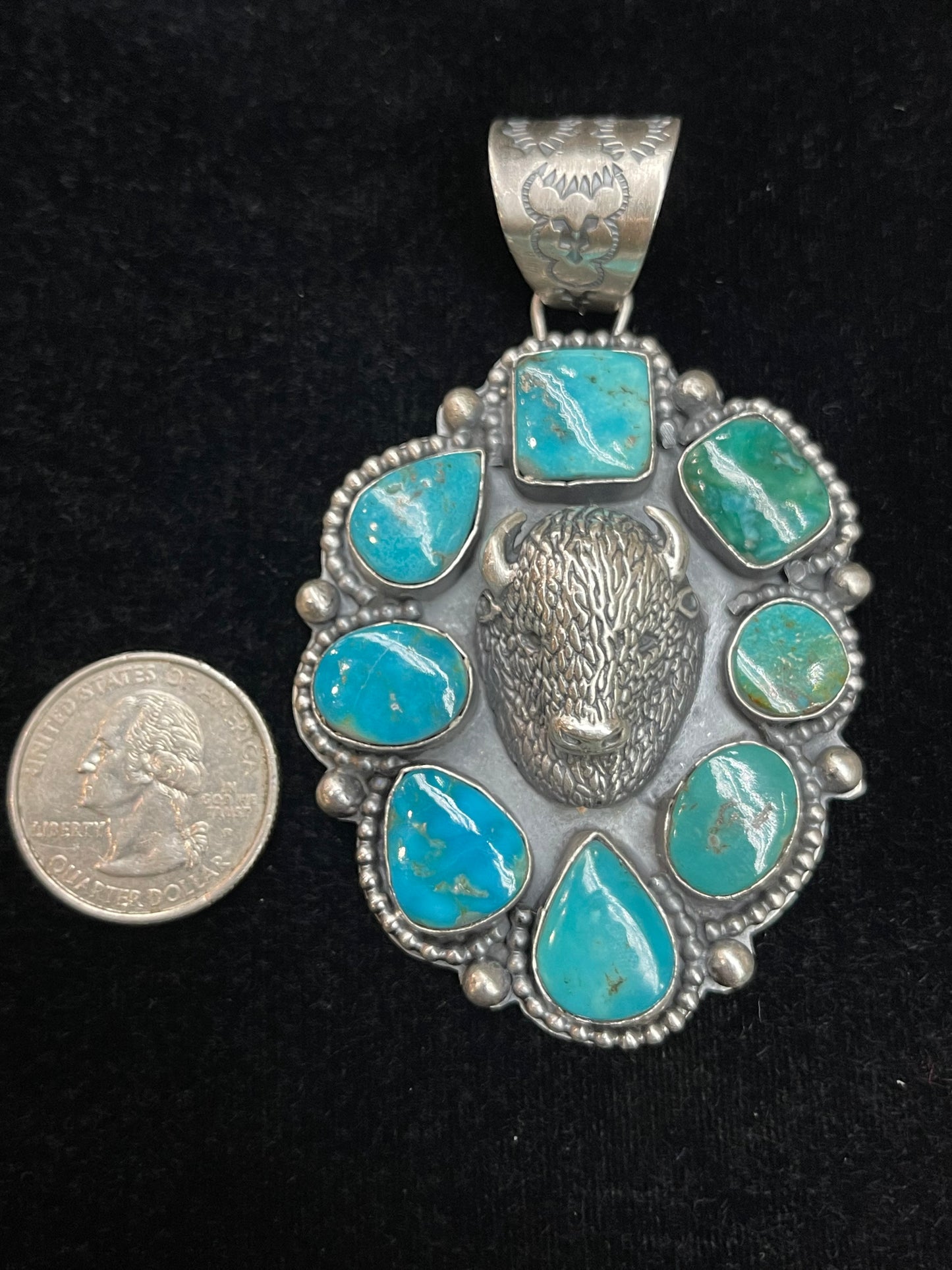 13.2mm Bale Eight Stone Turquoise Pendant with Buffalo Head by Boyd J. Ashley, Navajo