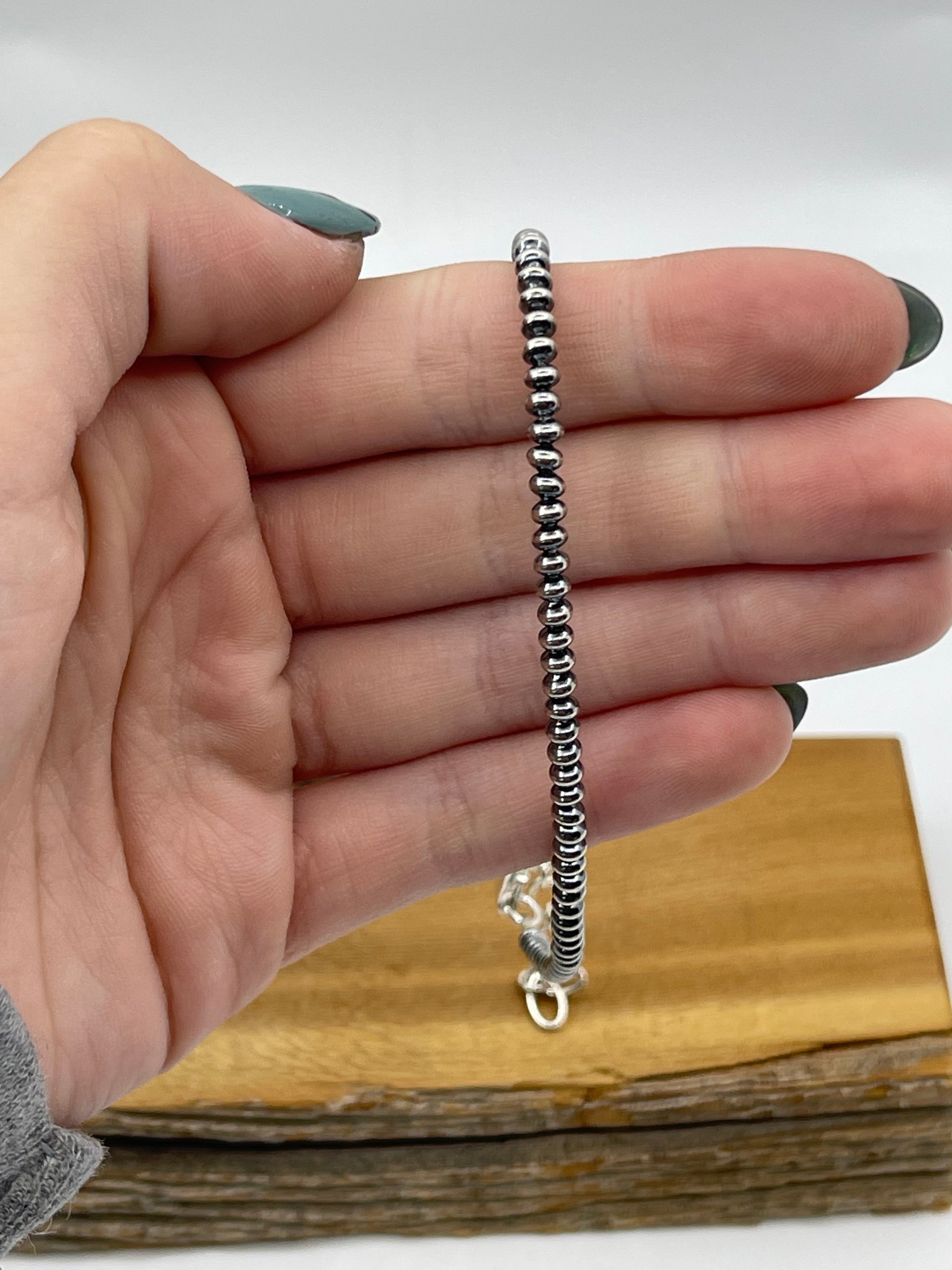 Elevate your style with this 9"+1" 3mm Rondelle Navajo Pearls Anklet. Crafted with authentic Navajo pearls, its sleek 3mm rondelle design offers subtle elegance that complements any outfit. Perfect for daily wear or special occasions, this anklet adds a touch of timeless beauty and charm to your look. Durable and lightweight, it’s an effortless way to enhance your accessory collection.