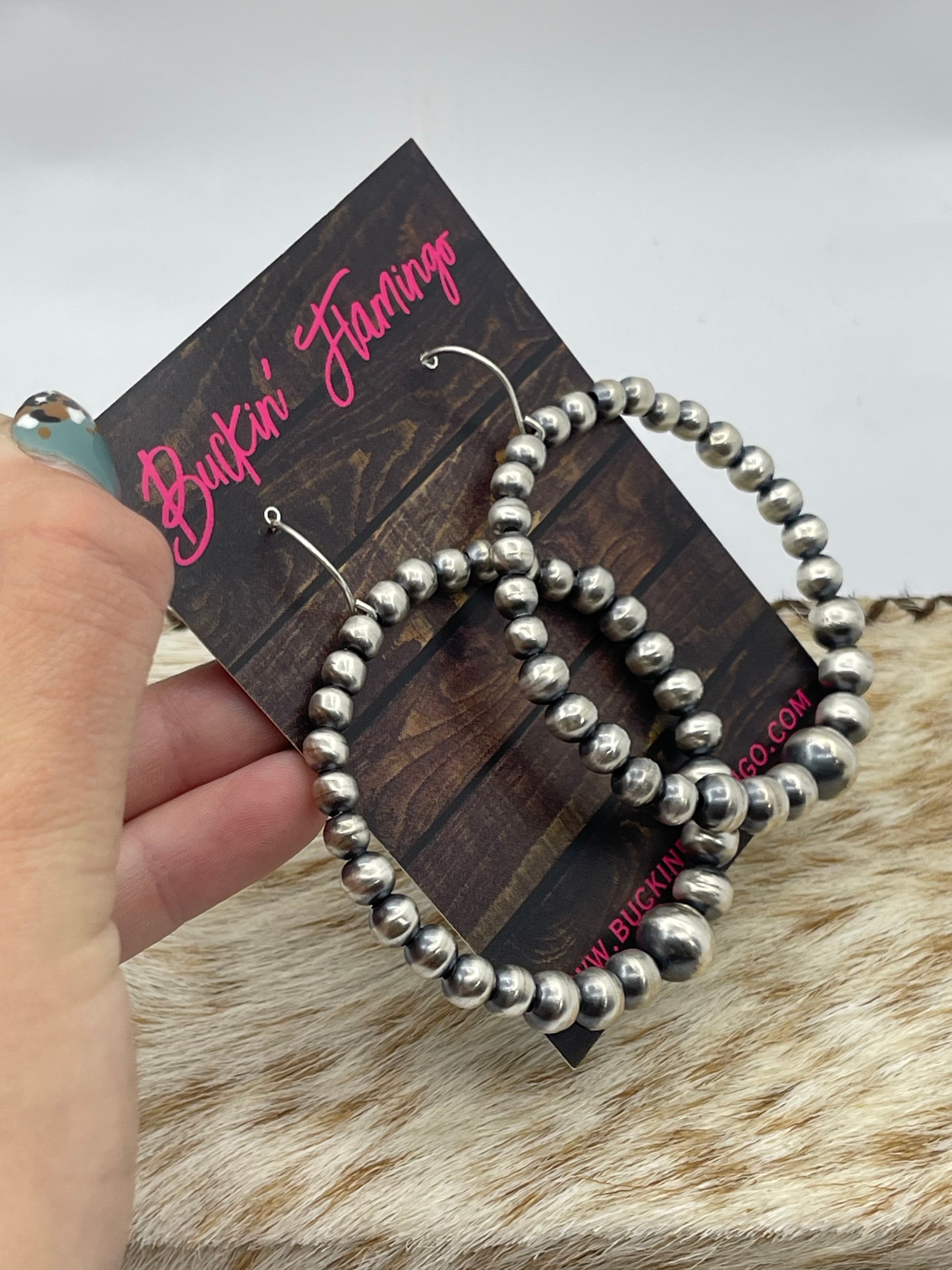 Elevate your style with these exquisite Navajo Pearls Dangle Hoop Earrings by Amanda Larry. Featuring a unique blend of 4mm to 9mm hand-formed Navajo pearls, each earring showcases authentic craftsmanship and timeless elegance. Their dynamic size variation adds movement and texture, perfect for making a subtle yet compelling statement in any outfit. Experience the beauty of Native artistry combined with modern design in every wear.