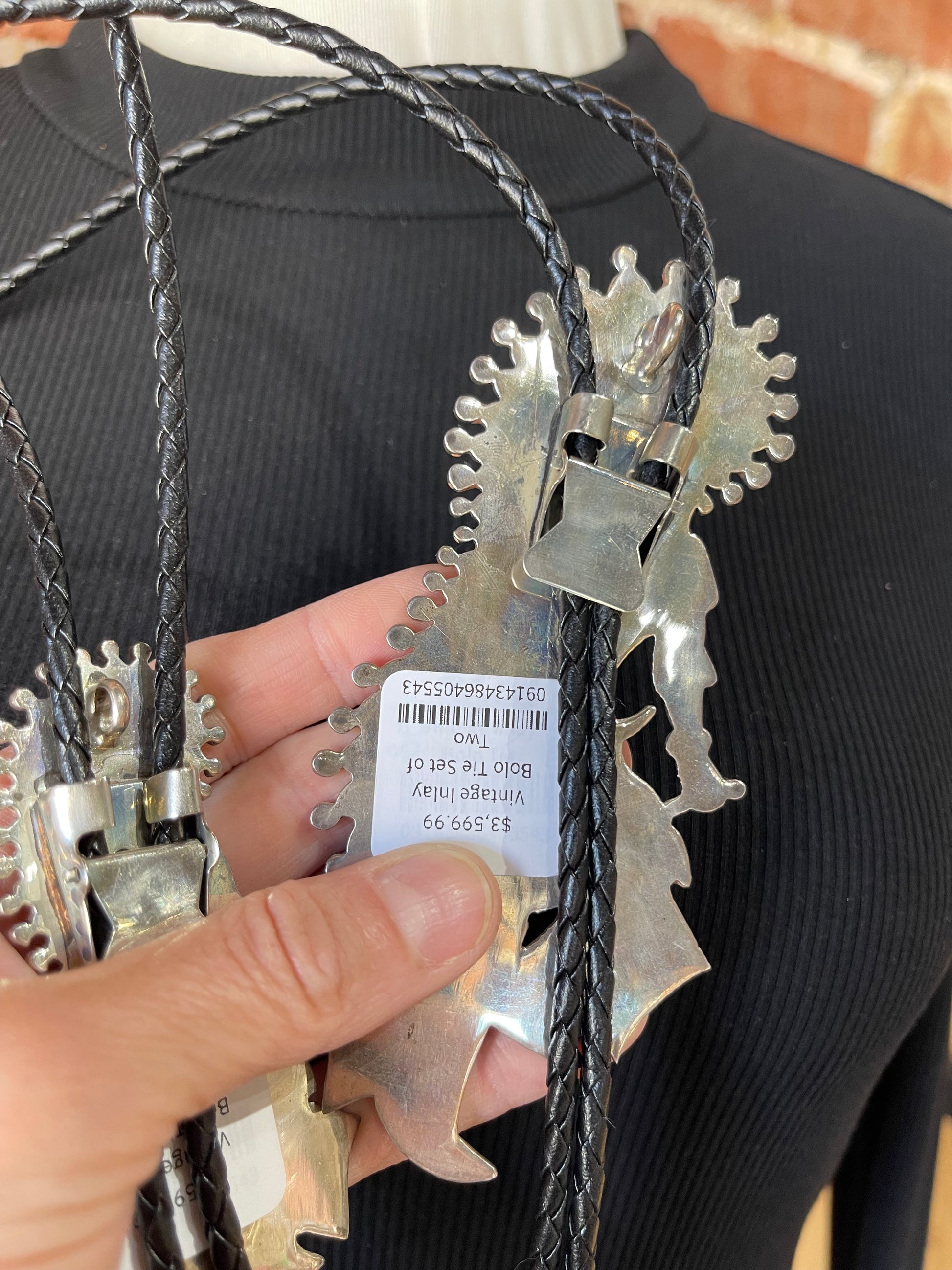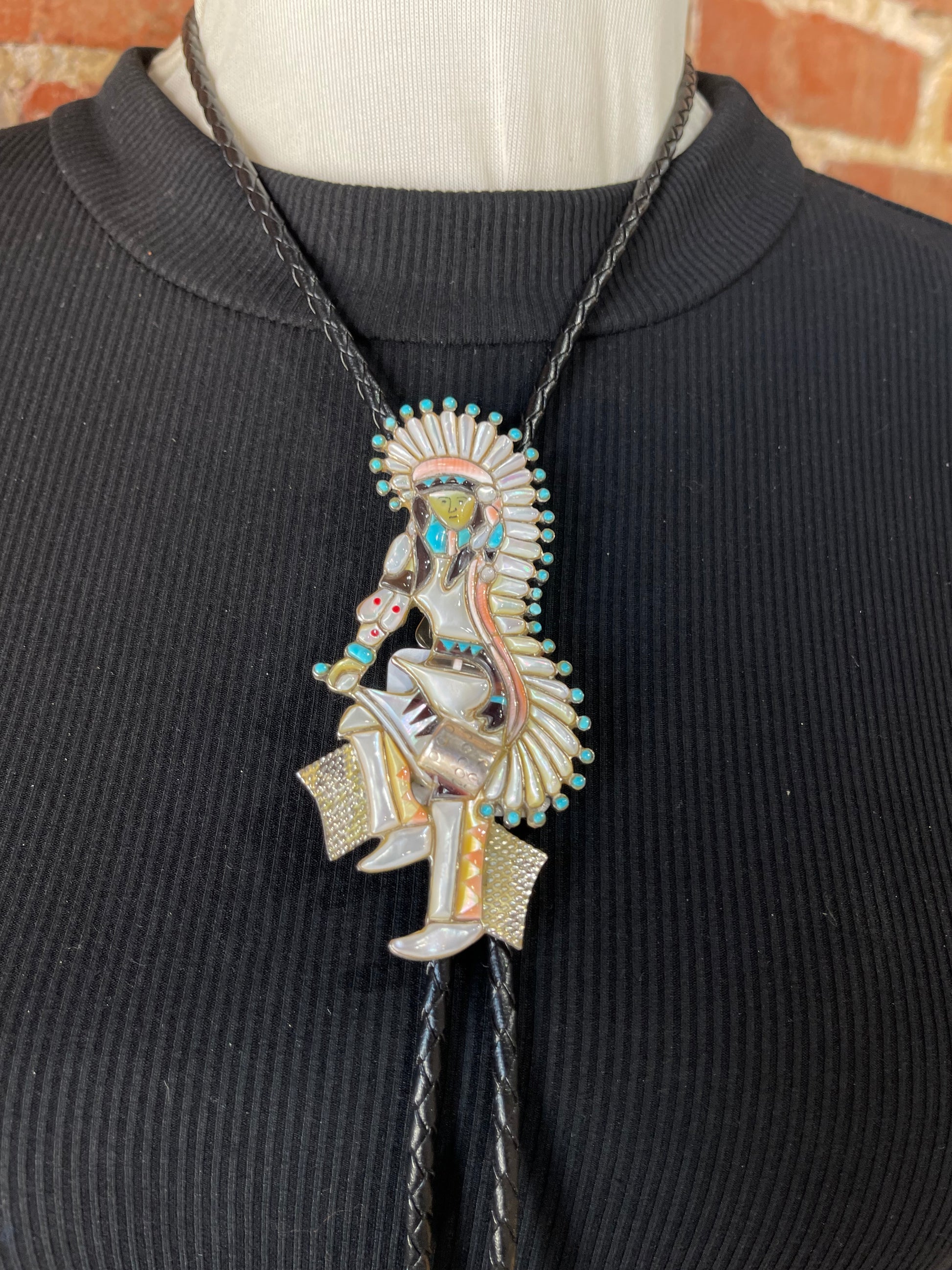 Experience the beauty and tradition of Native American culture with our Vintage Inlay Bolo Ties. Crafted with Mother of Pearl, turquoise, Pink Conch Shell, and Black Onyx, these stunning pieces feature the shape of traditional dancers and are sold as a pair. Elevate your style with these unique and meaningful bolo ties today!