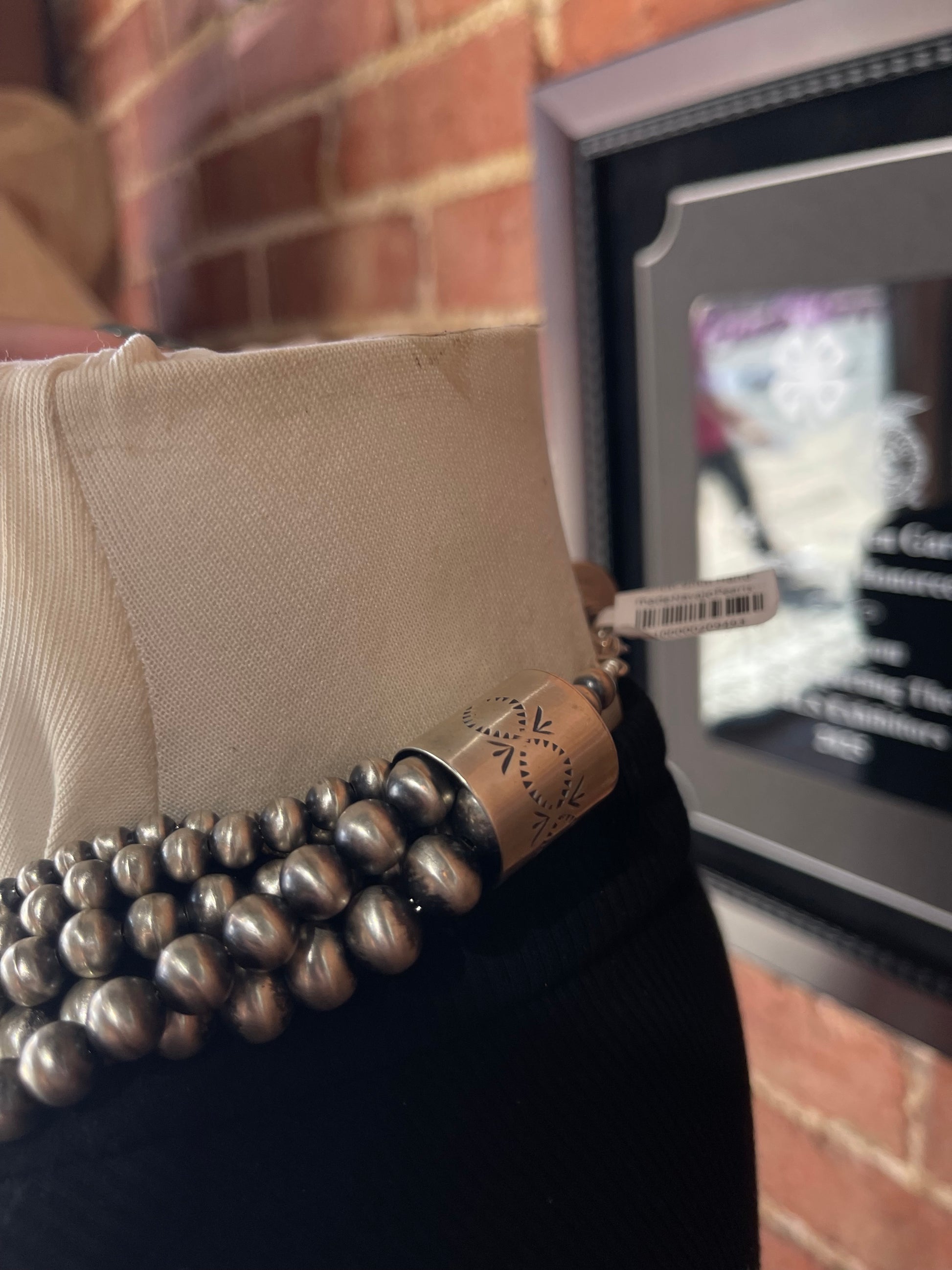 Elevate your jewelry collection with this exquisite 18" handmade Navajo pearls necklace by Jan Mariano. Featuring five strands of authentically crafted 5mm to 9mm pearls, each piece showcases traditional Navajo artistry and timeless elegance. Perfect for adding a unique, cultural touch to both casual and formal looks, this necklace offers a blend of heritage and style that stands out effortlessly.