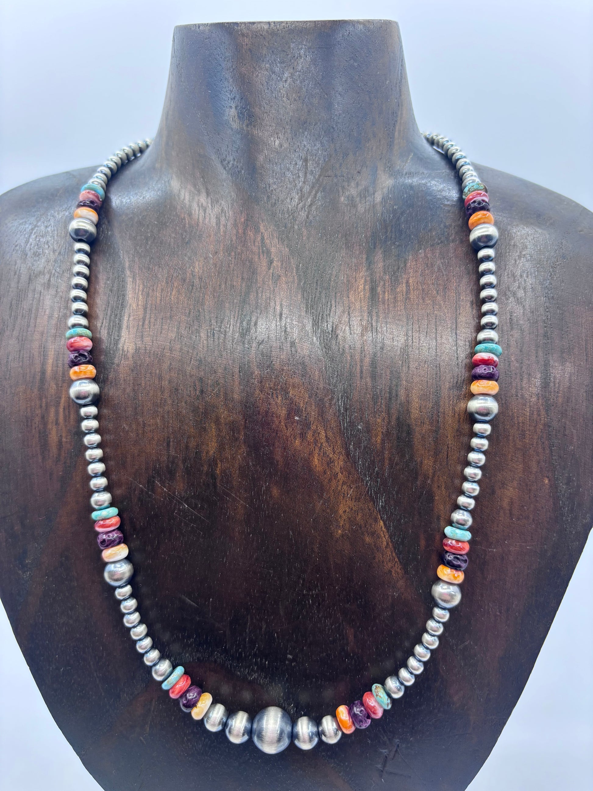 Elevate your jewelry collection with authentic Navajo Pearls that blend timeless craftsmanship with versatile style. This stunning piece features a dynamic mix of stone sizes—from delicate 4mm to bold 10mm beads—creating visual depth and movement with every wear. The 18" length with a 1.5" extender adapts to your neckline, whether layered with other pieces or worn solo for maximum impact. Each pearl showcases the natural beauty and heritage artistry that defines genuine Navajo jewelry, making it a meaningful addition to your everyday rotation or special occasion wardrobe.