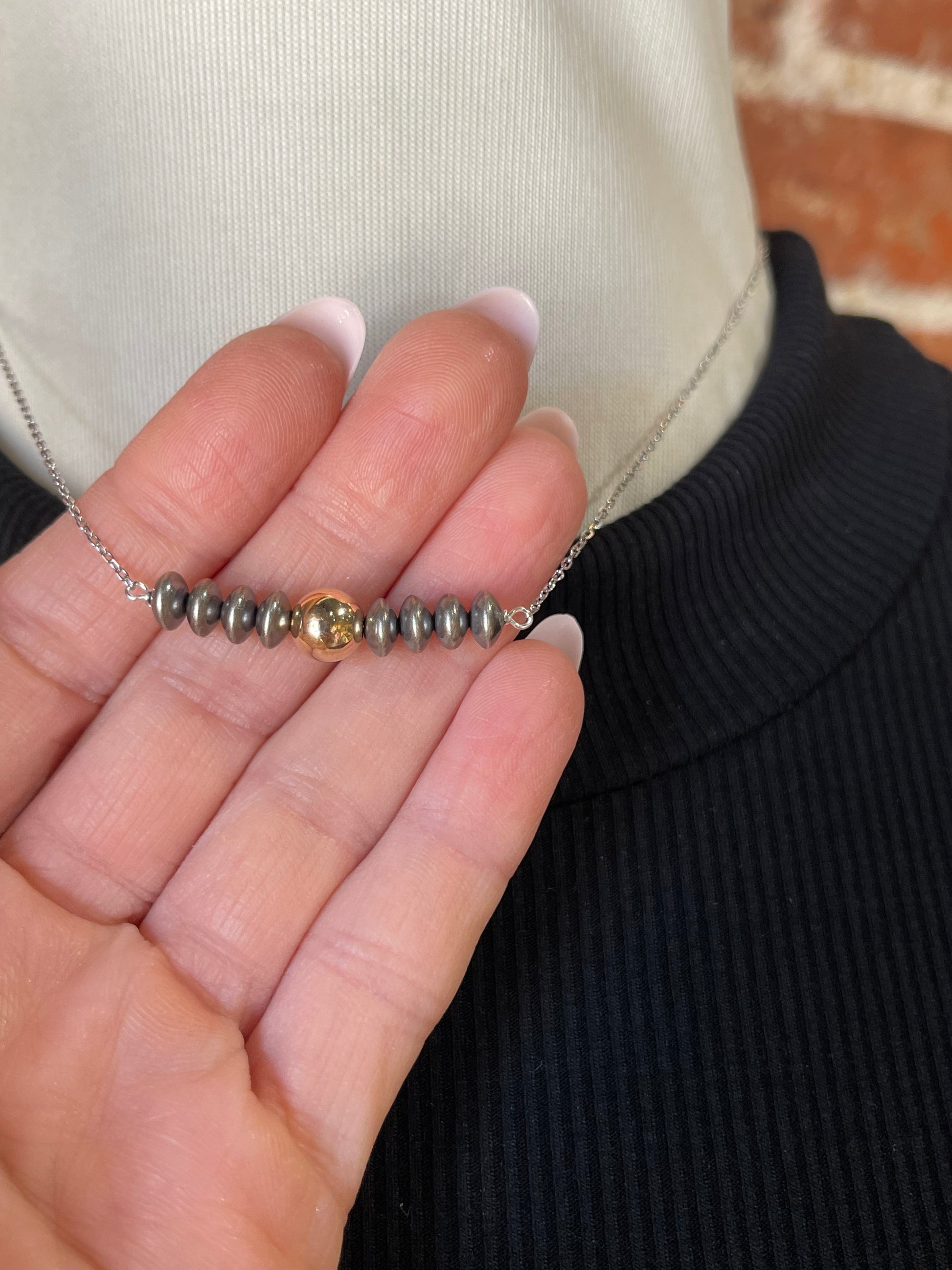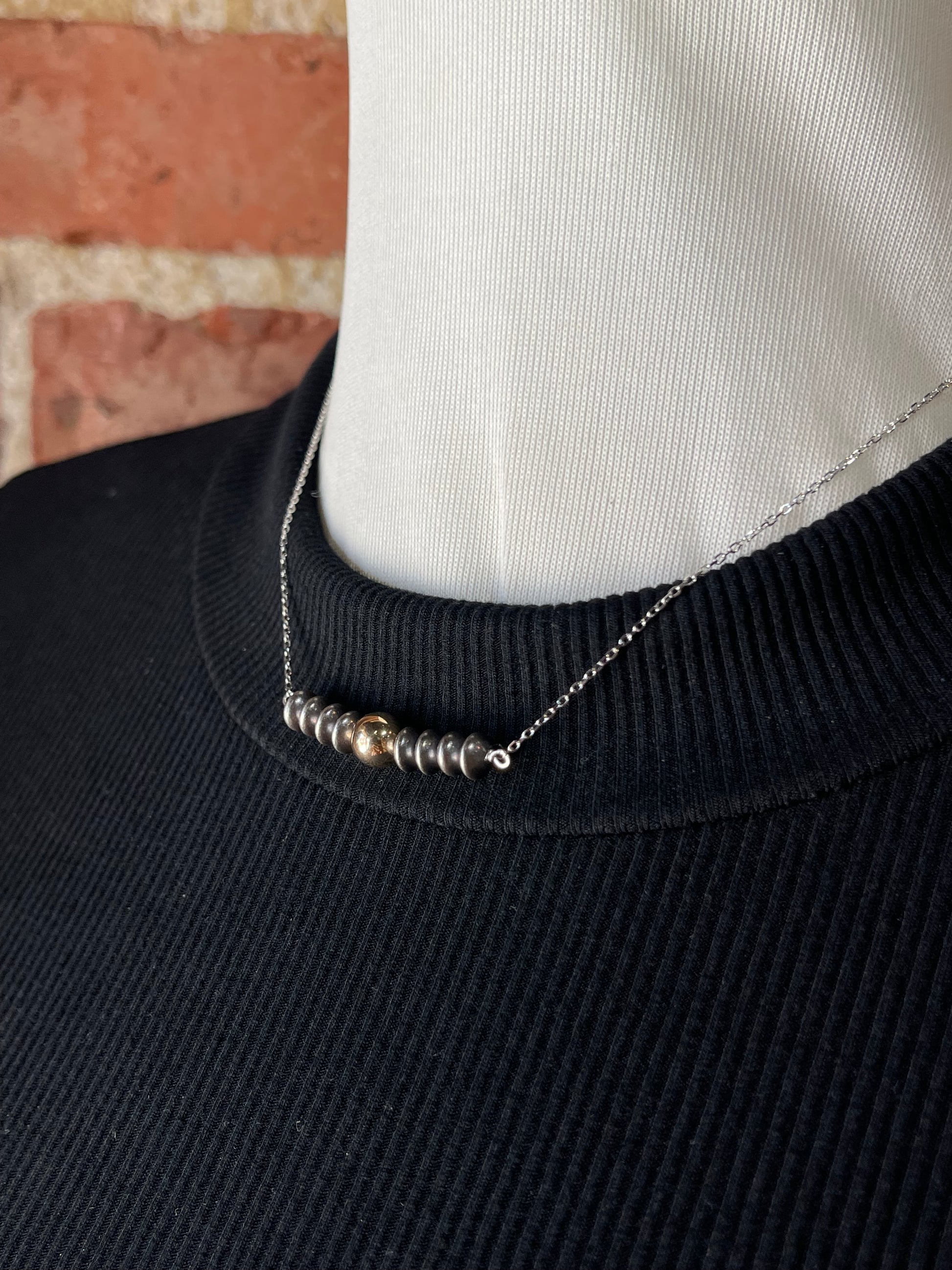 Elevate your style with this 16" necklace featuring 7mm 14k gold-filled beads paired with 6mm silver discs. The contrasting metals create a sophisticated look that complements any outfit, while the durable gold-filled construction ensures lasting shine and quality. Perfect for layering or wearing alone, this necklace adds a touch of elegance to your everyday wardrobe.