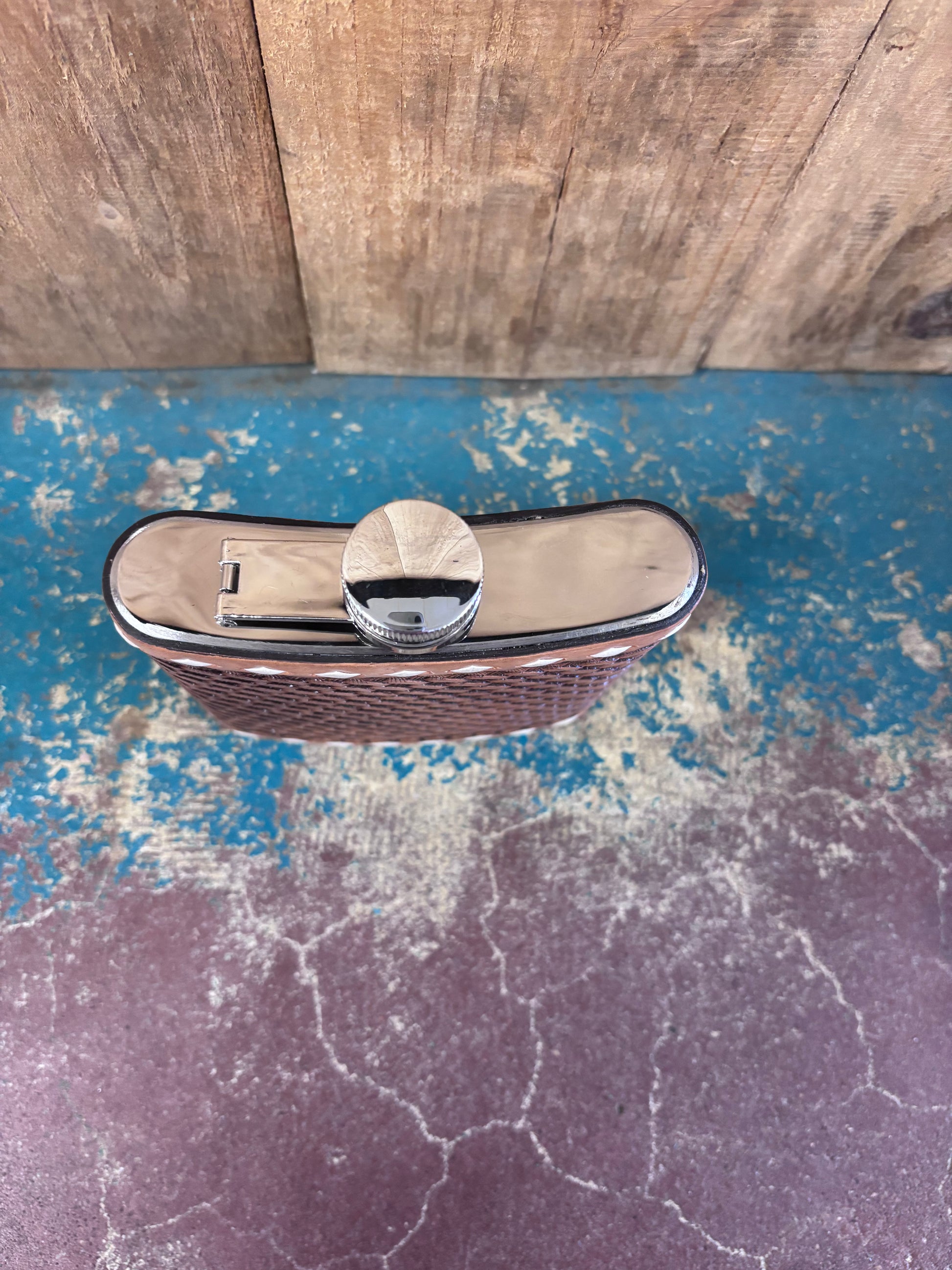 This handcrafted flask combines rugged style with practical elegance. Standing 5.5 inches tall with matching width, it fits perfectly in your pack. Premium brown leather wraps the body with distinctive buck stitching along every edge, adding durability and authentic Western charm. Polished silver accents on the top and bottom catch the light while reinforcing the flask's sturdy construction. Whether you're heading to the ranch, tailgate, or adventure ahead, this basketweave tooled design makes a statement that's as tough as it is refined. The attached screw on lid helps avoid spillage and keeps you from losing the top.