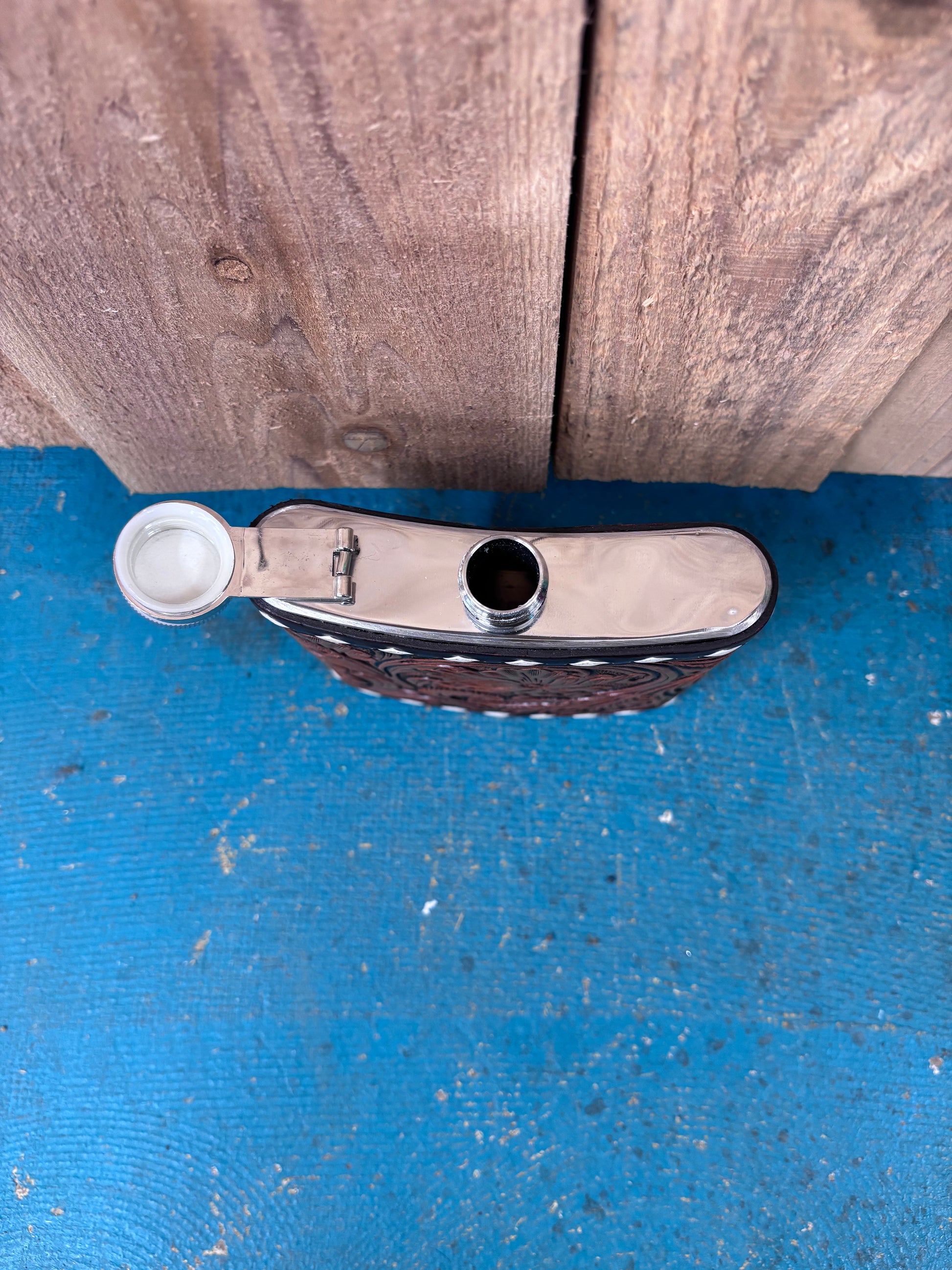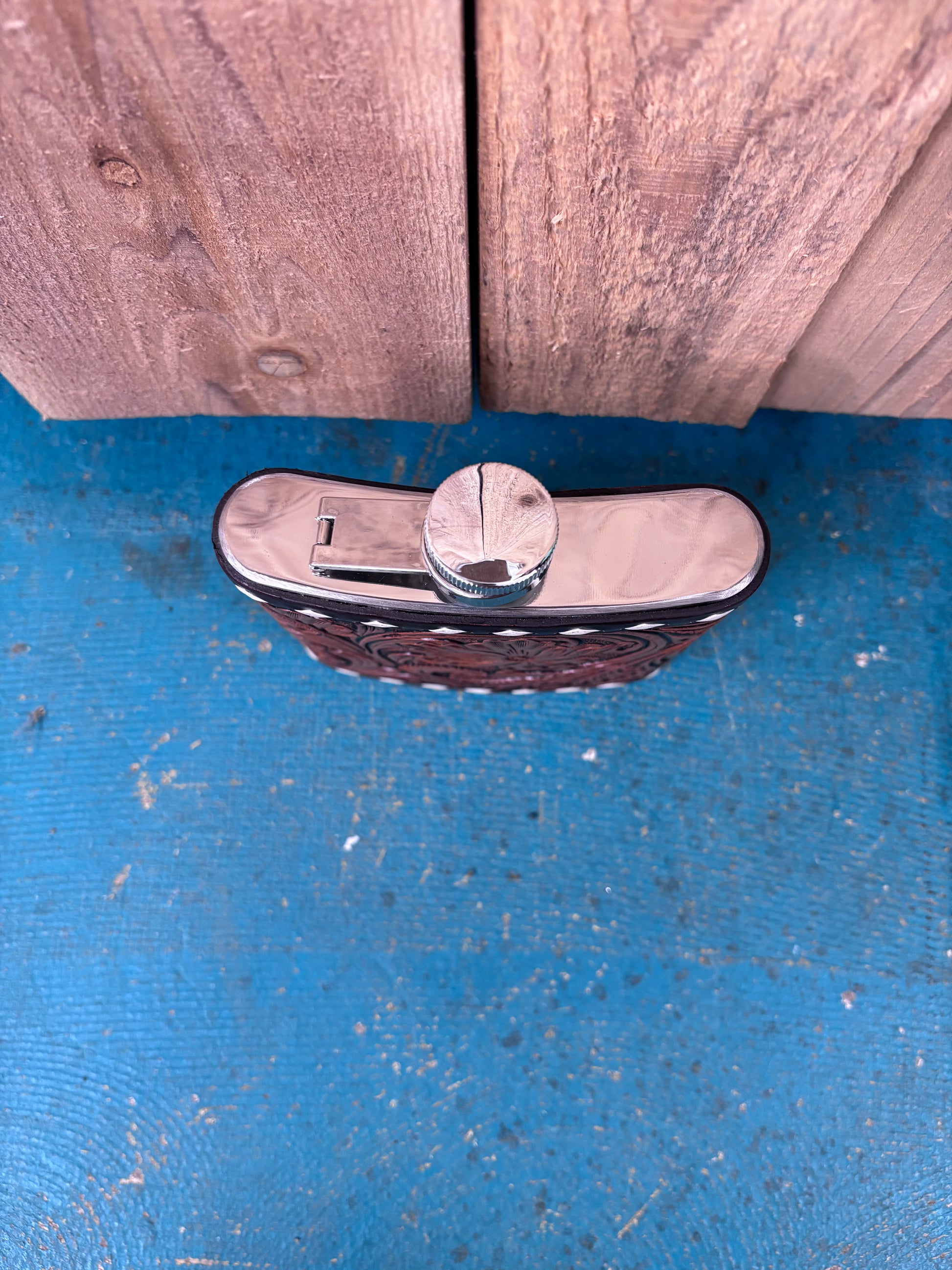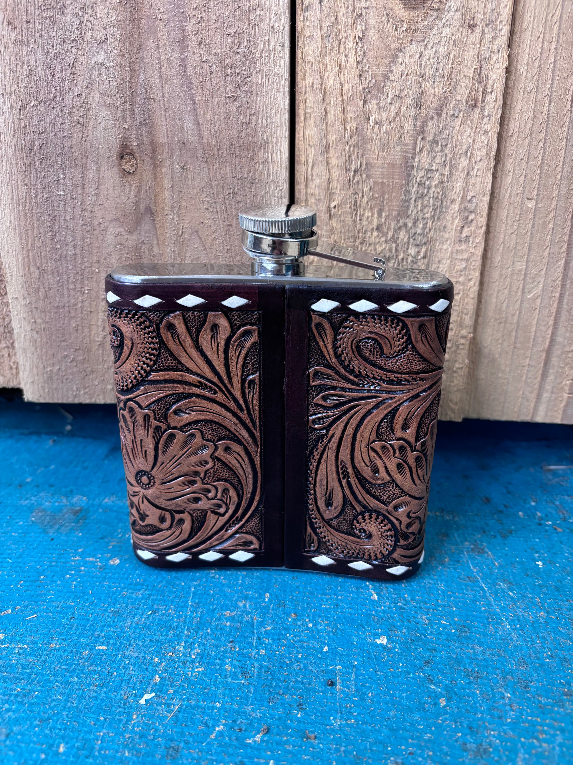This handcrafted flask combines rugged style with practical elegance. Standing 5.5 inches tall with matching width, it fits perfectly in your pack. Premium brown leather wraps the body with distinctive buck stitching along every edge, adding durability and authentic Western charm. Polished silver accents on the top and bottom catch the light while reinforcing the flask's sturdy construction. Whether you're heading to the ranch, tailgate, or adventure ahead, this flower tooled design makes a statement that's as tough as it is refined. The attached screw on lid helps avoid spillage and keeps you from losing the top.