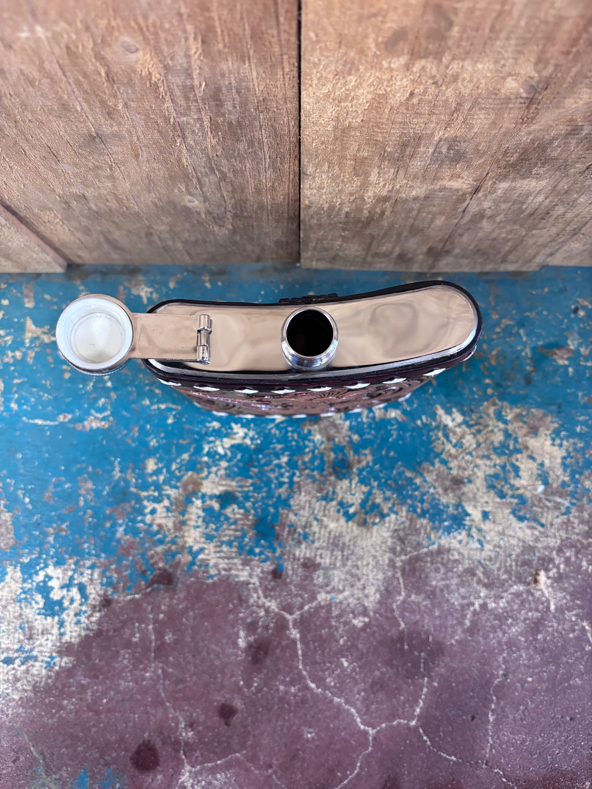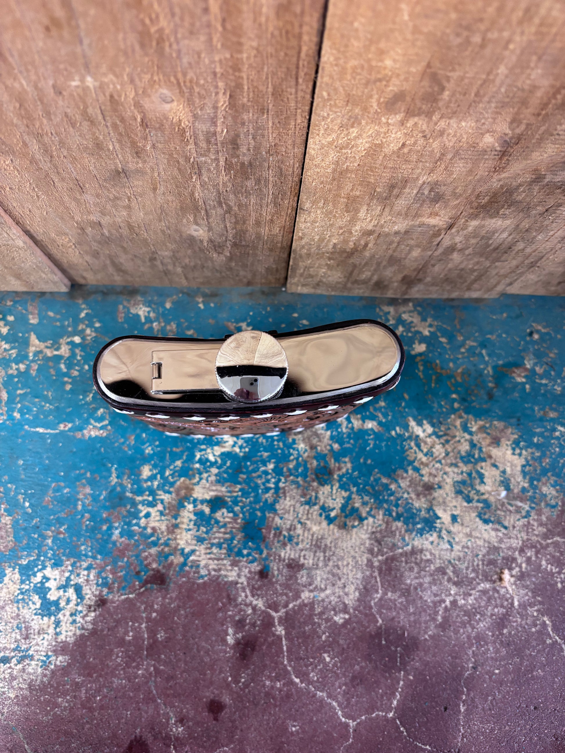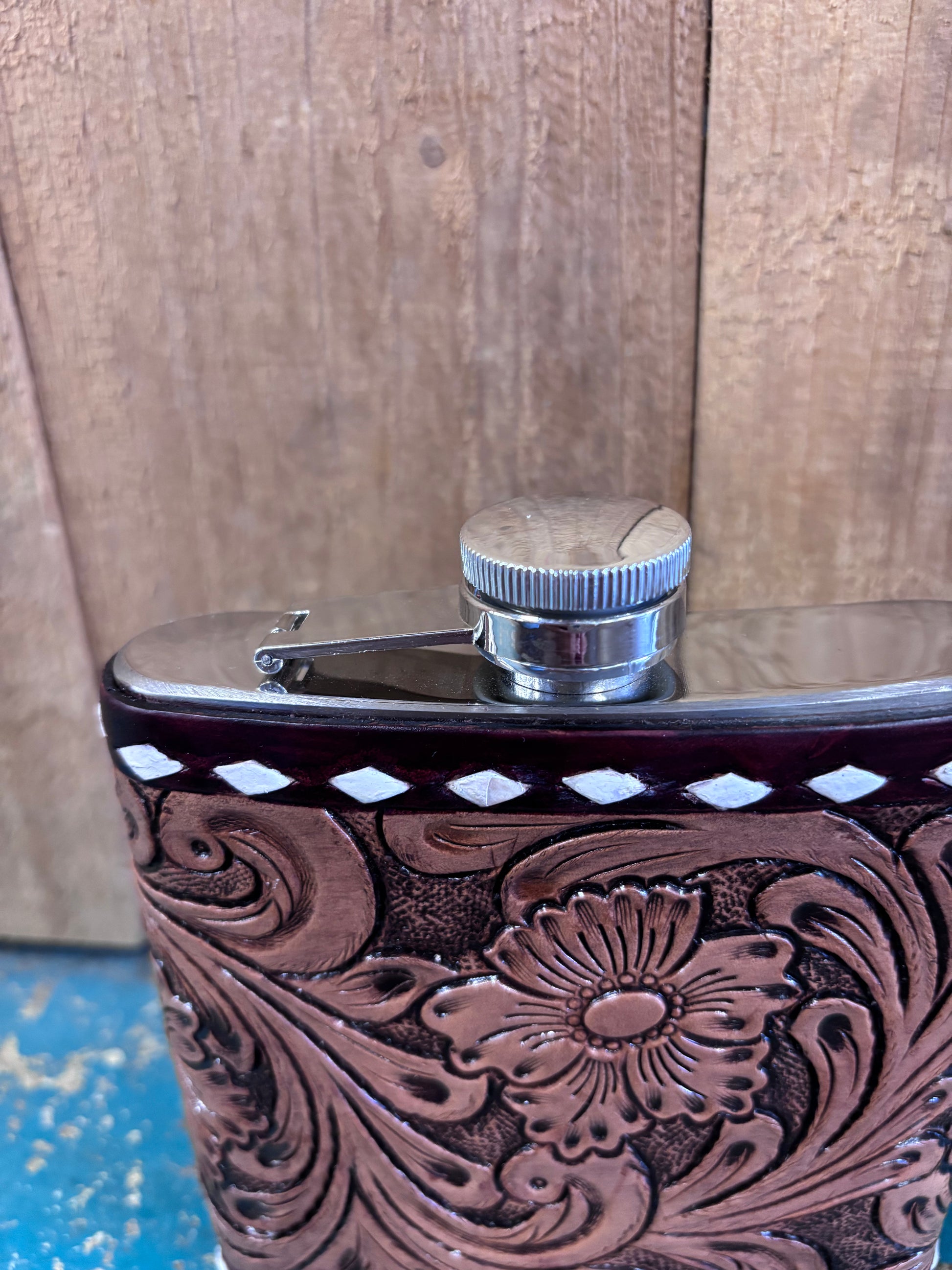 This handcrafted flask combines rugged style with practical elegance. Standing 5.5 inches tall with matching width, it fits perfectly in your pack. Premium brown leather wraps the body with distinctive buck stitching along every edge, adding durability and authentic Western charm. Polished silver accents on the top and bottom catch the light while reinforcing the flask's sturdy construction. Whether you're heading to the ranch, tailgate, or adventure ahead, this flower tooled design makes a statement that's as tough as it is refined. The attached screw on lid helps avoid spillage and keeps you from losing the top.