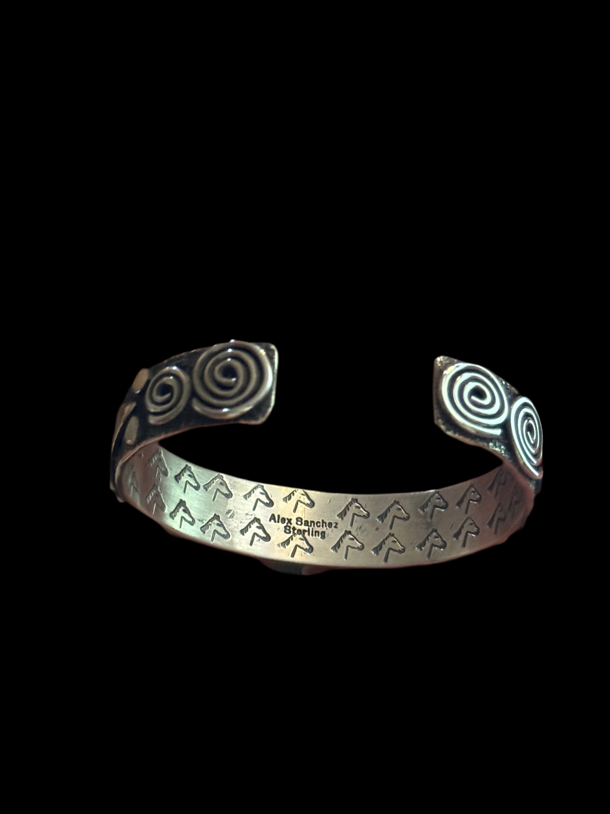 Handcrafted by Navajo artisan Alex Sanchez, this sterling silver cuff showcases authentic Blue Kingman Web turquoise in a striking narrow design. Each petroglyph detail is meticulously stamped into premium .925 sterling silver, creating a piece that honors Native American heritage and craftsmanship. The vibrant blue-green turquoise with natural webbing patterns makes every cuff uniquely one-of-a-kind. Perfect for collectors and those seeking genuine, artisan-made jewelry with cultural significance and timeless appeal.