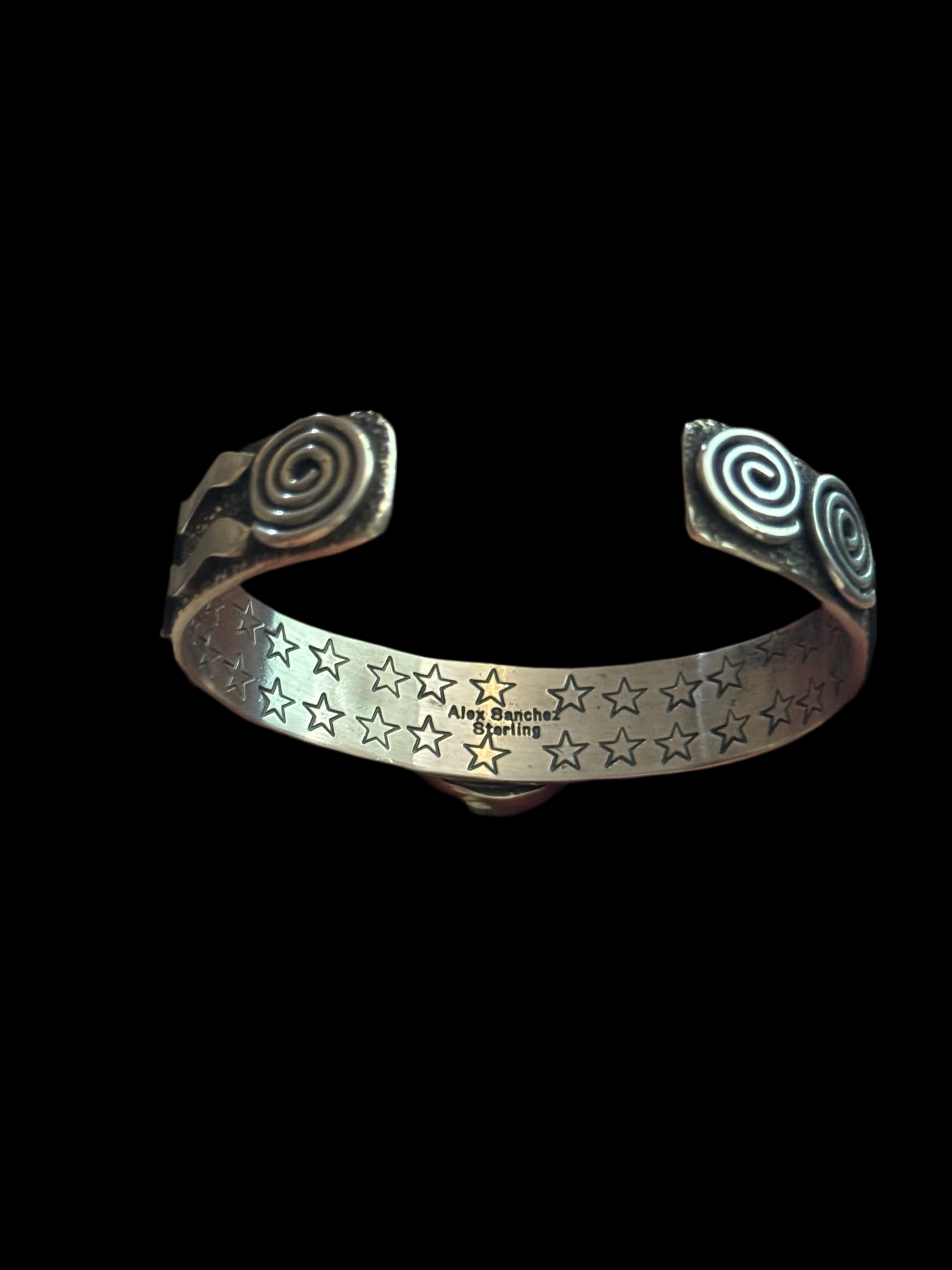 Handcrafted by Navajo artisan Alex Sanchez, this sterling silver cuff showcases authentic Blue Kingman Web turquoise in a striking narrow design. Each petroglyph detail is meticulously stamped into premium .925 sterling silver, creating a piece that honors Native American heritage and craftsmanship. The vibrant blue-green turquoise with natural webbing patterns makes every cuff uniquely one-of-a-kind. Perfect for collectors and those seeking genuine, artisan-made jewelry with cultural significance and timeless appeal.