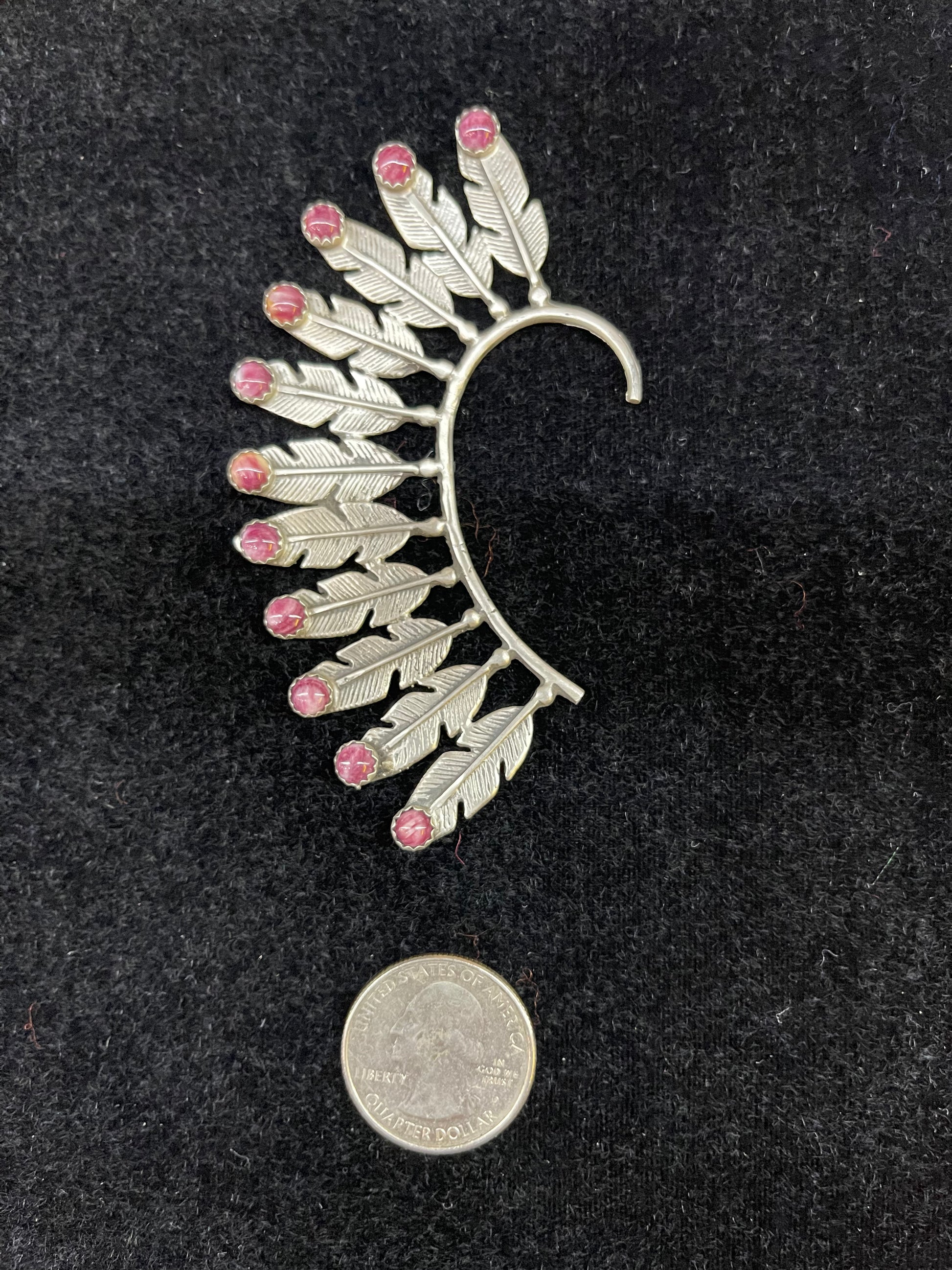 This stunning Purple Spiny Oyster Feather Ear Cuff is crafted with sterling silver and measures 4'' long. It makes an elegant addition to any wardrobe for a classic and sophisticated look.