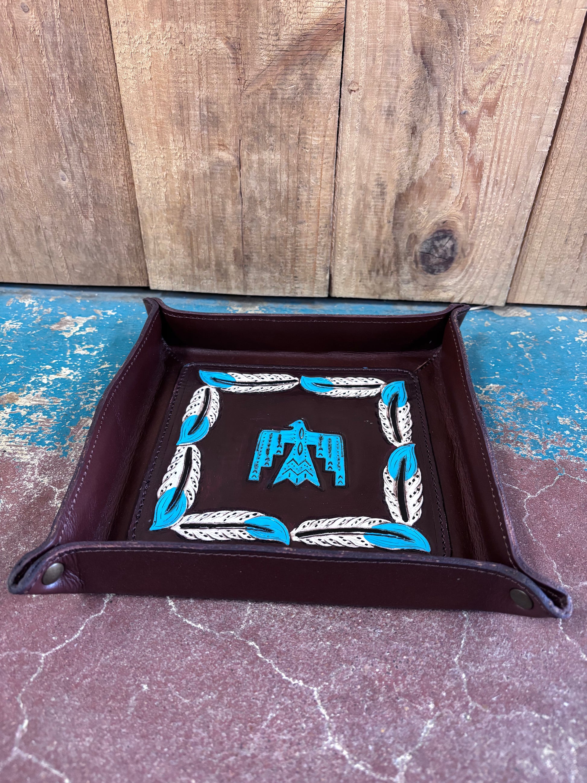 Display your finest pieces with this handcrafted leather jewelry tray. Standing 9 inches tall and wide, it features rich brown leather accented with striking Turquoise and White tooling down the center—a design of feathers and in the middle a bird that complements both traditional and contemporary collections. Perfect for organizing rings, bracelets, and pendants while adding artisanal character to your vanity, dresser, or retail display. The durable leather construction ensures this piece becomes a cherished accessory organizer for years to come.