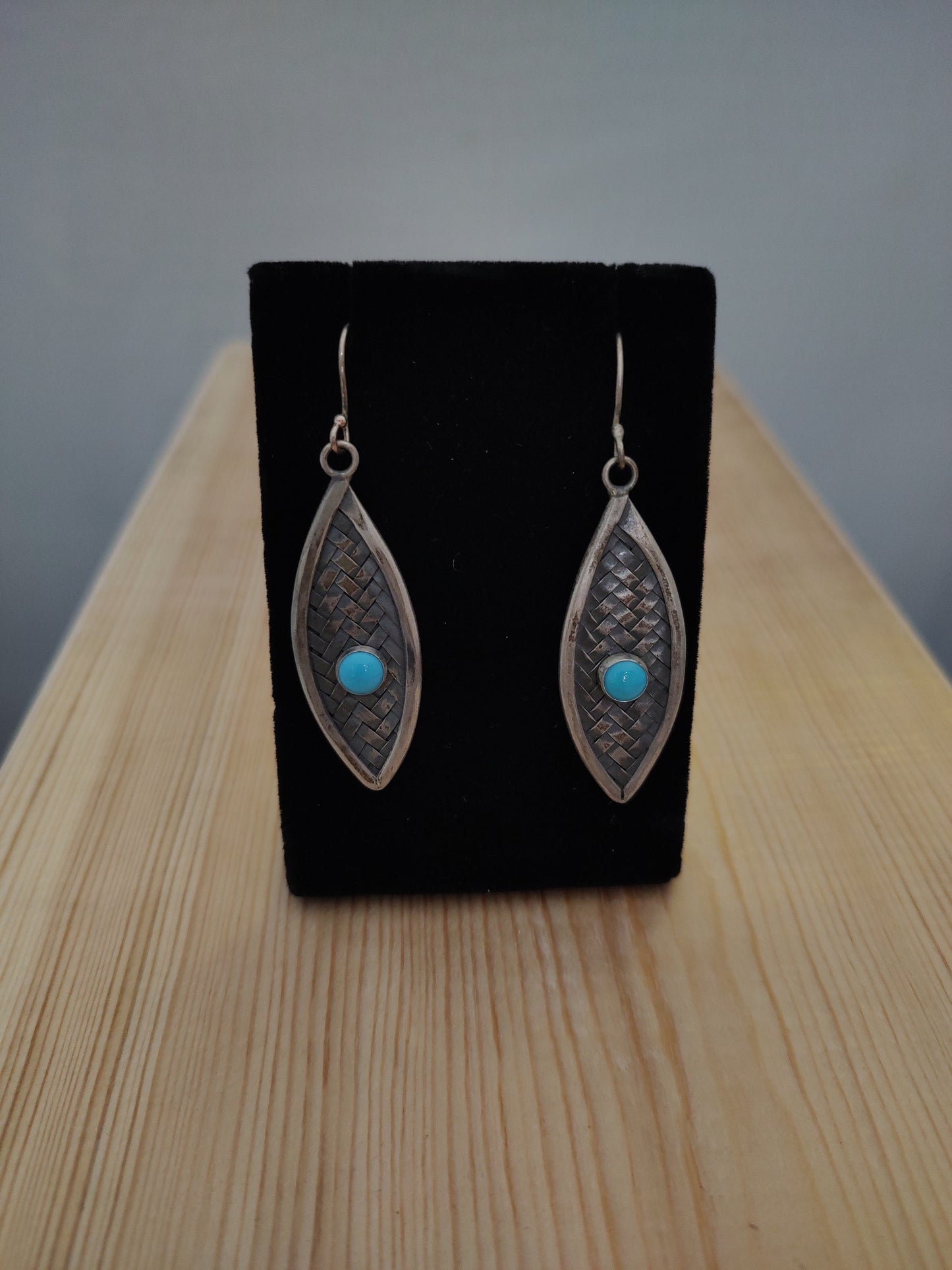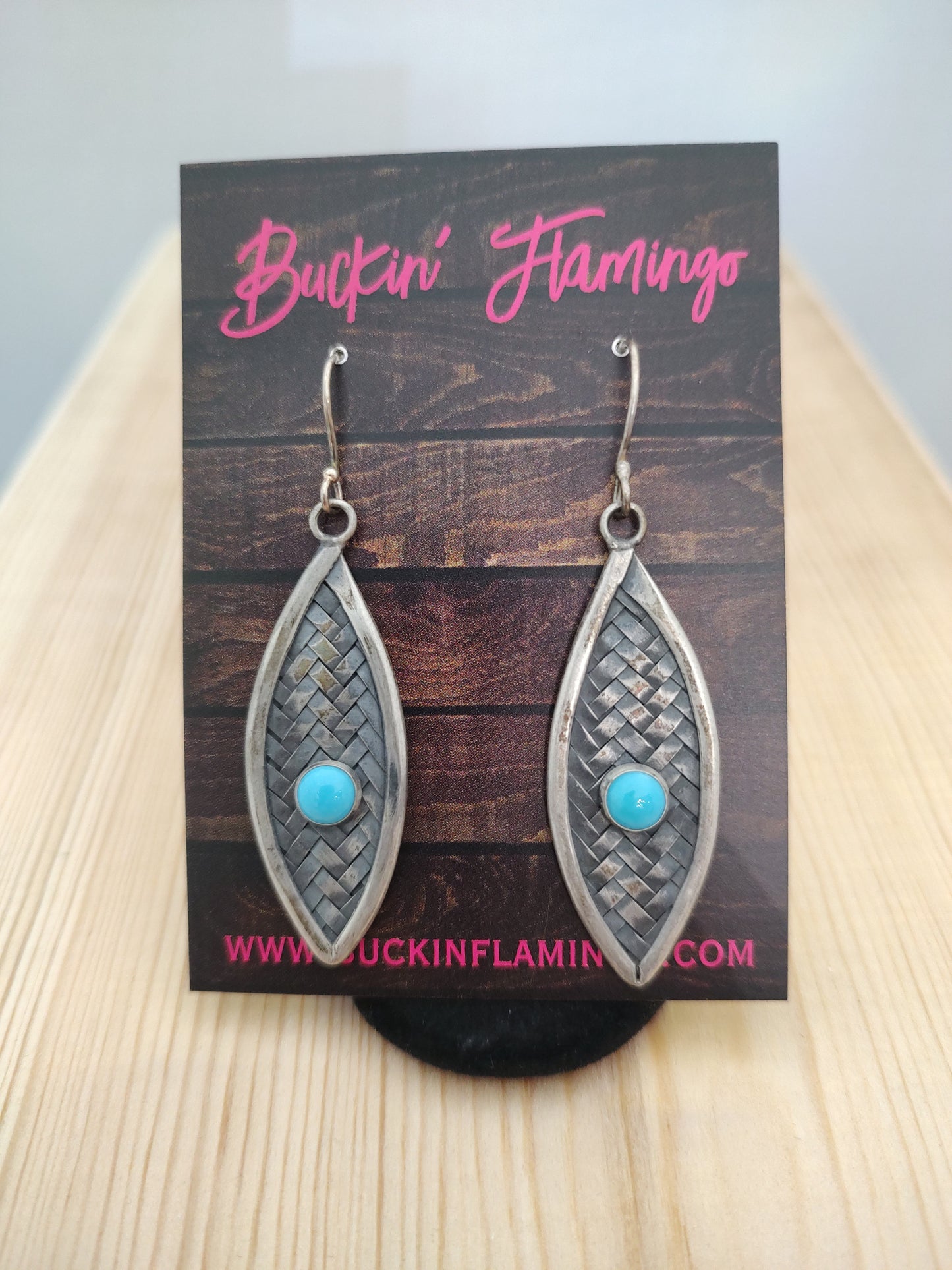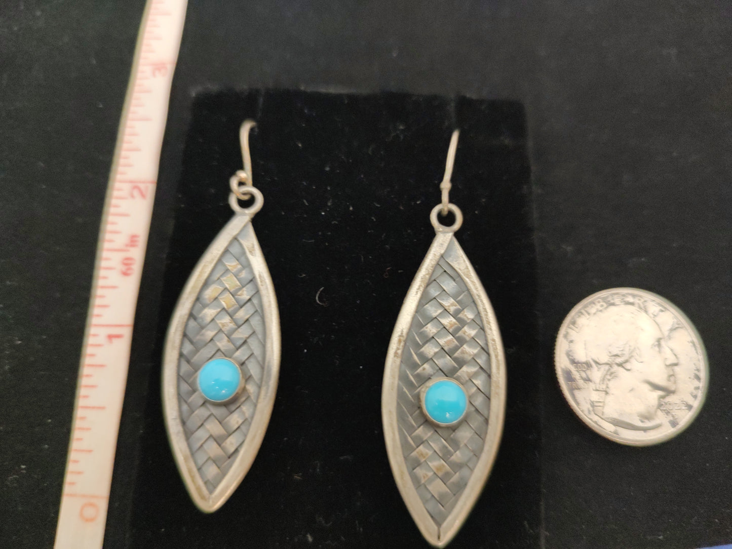 These hook earrings have sleeping beauty cabochon on-basket weave silver, a great addition to any collection.