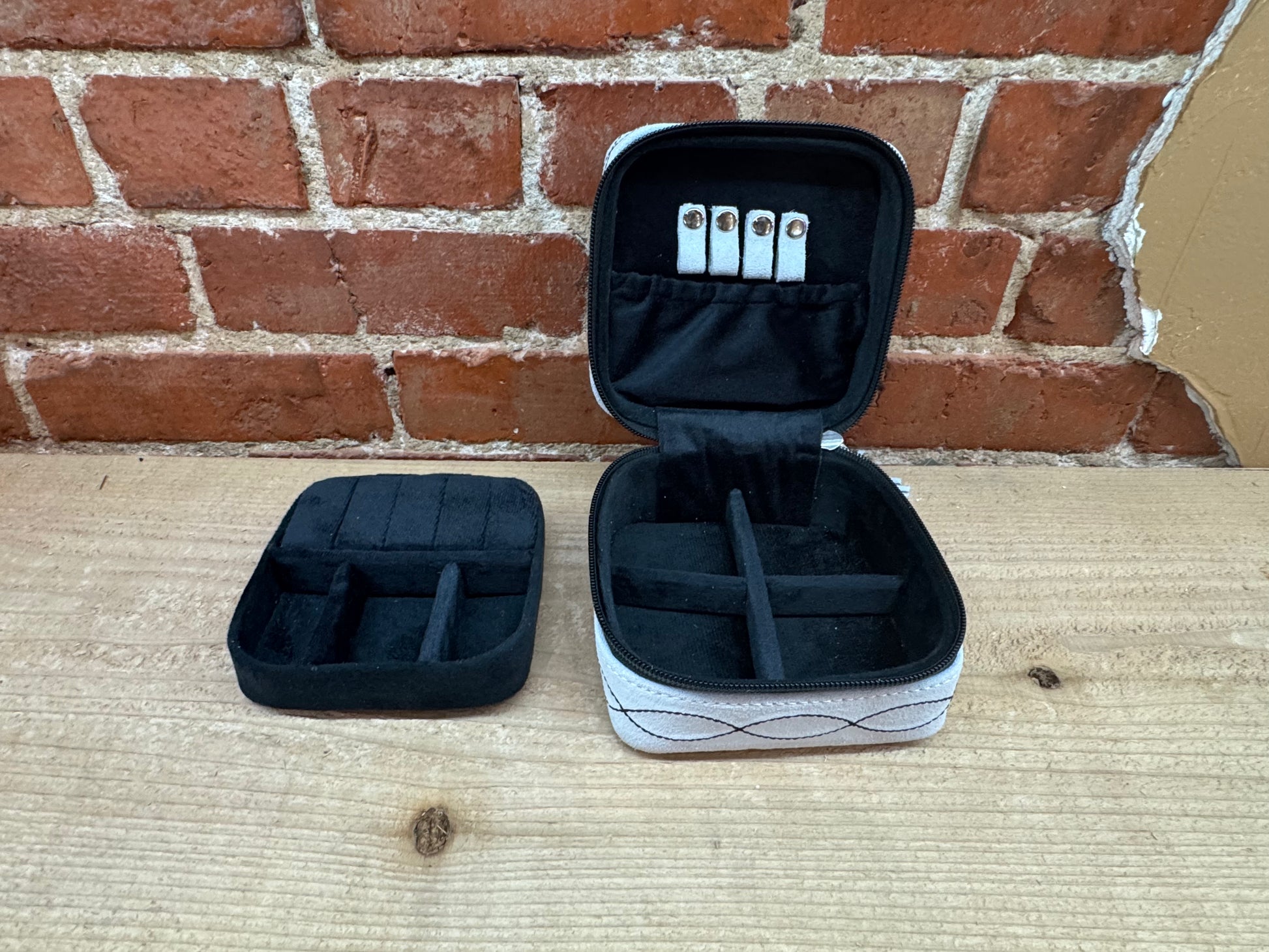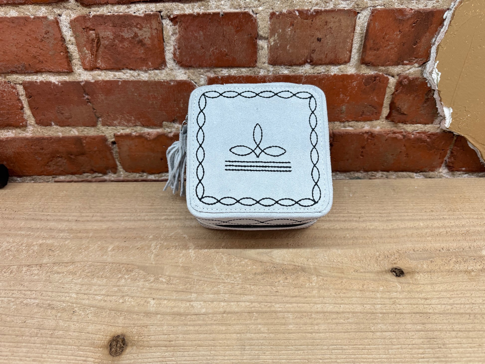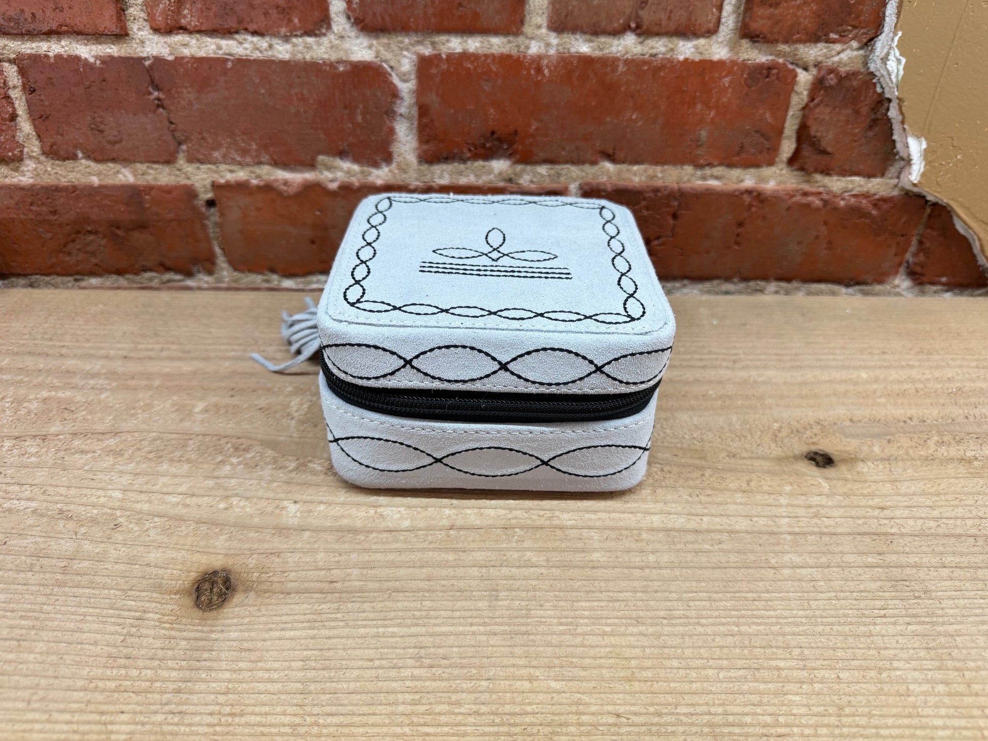 This Suede Leather Boot Stitch Jewelry Box offers a sleek and stylish way to protect your precious accessories. Crafted from soft white suede leather with contrasting black stitching, it measures a convenient 5" long, 5" wide, and 3" tall—compact yet spacious enough to hold your essentials. The black felt interior cushions your jewelry, while the fringe-accented zipper adds a unique, fashionable detail. Durable and elegant, this jewelry box is perfect for keeping your treasures organized at home or on the go.