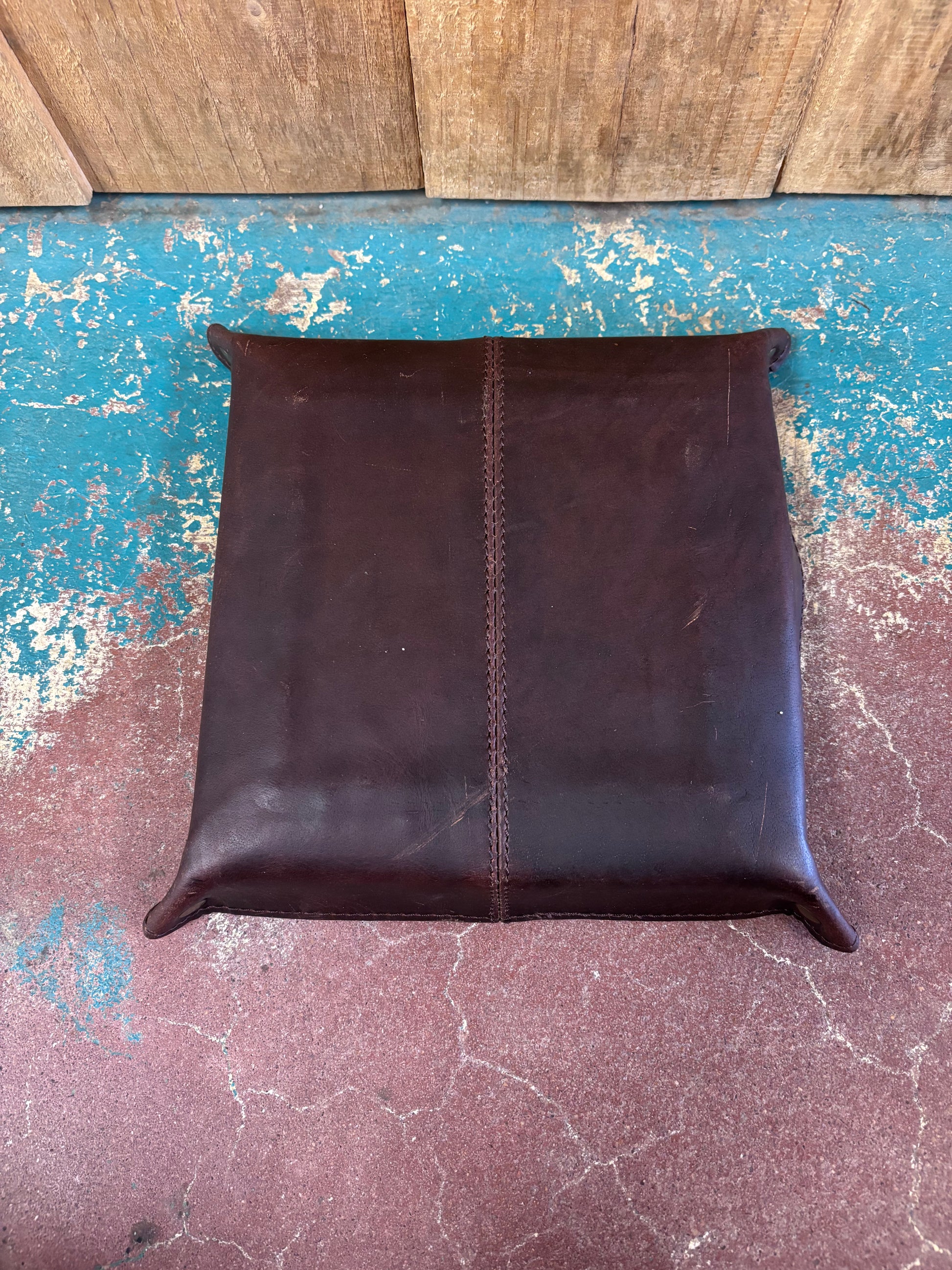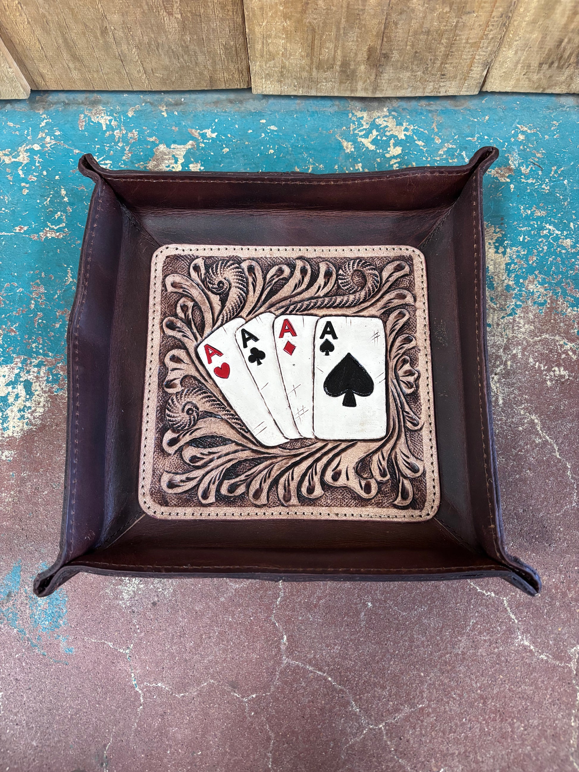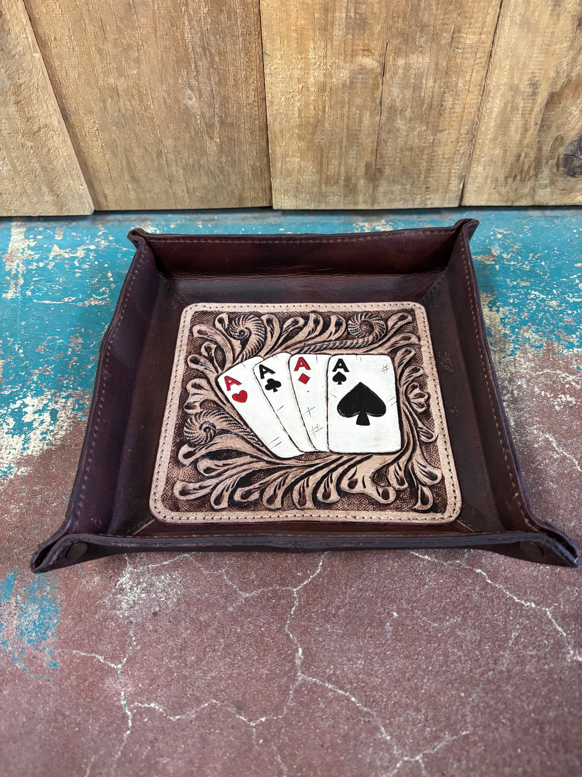 Display your finest pieces with this handcrafted leather jewelry tray. Standing 9 inches tall and wide, it features rich brown leather accented with a striking suit of aces tooling design that complements both traditional and contemporary collections. Perfect for organizing rings, bracelets, and pendants while adding artisanal character to your vanity, dresser, or retail display. The durable leather construction ensures this piece becomes a cherished accessory organizer for years to come.