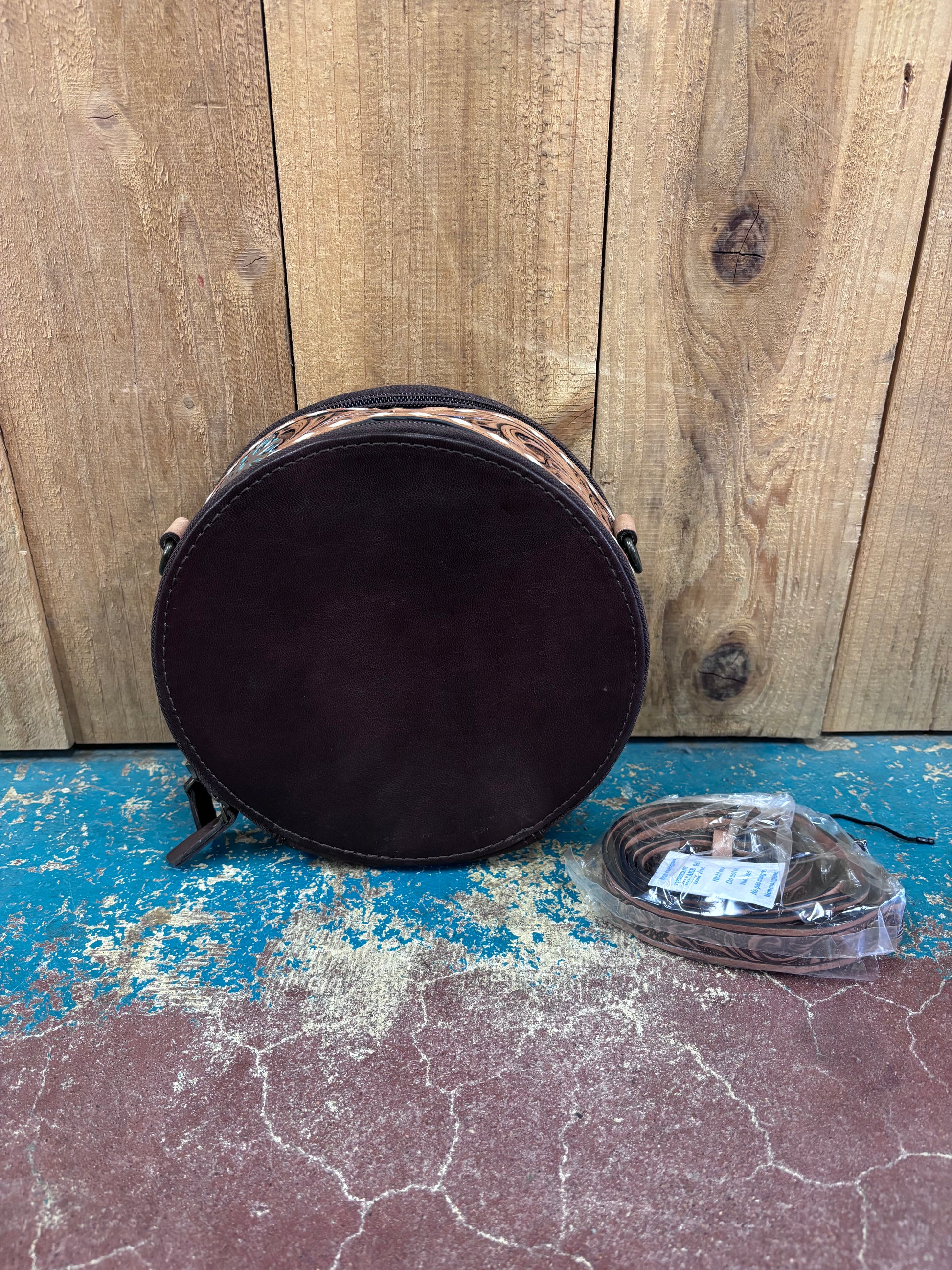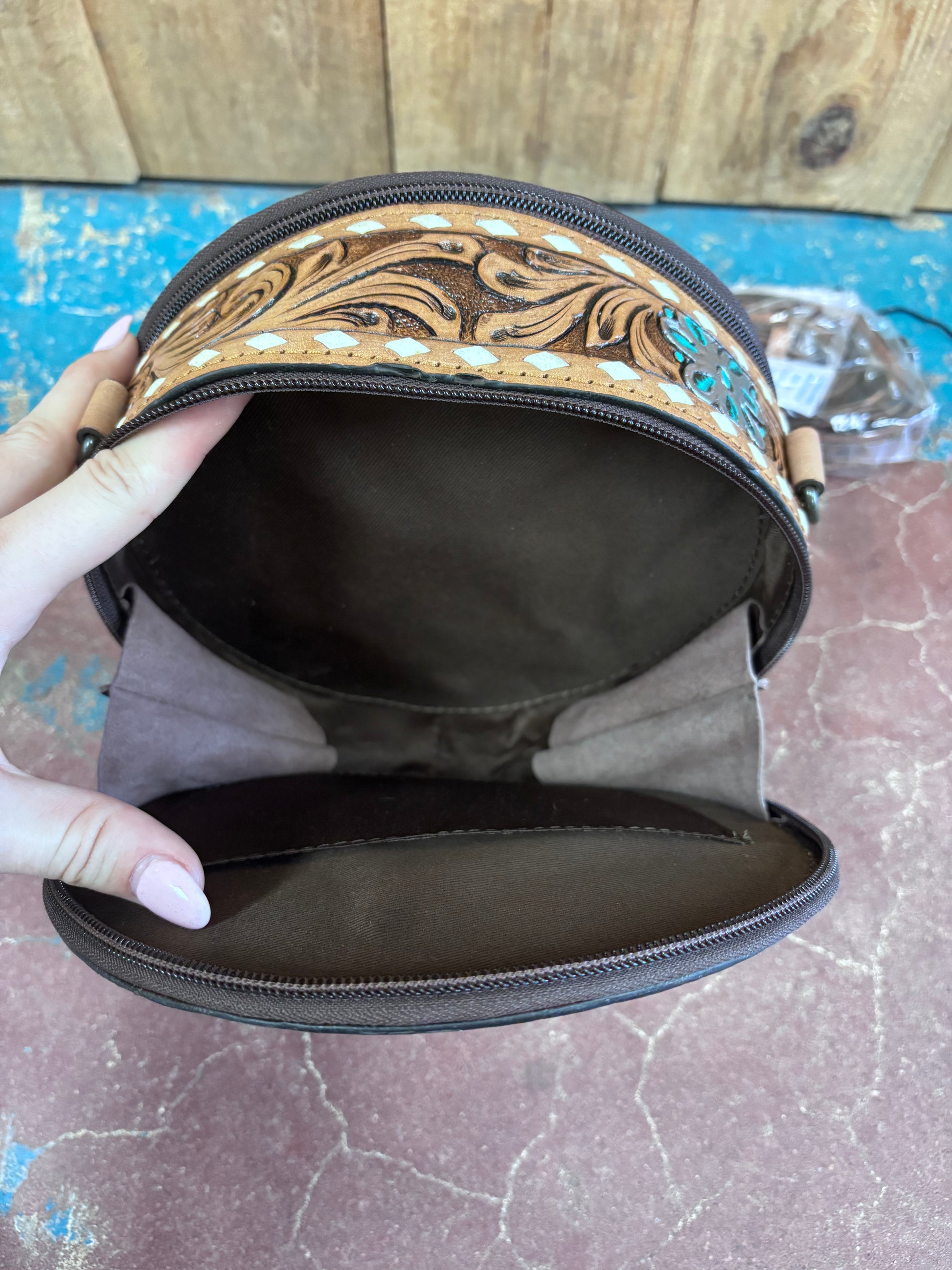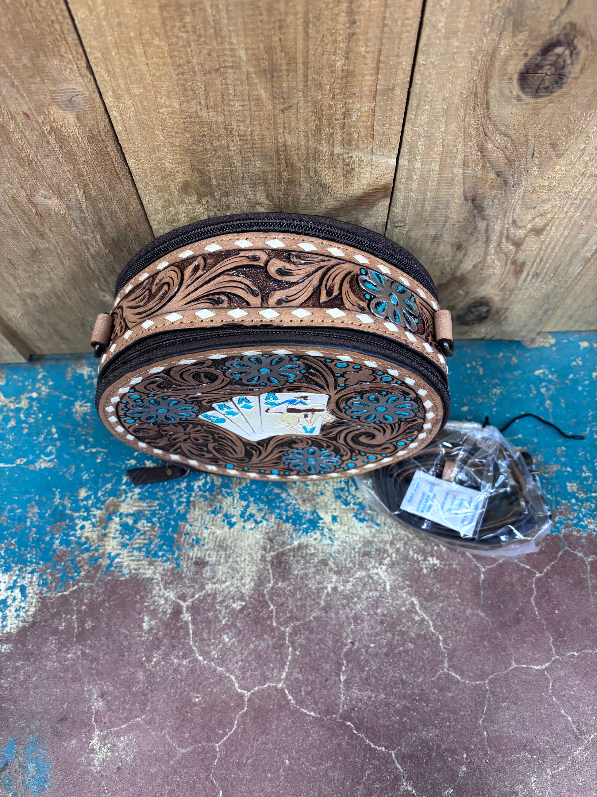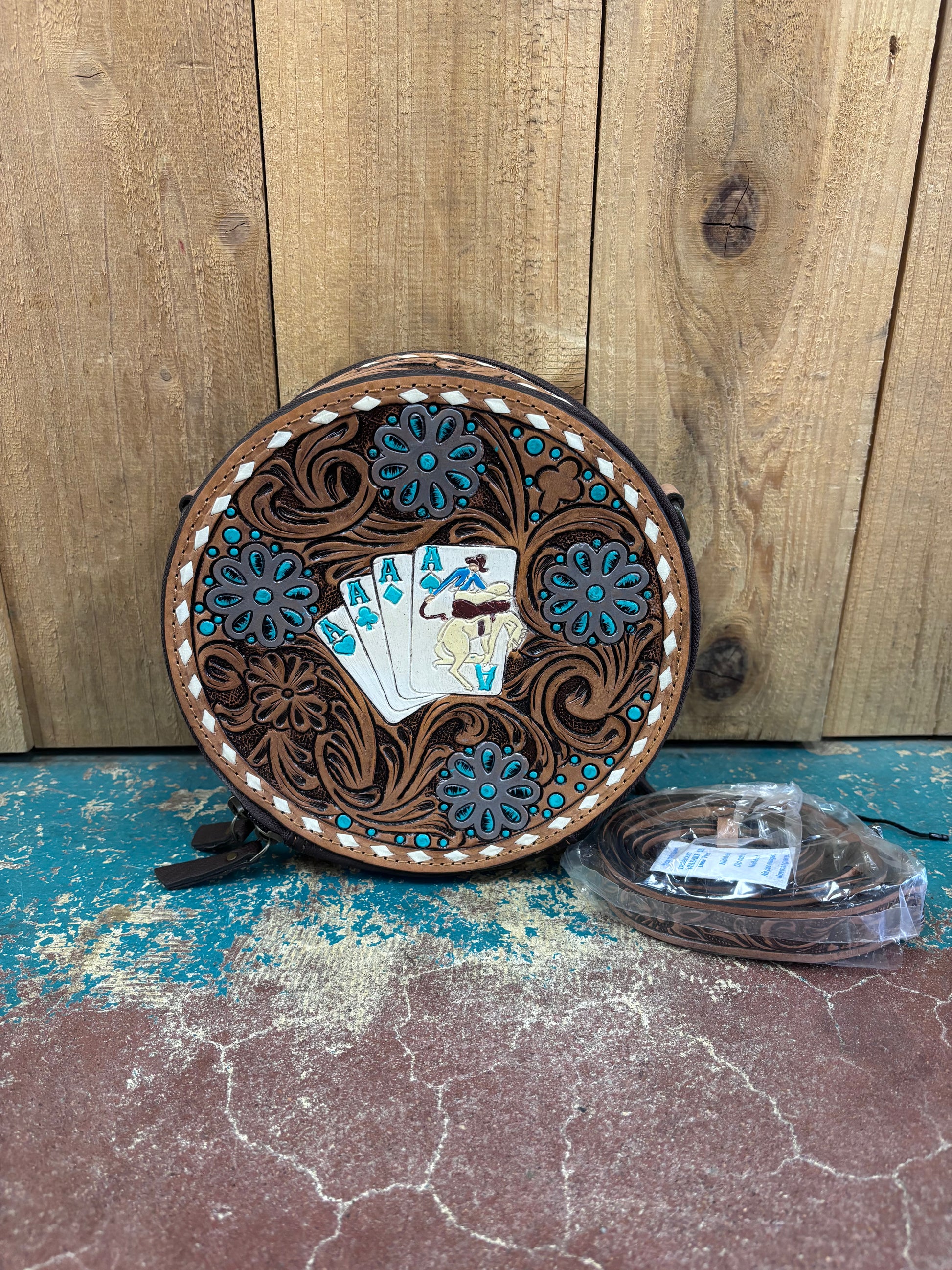 Carry Western style with this handcrafted leather canteen purse, measuring 8x8 inches. Featuring intricate brown flower tooling and a striking suit of aces design on both sides, this piece showcases authentic buck stitching along the edges for durability and rustic charm. The matching tooled leather strap keeps your essentials secure while complementing the bag's artisan aesthetic. Two zippered pockets provide organized storage, each with an additional side pocket for extra compartments. Perfect for rodeos, ranch days, or anyone who appreciates genuine leather craftsmanship and Western flair.