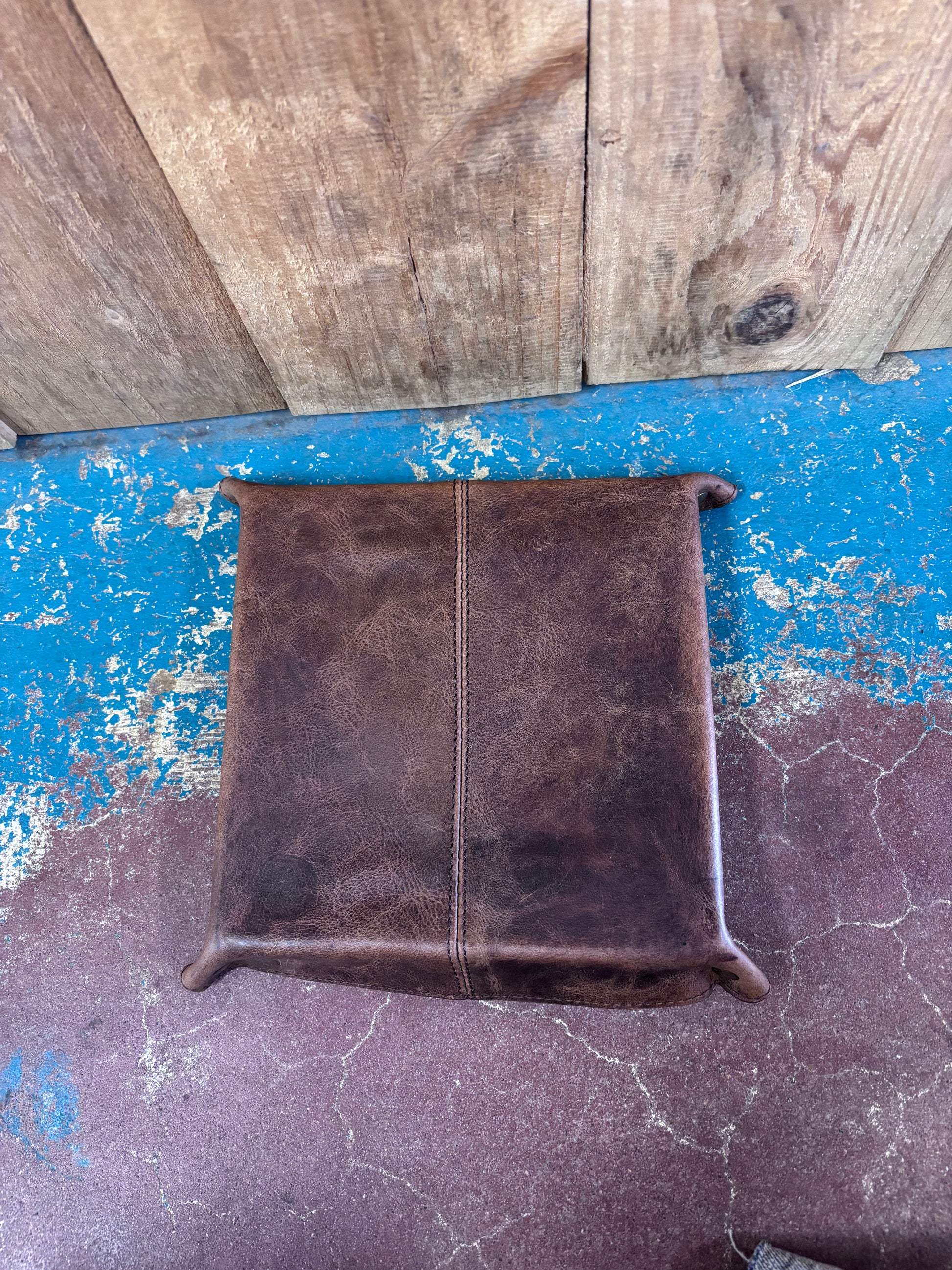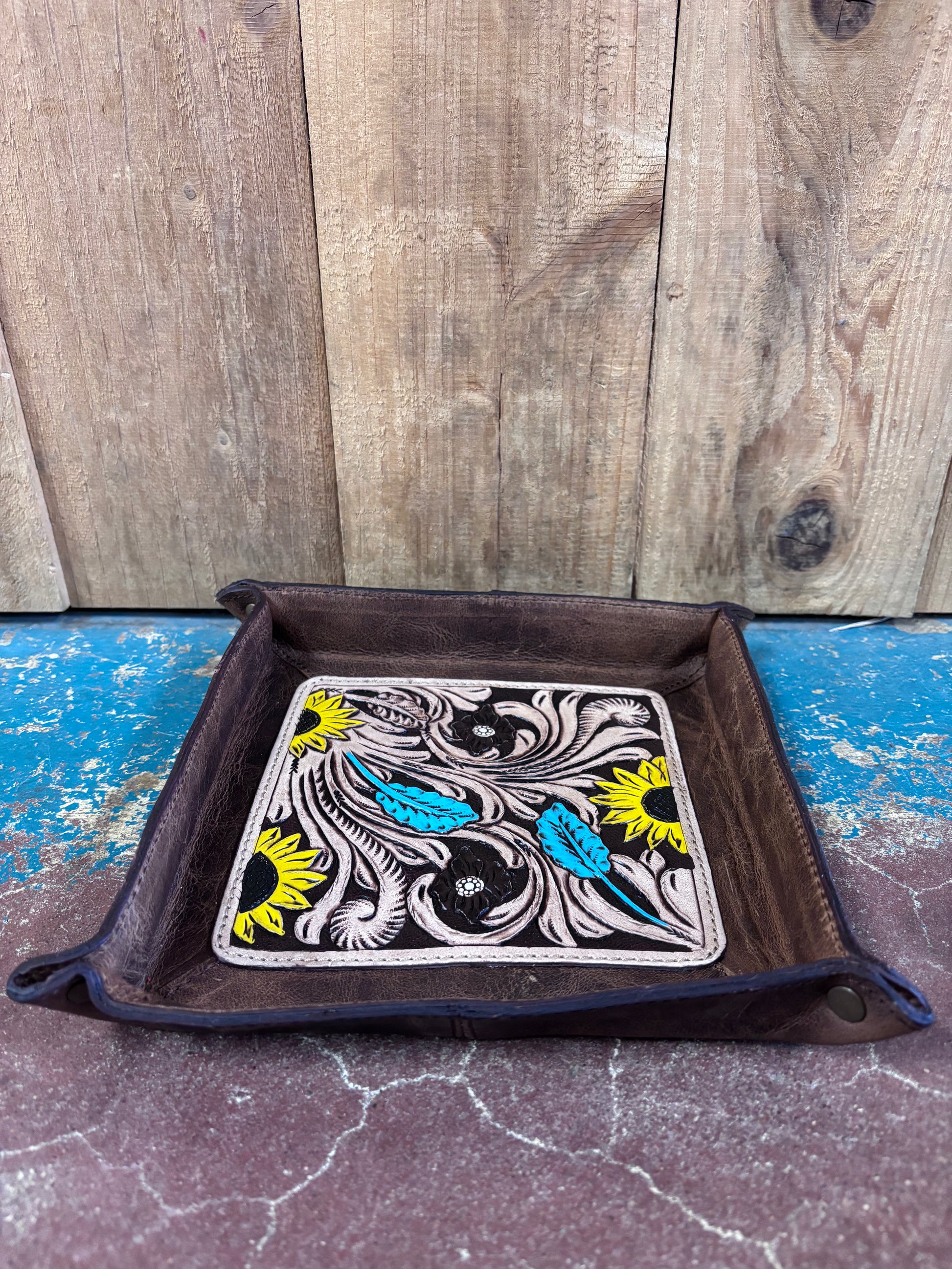 Display your finest pieces with this handcrafted leather jewelry tray. Standing 9 inches tall and wide, it features rich brown leather accented with a striking sunflower design that complements both traditional and contemporary collections. Perfect for organizing rings, bracelets, and pendants while adding artisanal character to your vanity, dresser, or retail display. The durable leather construction ensures this piece becomes a cherished accessory organizer for years to come.