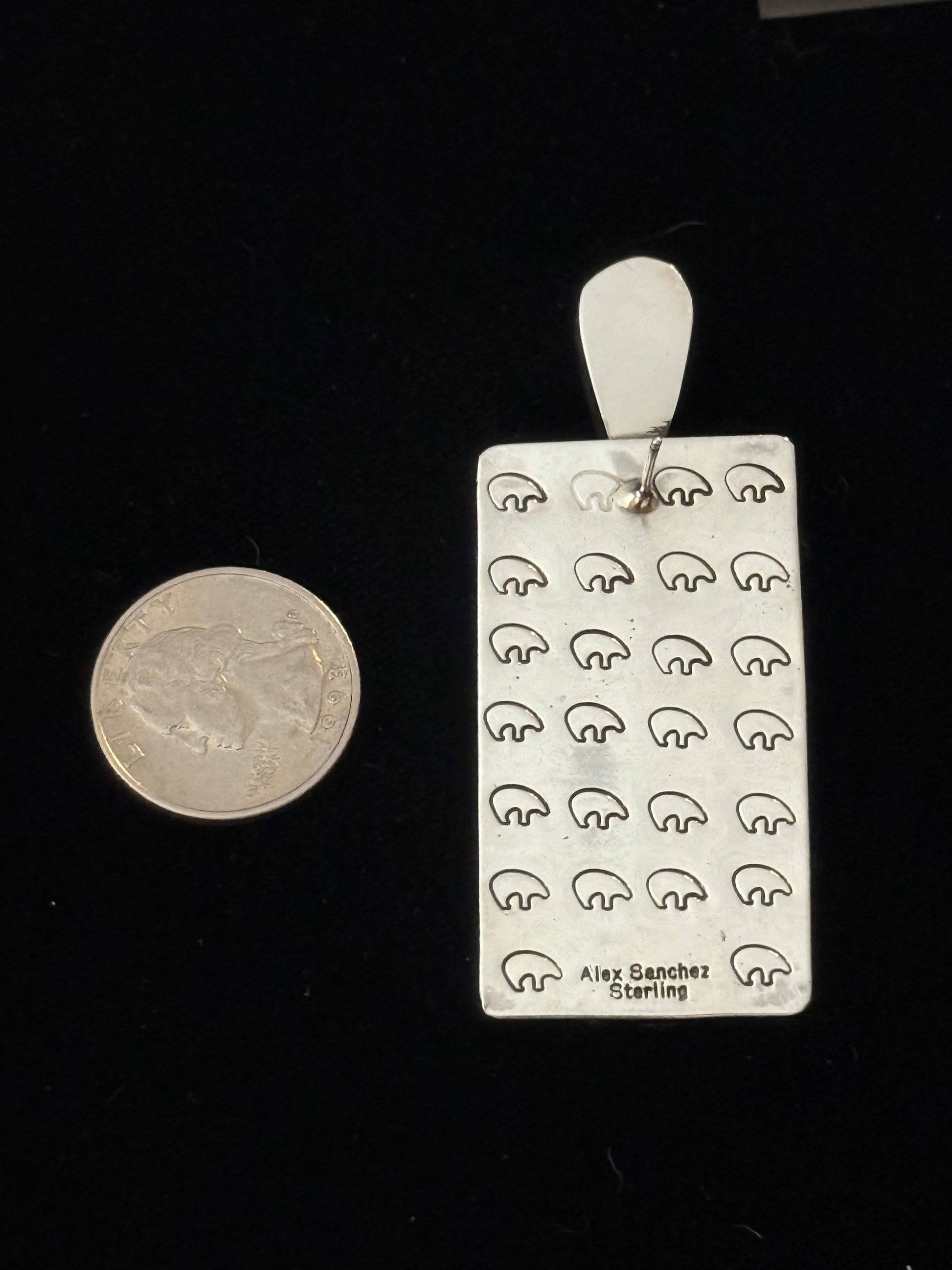 These substantial rectangle earrings by Navajo master craftsman Alex Sanchez combine premium sterling silver with high-grade turquoise in a design that commands attention. The reverse side reveals intricate hand-stamping—a signature detail that speaks to authentic artisanal work. Natural turquoise variations make each pair one-of-a-kind, while the generous proportions deliver the bold southwestern aesthetic serious collectors seek. Own a piece of genuine Native American heritage crafted with uncompromising quality.
