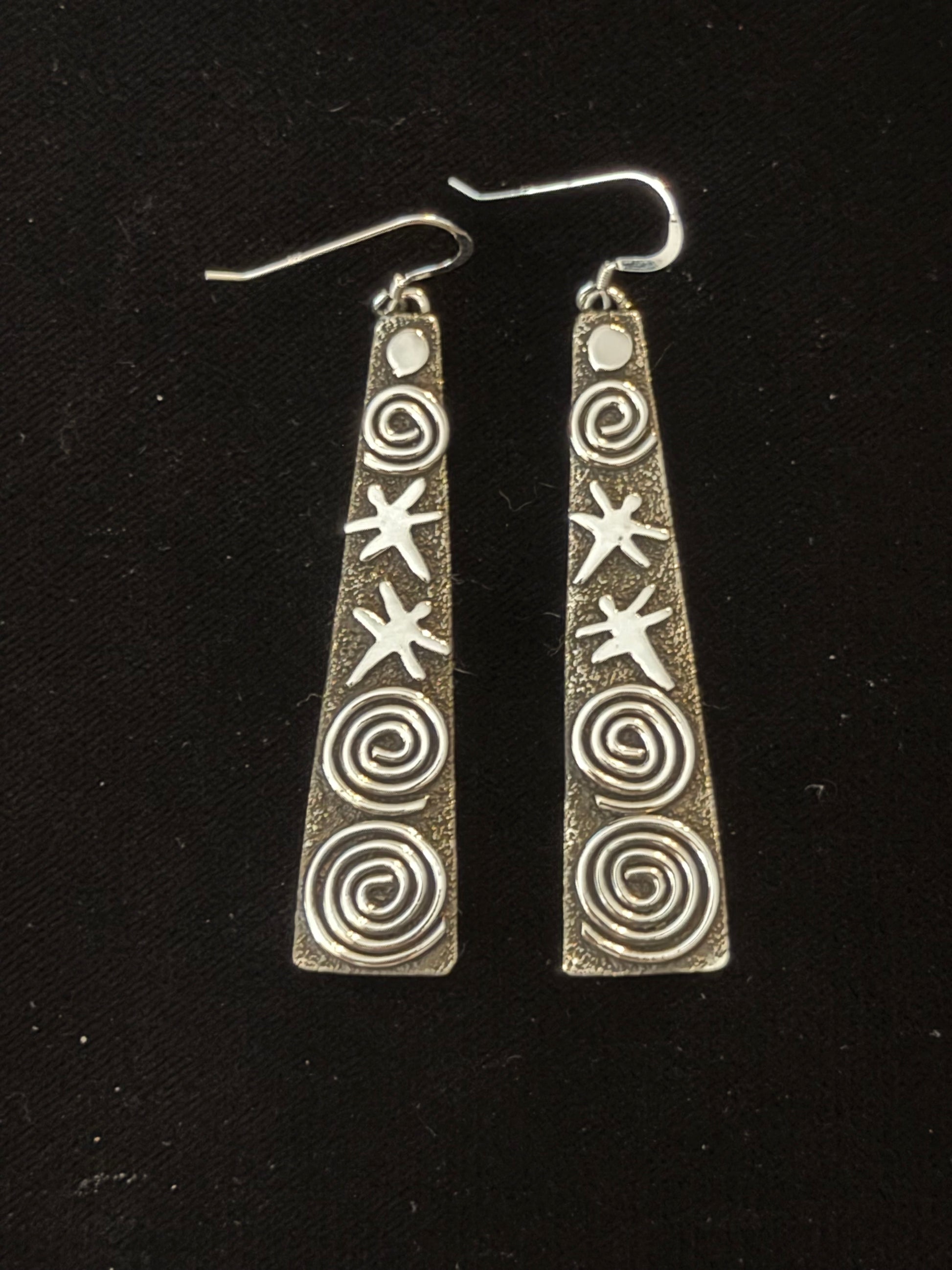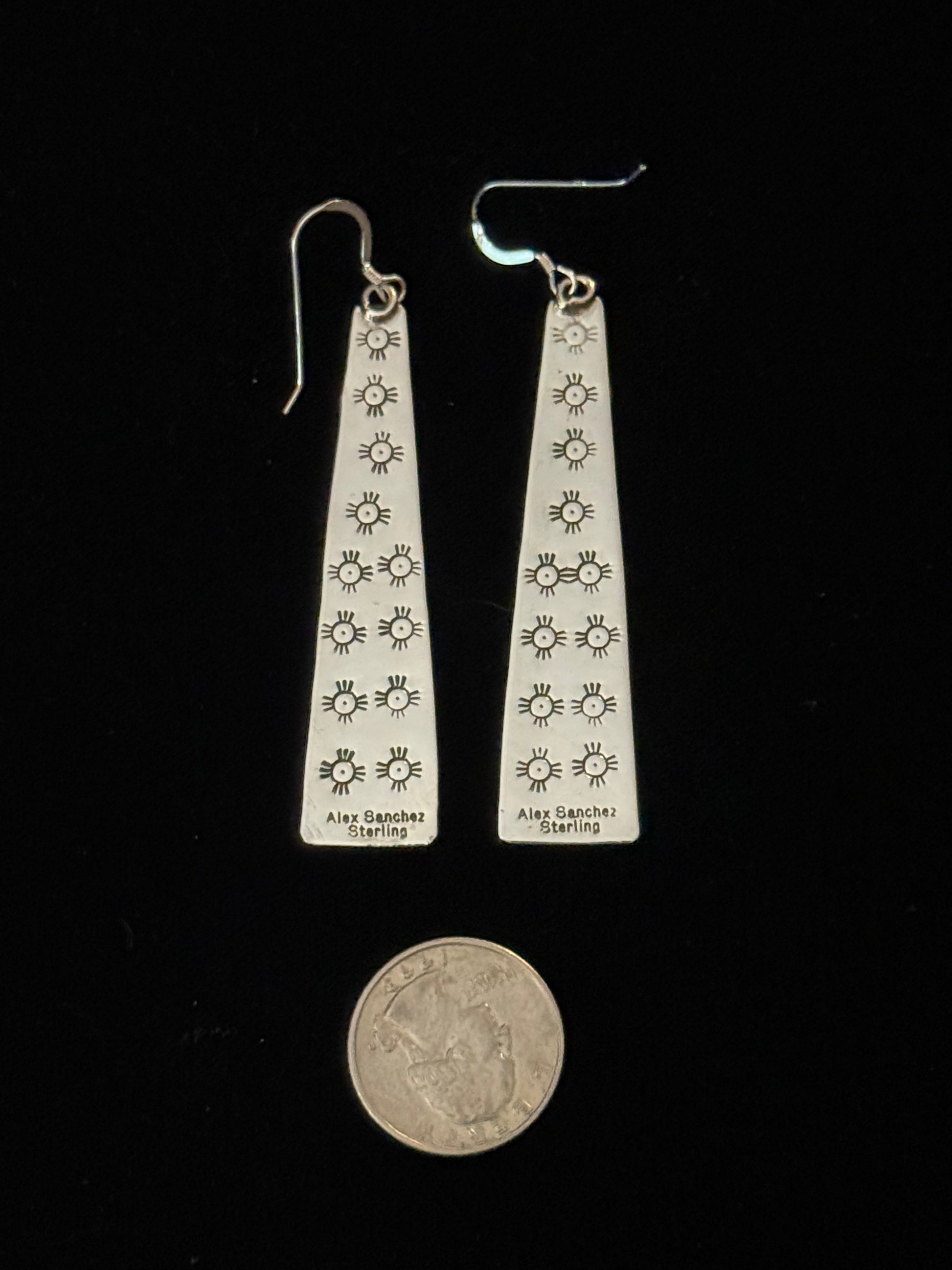 Striking three-inch sterling silver earrings showcasing traditional bear and arrow petroglyphs, expertly crafted by renowned Navajo artisan Alex Sanchez. Each piece captures the spirit of ancestral symbolism while offering the lasting quality and refined beauty that defines authentic Native American jewelry.