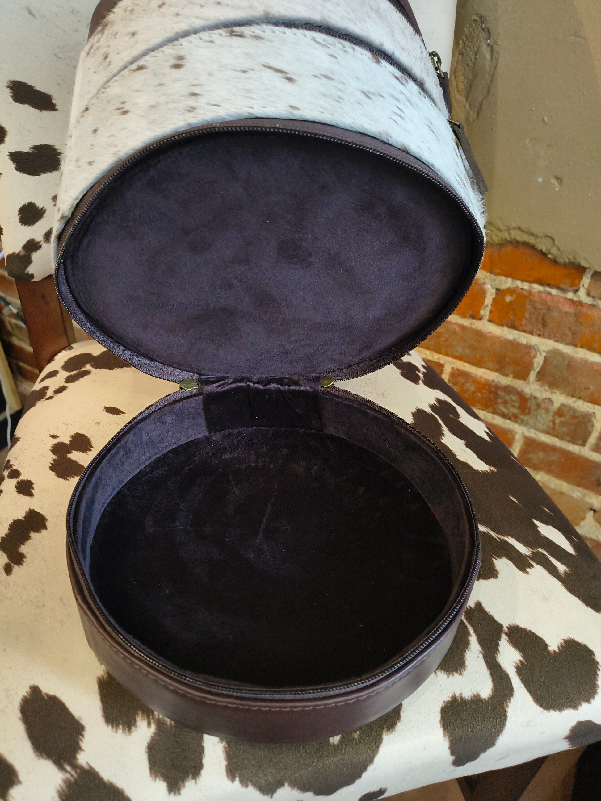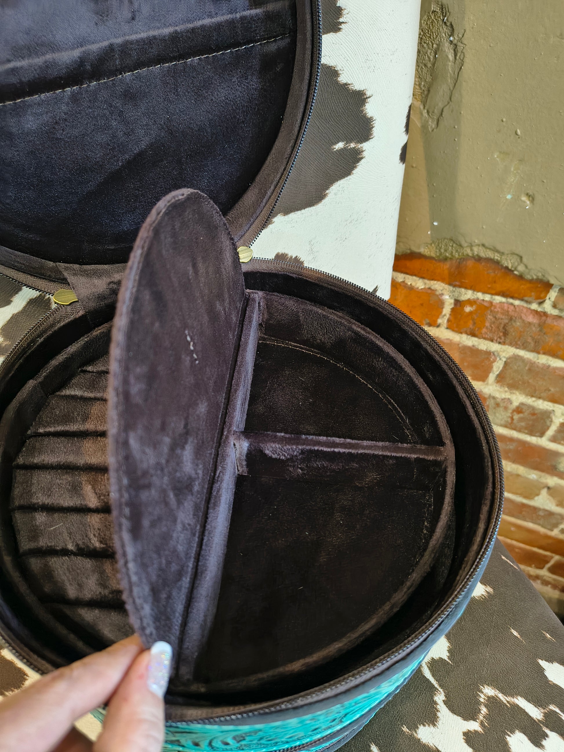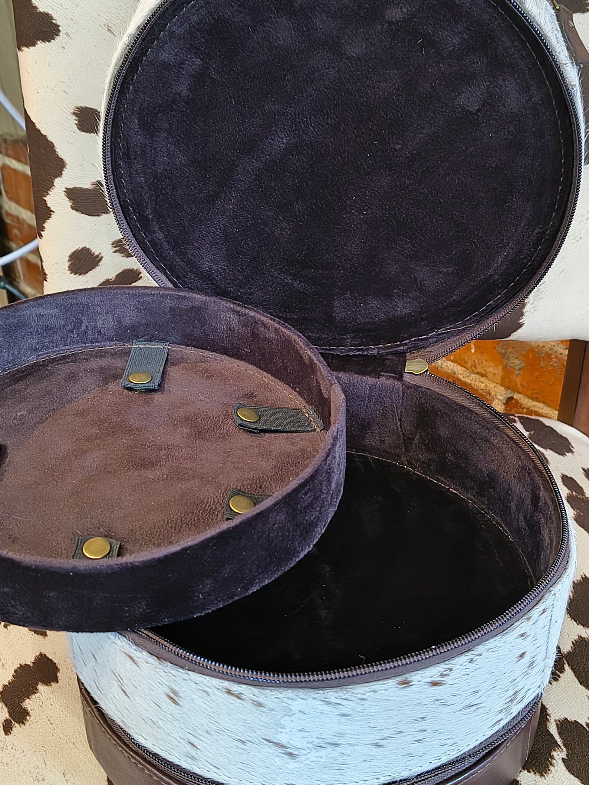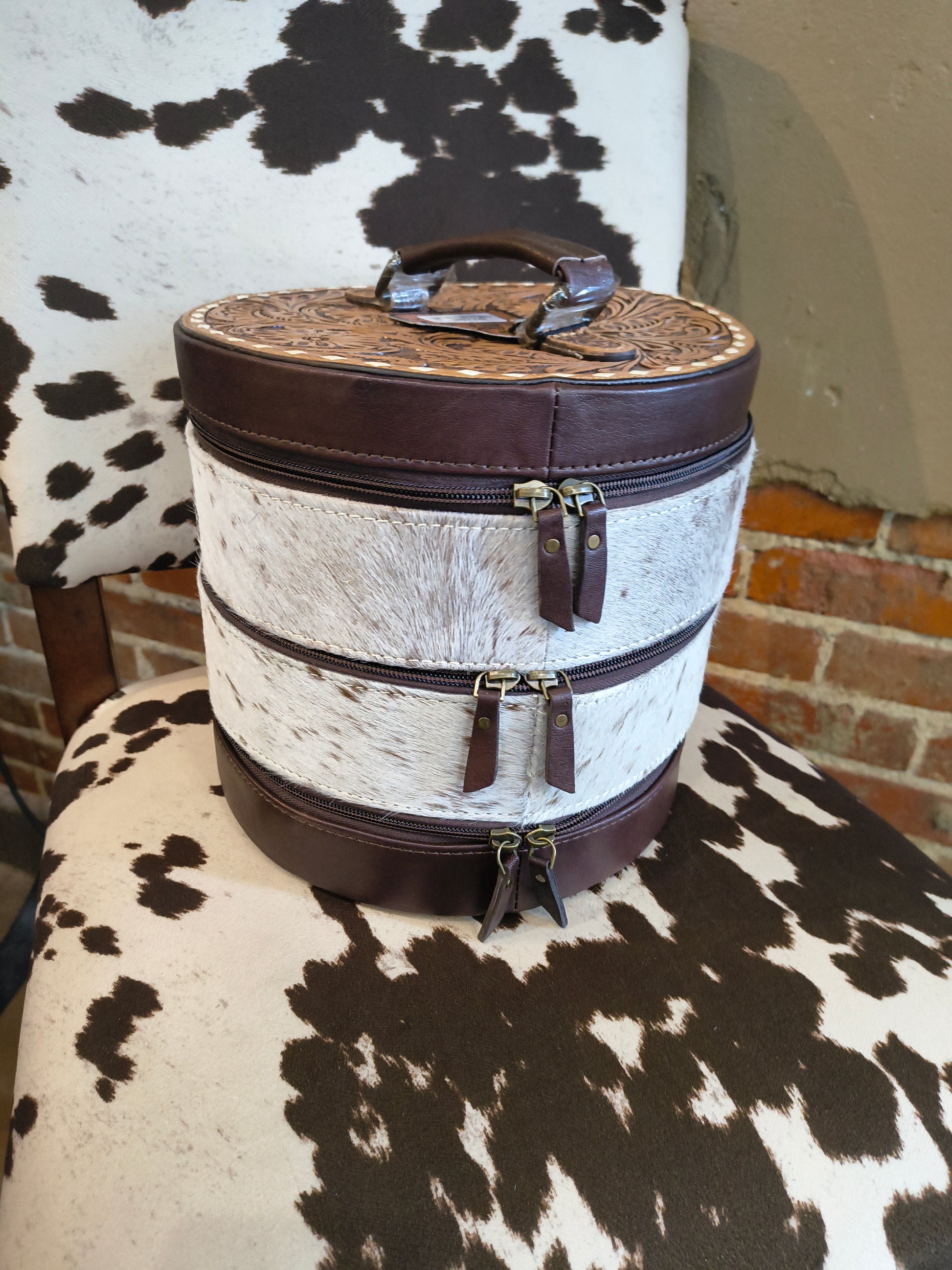 Elevate your jewelry storage with this stunning Triple Stack Round Leather Jewelry Box, meticulously hand tooled with authentic buck stitch detailing. This piece showcases traditional craftsmanship, combining rustic charm with refined functionality. The stacked design offers generous compartments to organize rings, necklaces, and delicate treasures while keeping them protected and beautifully displayed. Perfect for the discerning collector who appreciates quality artisanship and timeless style.