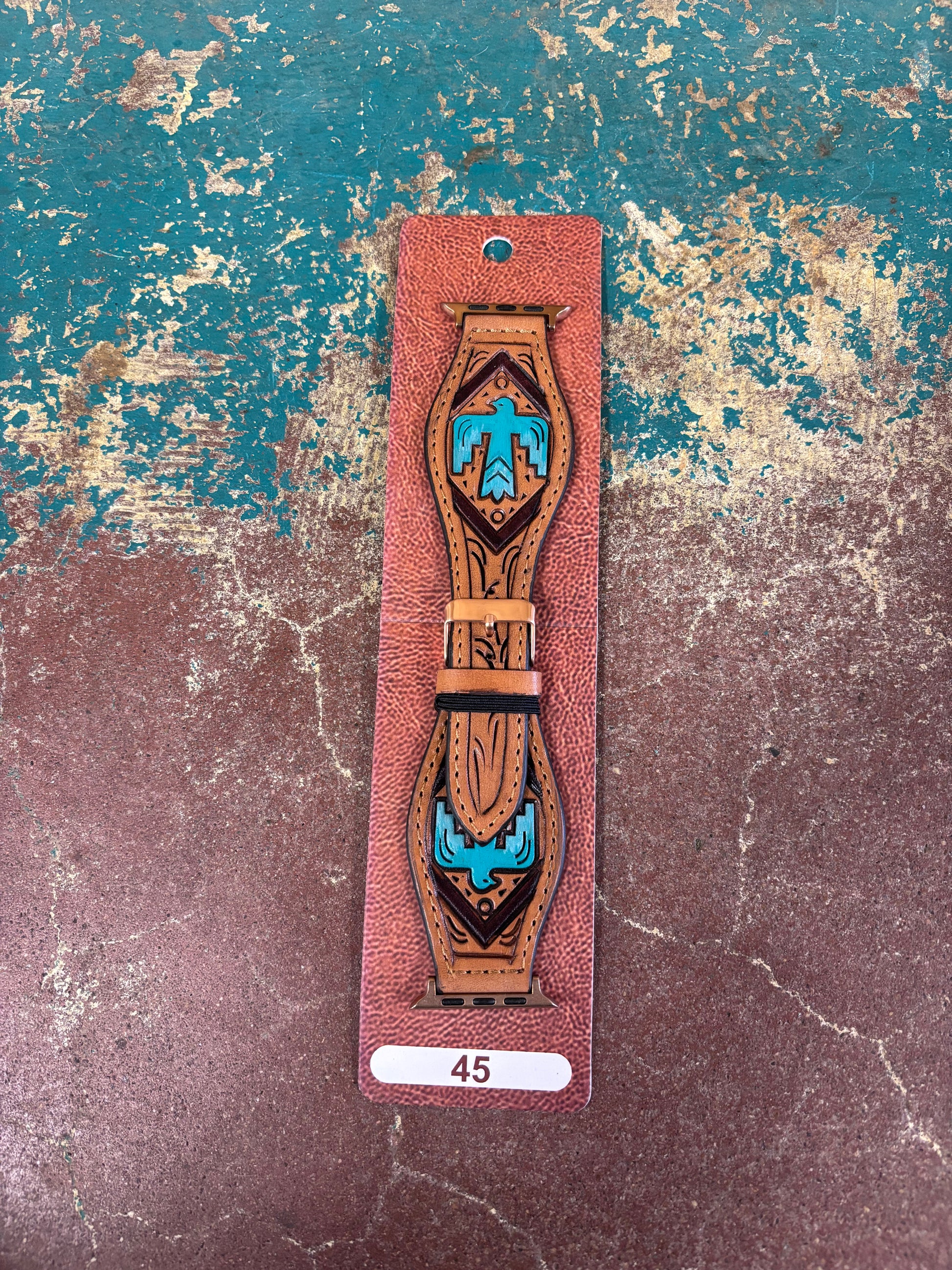Elevate your wrist with this striking watchband featuring authentic turquoise tooling set against a vibrant brown leather background. Measuring 7 inches long and 2 inches wide, it's crafted to complement any timepiece while showcasing traditional artisanal detail. The bold contrast between rich brown and eye-catching turquoise creates a statement piece that blends Southwestern heritage with everyday style. Perfect for those who appreciate handcrafted quality and distinctive design that stands out from mass-produced alternatives.