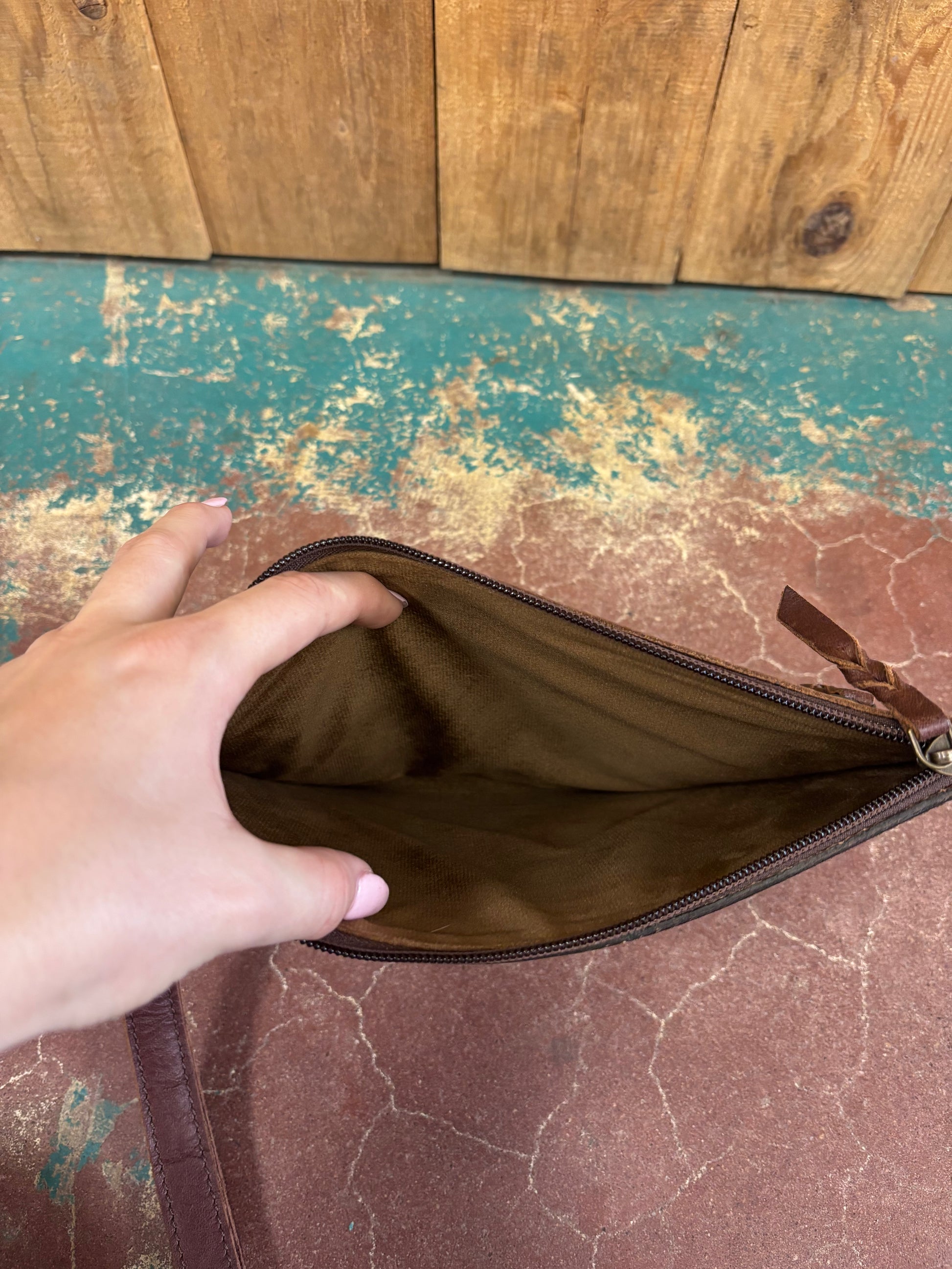 Elevate your everyday carry with this striking wristlet that blends Western flair with practical style. Crafted from rich brown leather, the front showcases intricate tooling accented by vibrant turquoise lightning bolts that command attention. Measuring 8 inches tall and 11 inches wide, it's the perfect size for essentials. Inside, soft light brown velvet provides a luxurious feel, while the detachable wrist strap offers versatility for any occasion. An extra back zipper pocket keeps valuables secure and organized. Whether you're heading to the rodeo or a night out, this wristlet delivers bold design with functional storage you'll reach for again and again.