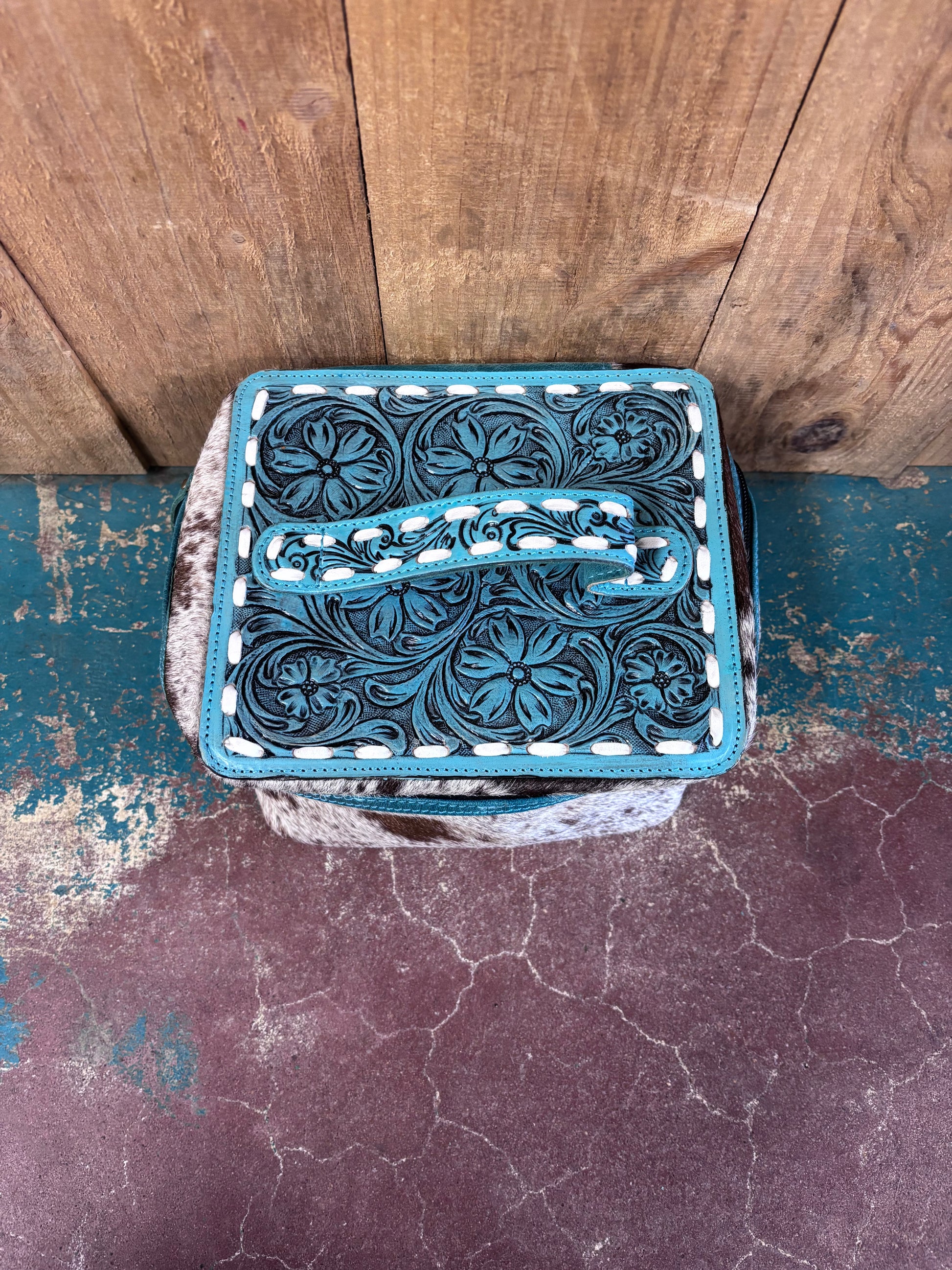Turquoise Tooled Brown And White Cowhide Leather Make Up Bag