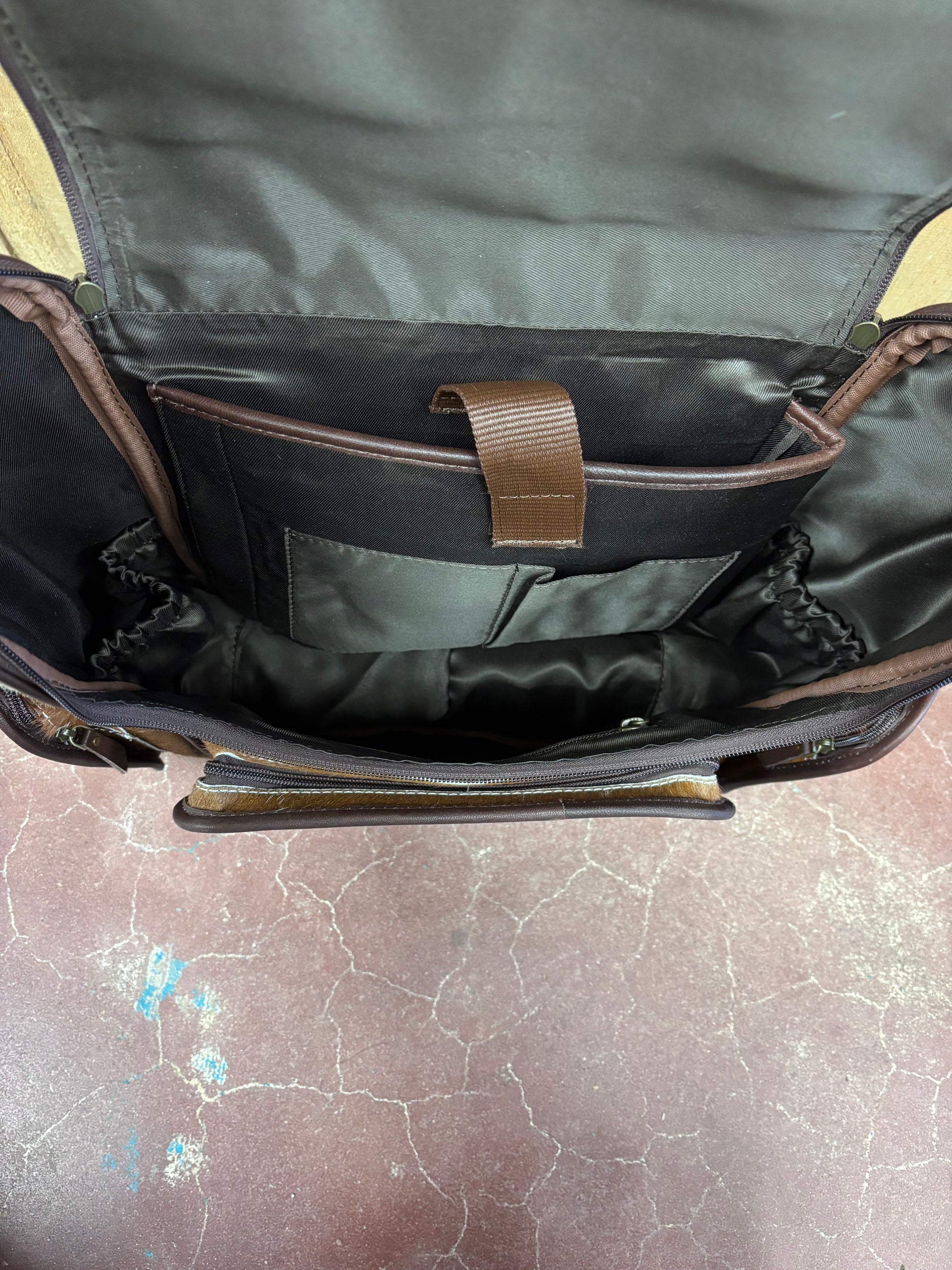 Brown and White Cowhide Flower Tooled Leather Backpack Crafted from genuine brown and white cowhide, this 14" tall by 19" wide backpack combines rugged durability with artisanal detail. Hand-tooled flower designs grace the side pockets, top pocket, and front small pocket, finished with traditional buck stitching along every edge. Six exterior pockets—including a dedicated back pocket—keep essentials within reach, while the interior features four side pockets plus a secure zippered pocket and spacious back pocket with Velcro strap closure. Built for those who demand both style and substance, this leather backpack ages beautifully and handles daily wear with authentic character. *Cowhide may vary*