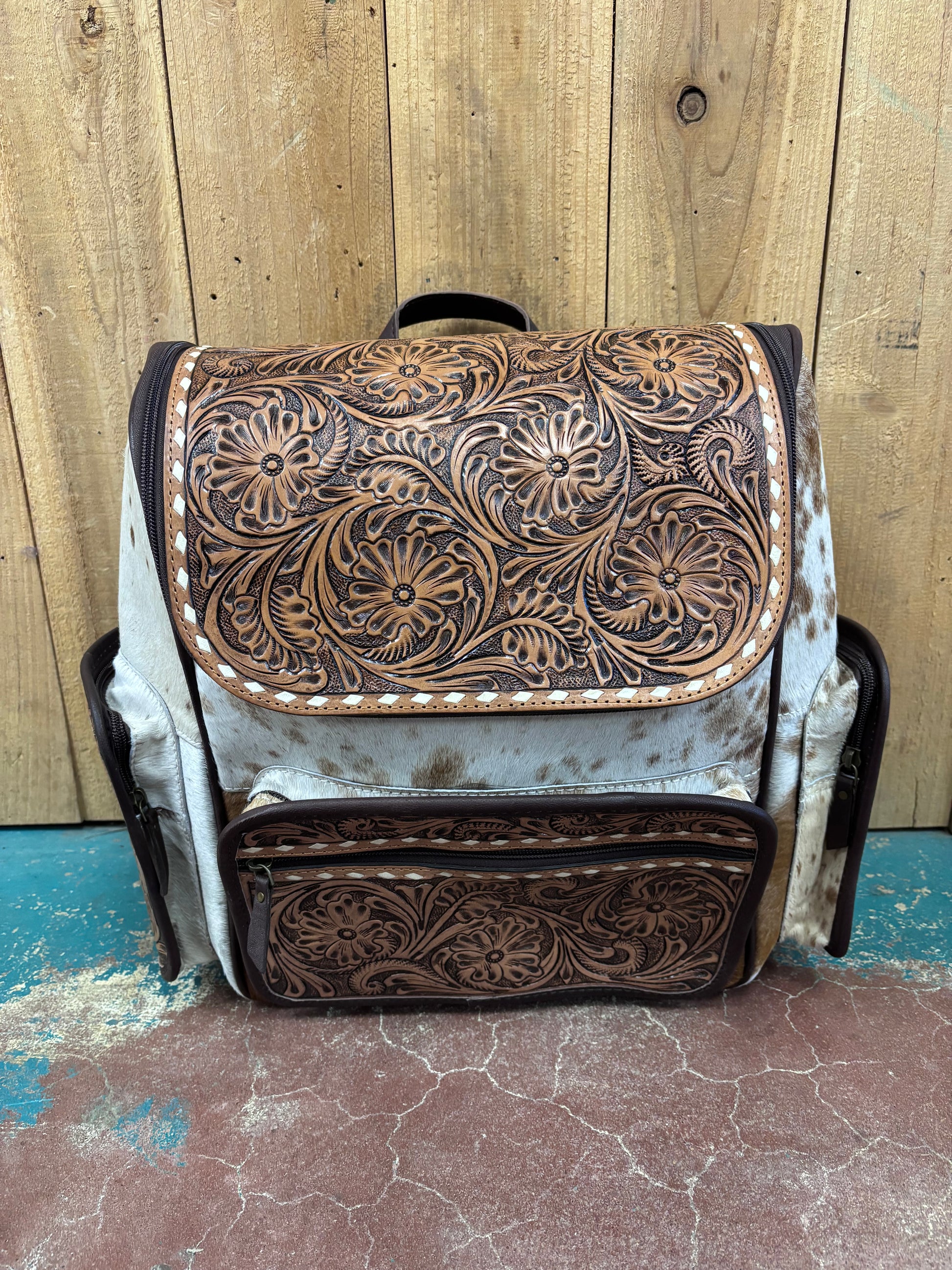 Version 2 Brown and White Cowhide Flower Tooled Leather Backpack